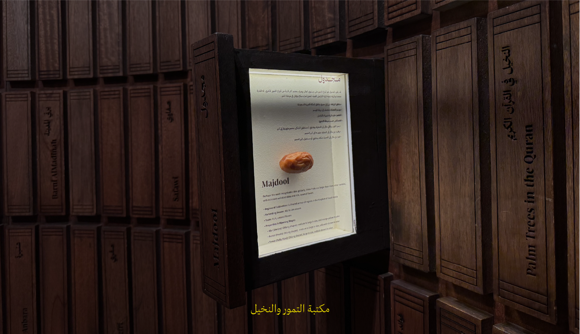 بعدها دخلت مكتبة التمور والنخيل، تجربة توضح لك أنواع التمور، وأسماءها، ووش يتميز فيه كل نوع، بأسلوب مختلف في كل مرة. تحس أنك داخل مكتبة بس المعلومات (3D).📚