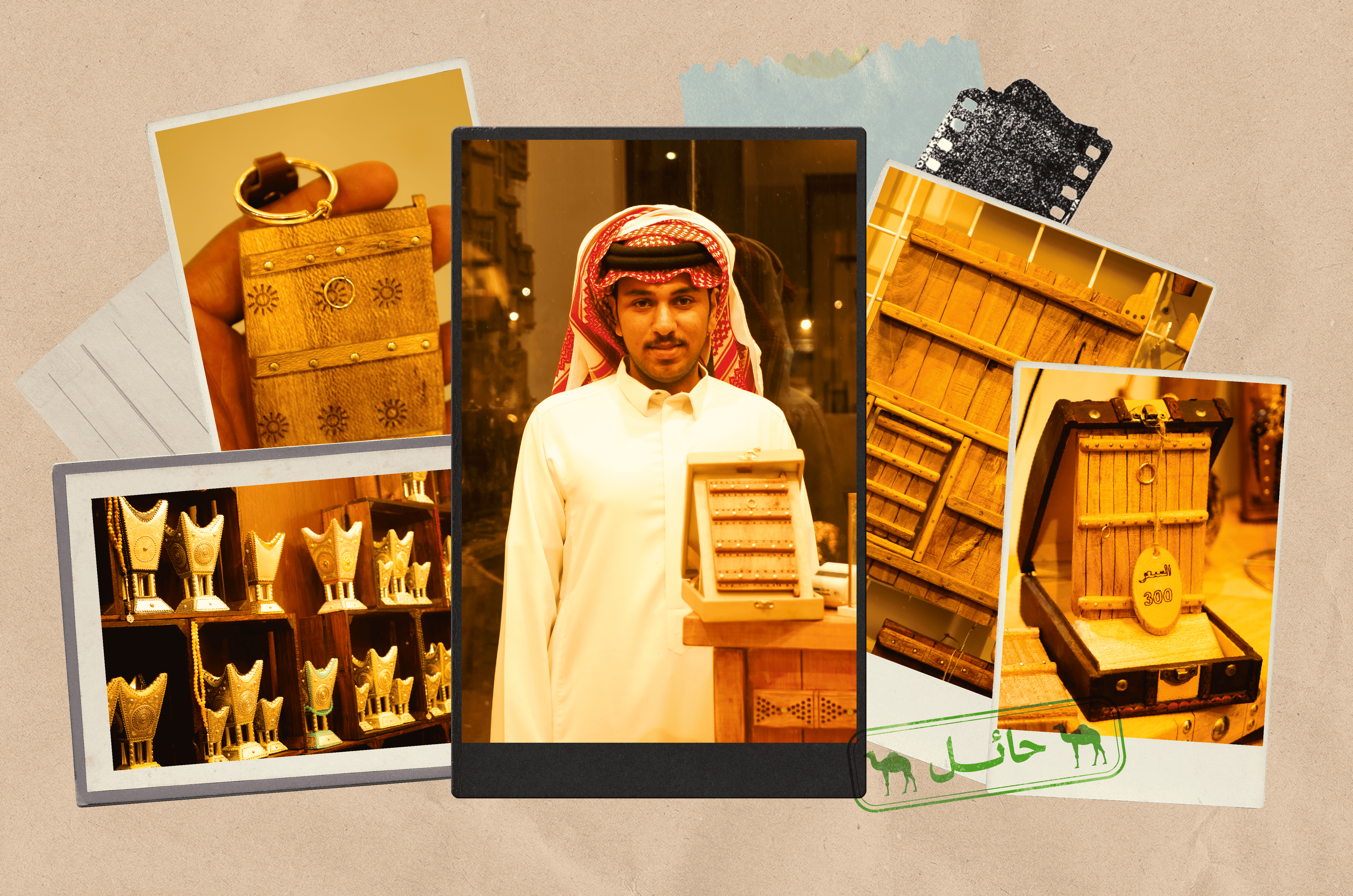 عبدالعزيز شاب يشتغل بمحل والده، وهم متوارثين المصنوعات الخشبية من جَدهم.