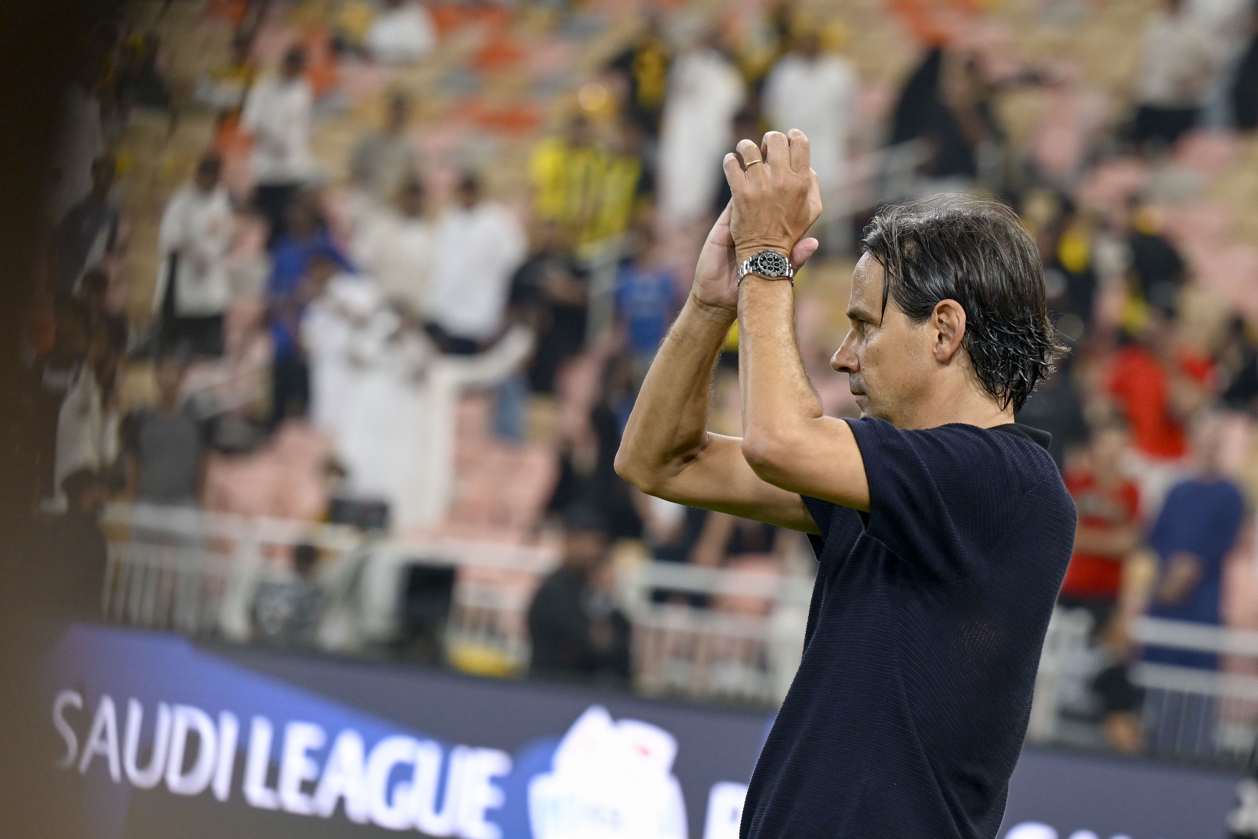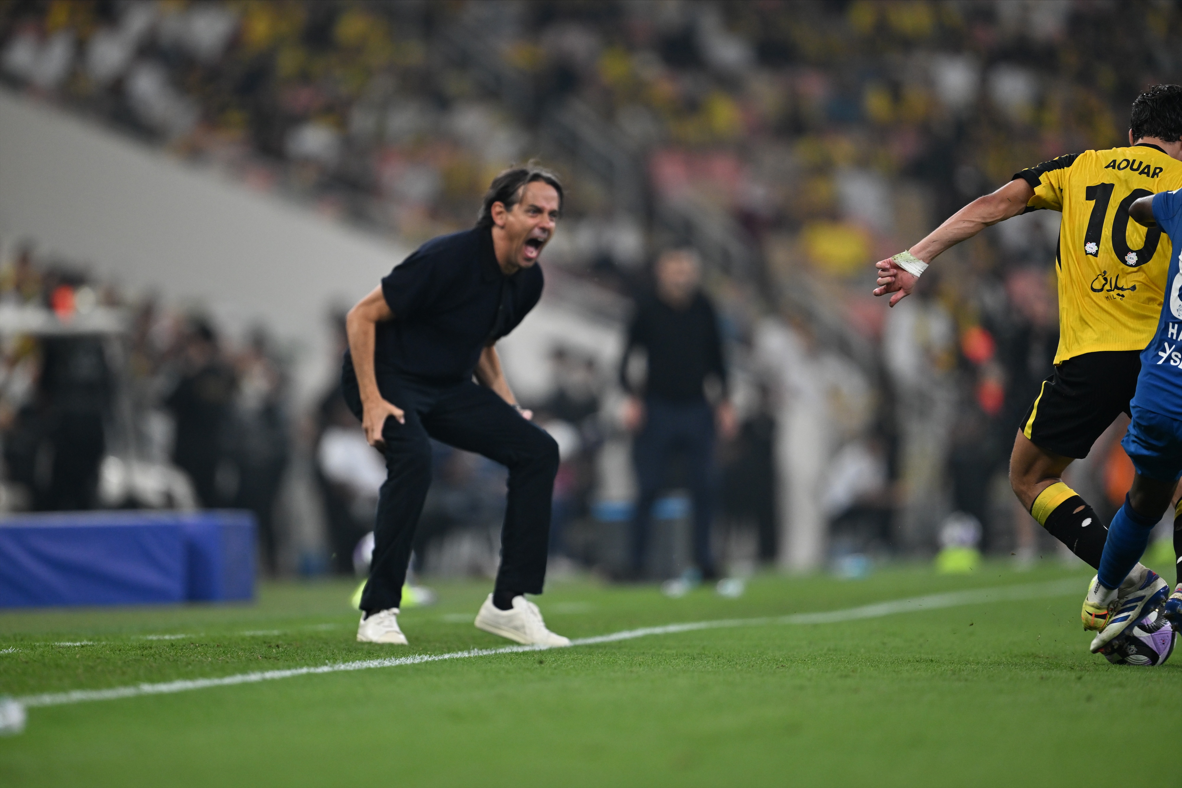 يدخل سيموني إنزاقي مدرب فريق الهلال إلى قاعة المؤتمرات الصحفية بكل ثقة وبفرحة واضحة بعد تحقيق الفوز، مستقبِلًا الأسئلة بكل ابتسامة وهدوء.