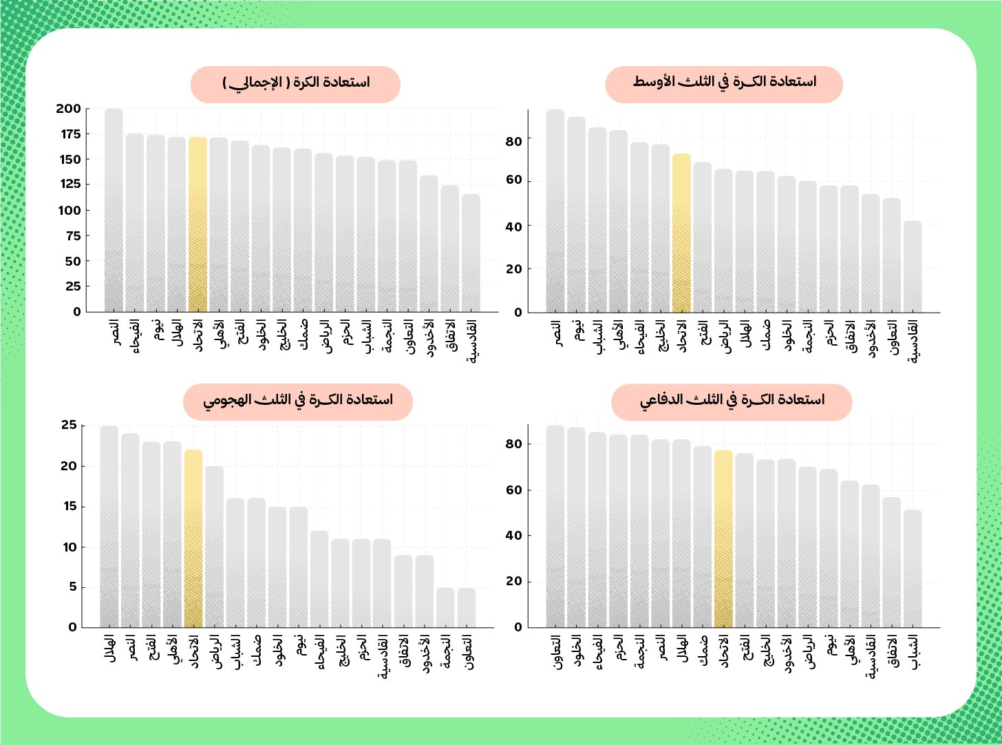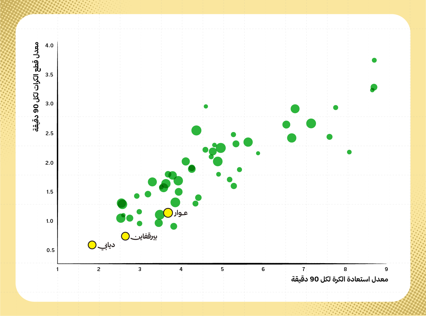 إضافةً لذلك؛ يقبع ثلاثي الوسط خلف بنزيما: عوار وديابي وبيرقفاين في مراكز متأخرة جدًّا في الدوري مقارنةً ببقية لاعبي الوسط المهاجمين من ناحية اعتراض الكرة واستعادتها. ويوضّح هذا الأمر ضعف قدرة الفريق على استعادة الكرة في مناطق متقدمة، وربما يفسّر ميل بلان للضغط المتوسط.