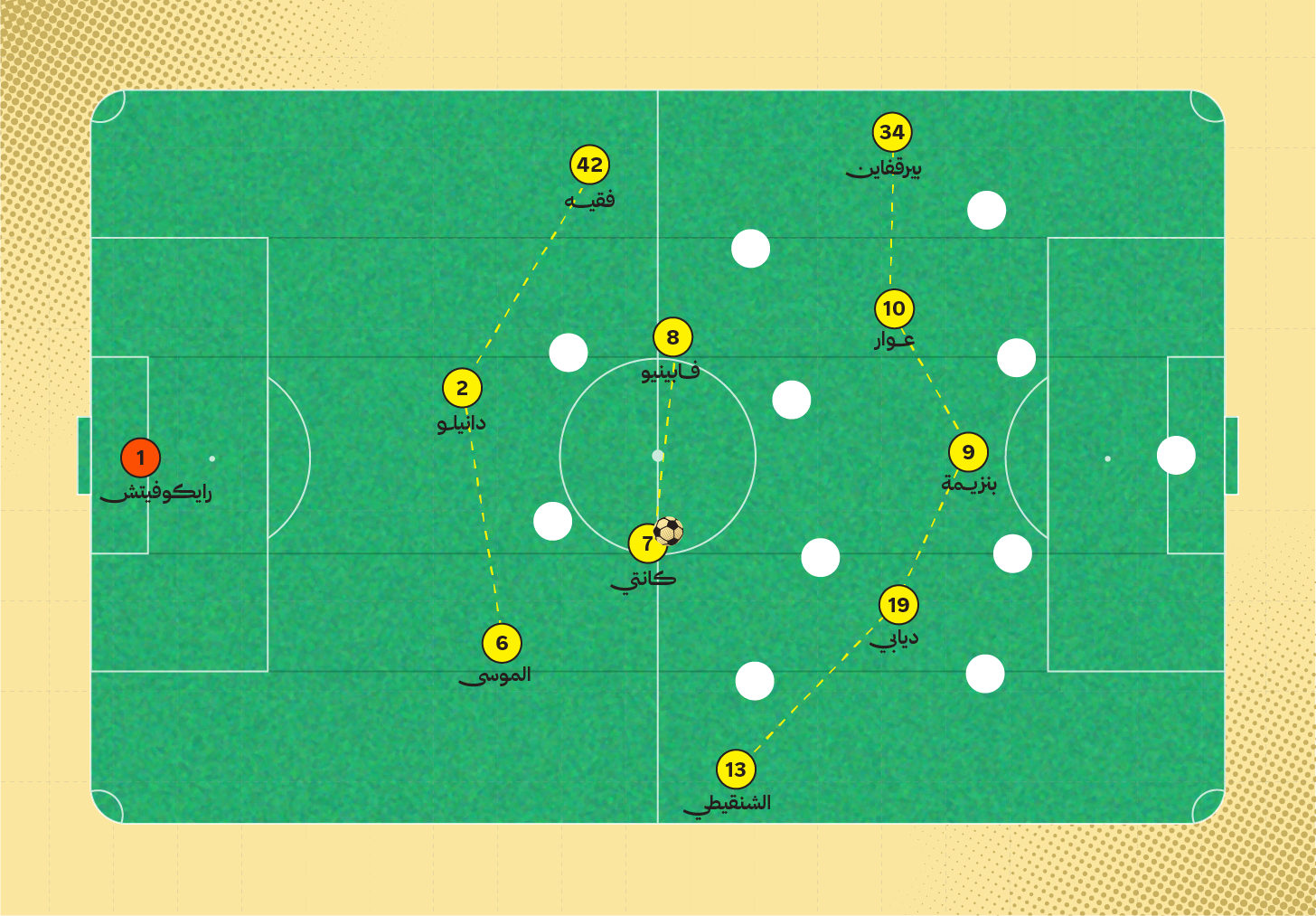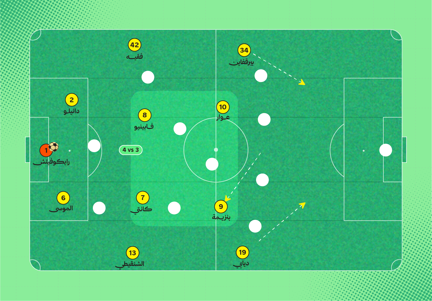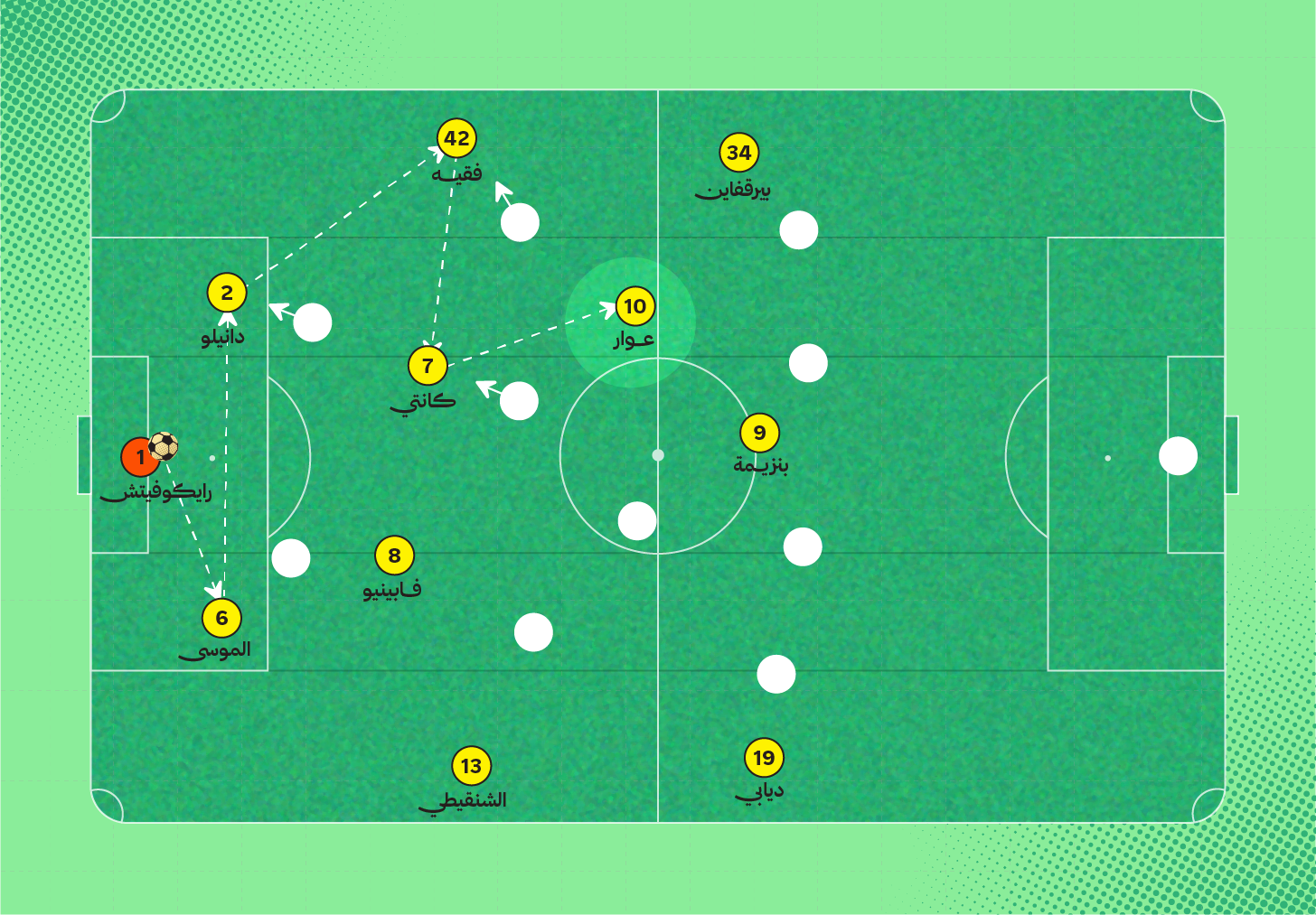 ومع مرونة كونسيساو التي تحدثنا عنها، فقد يحافظ على الشكل السابق ولكن عبر استغلال قدرة بنزيما على النزول بين الخطوط مع إبقاء الجناحين في عرض الملعب لاستغلال سرعتهم، وهو ما لم يستفد منه بلان كثيرًا -من وجهة نظري- إلا في بعض الفترات القليلة. فرغم الظهور الممتاز لبيرقفاين وديابي من الناحية الرقمية، ففي كثير من الأحيان يبحثان عن تمريرات أكثر سرعة، ولكن تفضيل بلان للتدّرج البطيء يجعل فرصًا مثل هذه التمريرات أقل مما يطلبانه. وهو ما قد يُوفّره لهما كونسيساو بصورة أكبر خصوصًا عبر دانيلو الذي سبق أن لعب تحت قيادته في بورتو، حيث يمتلك قدرةً ممتازةً على التمرير الطويل.