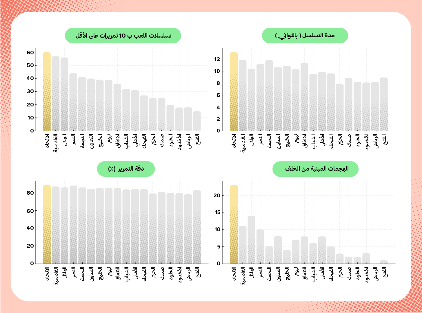 يعكس هذا المعدل قدرة الفريق في السيطرة على الكرة لفترات طويلة وبناء الهجوم عبر التمريرات الدقيقة المتأنية. فقد بلغ معدل استحواذه على الكرة 58.8% وبلغت دقة تمريرات الفريق الإجمالية 88.2%، وهي الأعلى في الدوري الموسم الماضي. ومع إضافة معدل «زمن التسلسل» (Sequence Time) نجد أن الاتحاد هو أعلى الفرق بـ12.3 ثانية لكل تسلسل. كما أنه يتمتع بثاني أفضل معدل للهجوم من خلال البناء 105. وهو ما يوضّح محاولة بلان بأن يكون التدرج بالكرة متأنيًا وواثقًا، لتصل الكرة للثلث الأخير في مناطق مناسبة لخصائص اللاعبين.