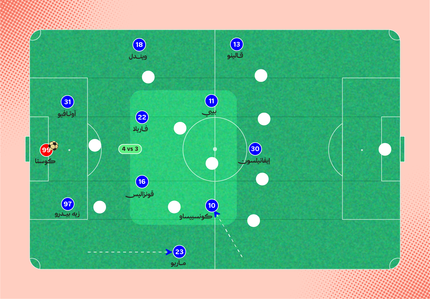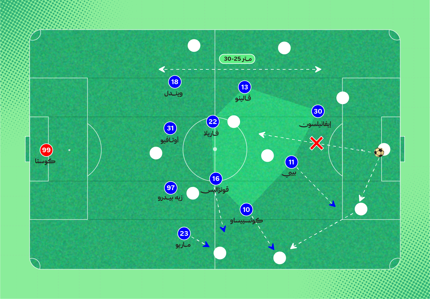 كان هدف كونسيساو من توسيع الملعب قدر المستطاع تفكيك ضغط الخصم وخلق مسارات تمرير عمودية أكثر في عمق الملعب، مع الاستعانة بدخول الجناح لخلق أفضلية عددية بين الخطوط.