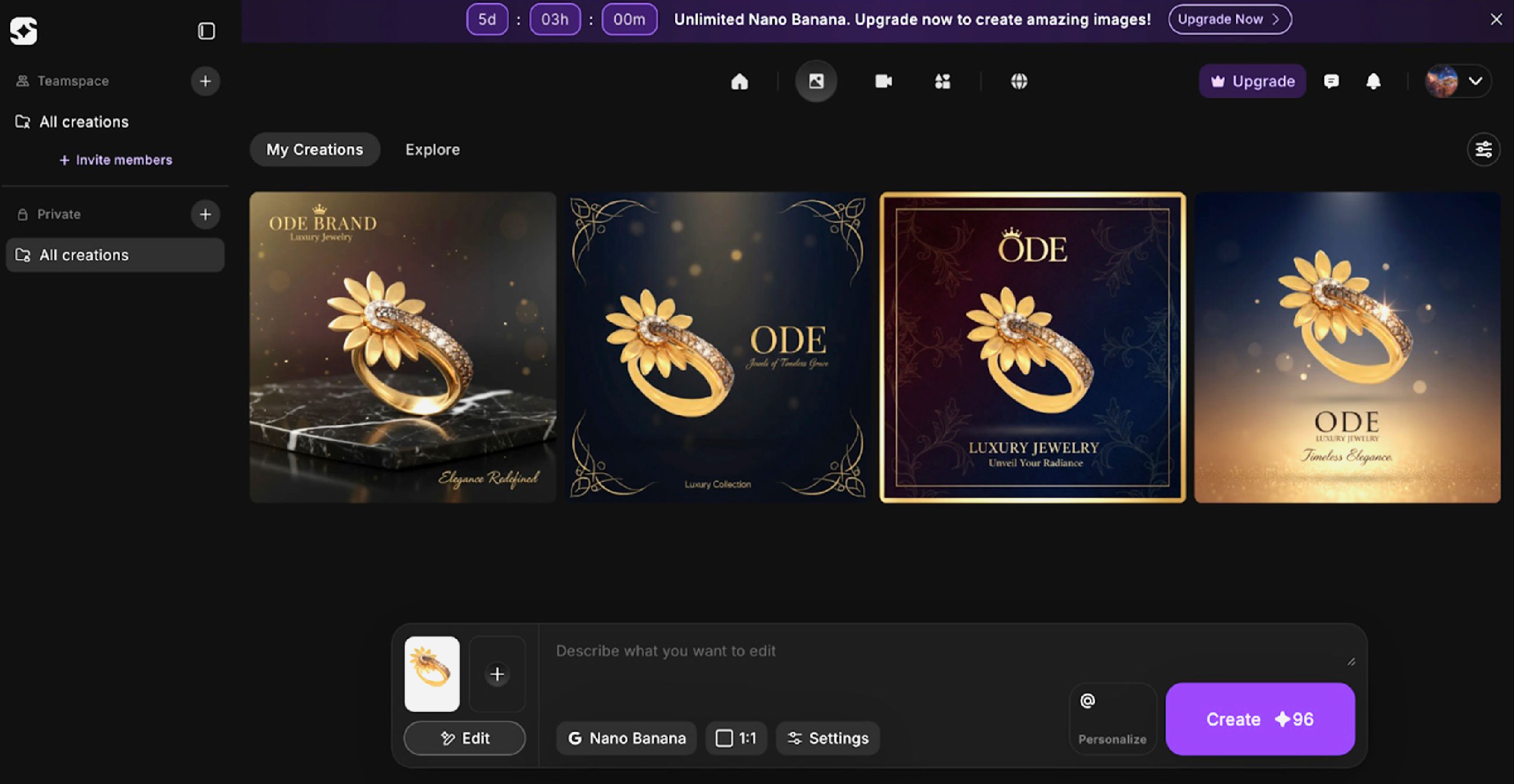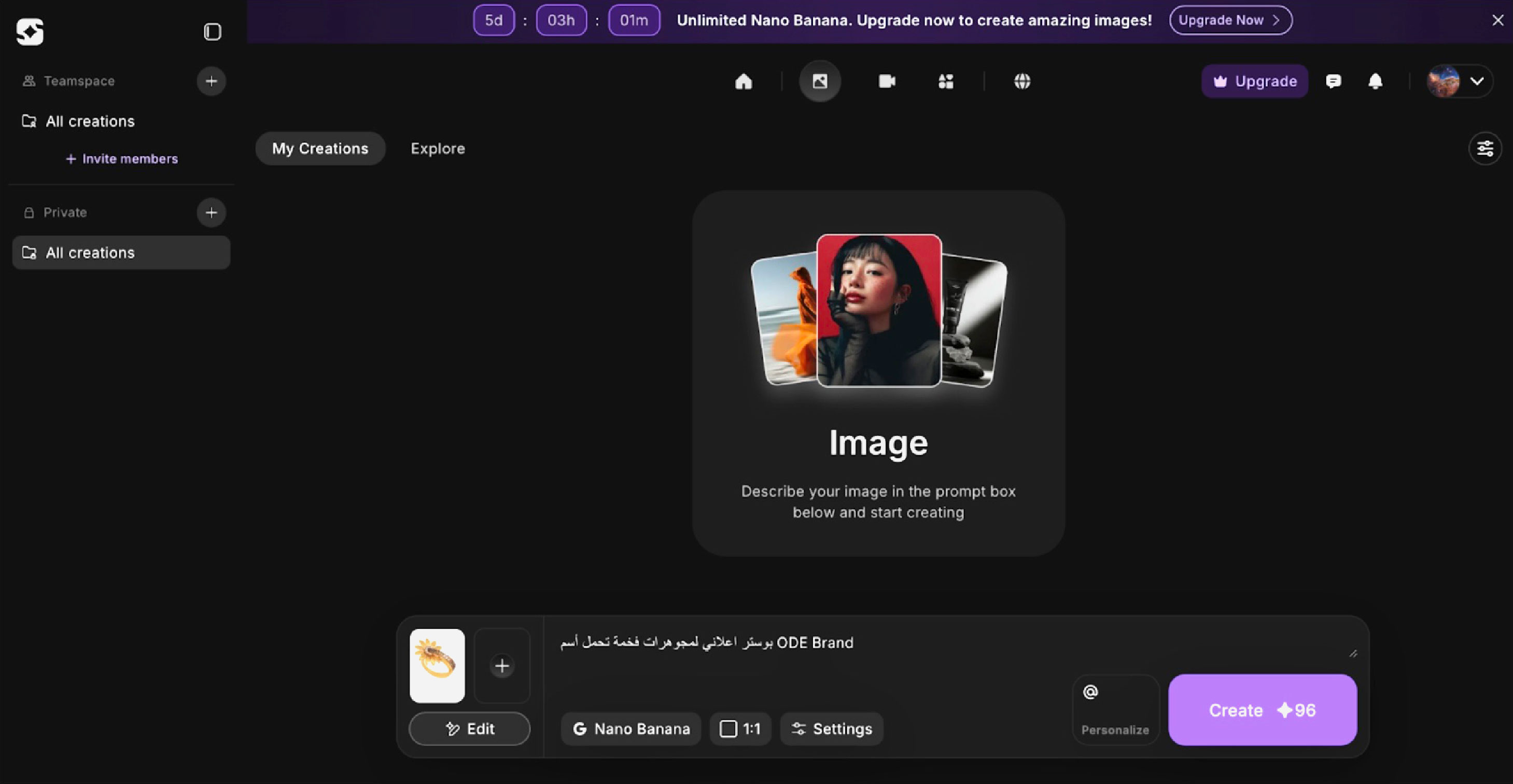 مثال: اطلب تصميم بوستر إعلاني لقطعة من المجوهرات، وأرفق صورة القطعة للحصول على نتيجة واقعية ومعبرة.