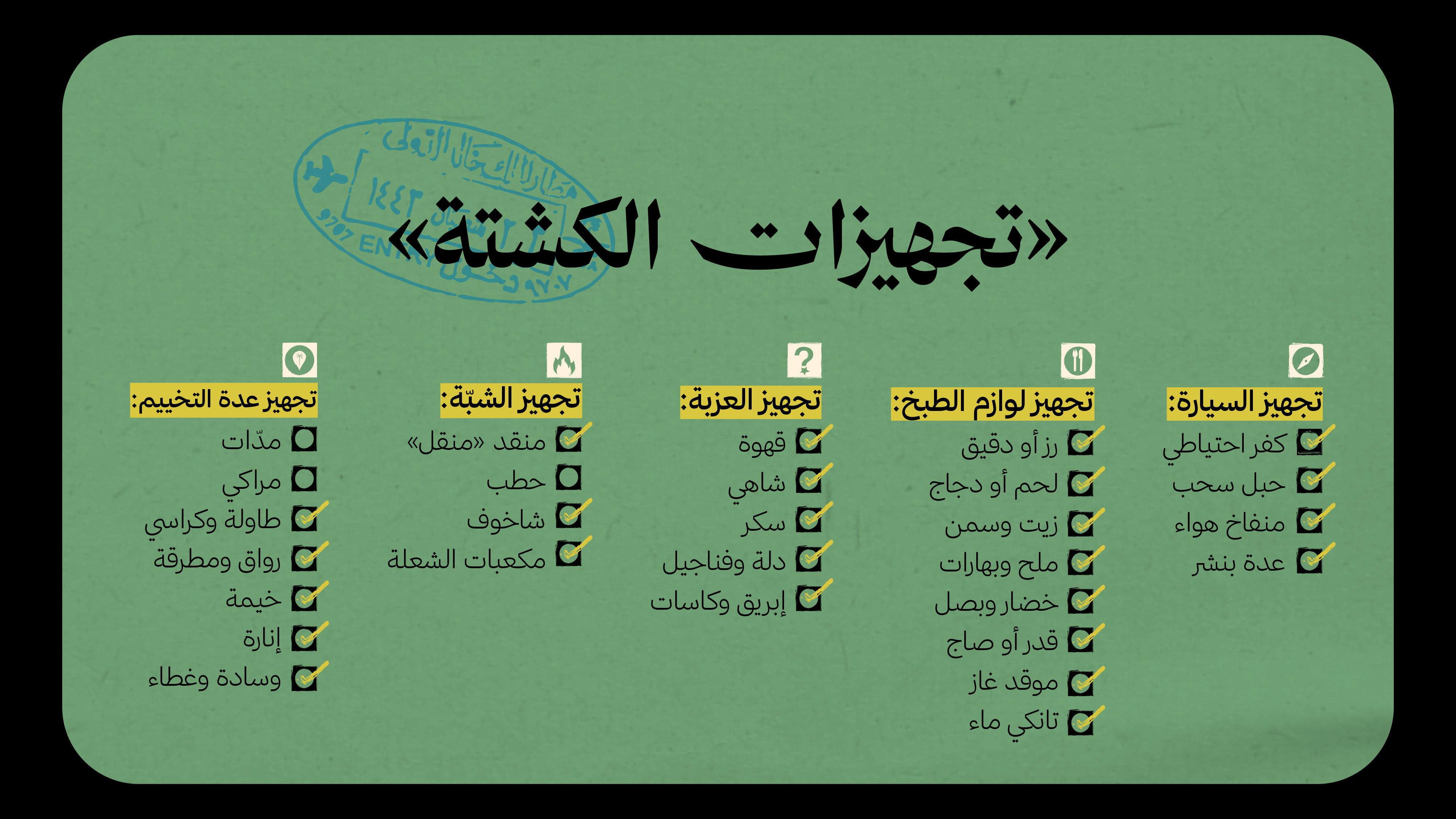 أثناء تجهيزنا لتجربة الأسبوع، كتبنا قائمة لأغلب احتياجات الكشتات ورحلات المبيت، اللي بتساعدك تجهز عزبتك، هالقائمة لك