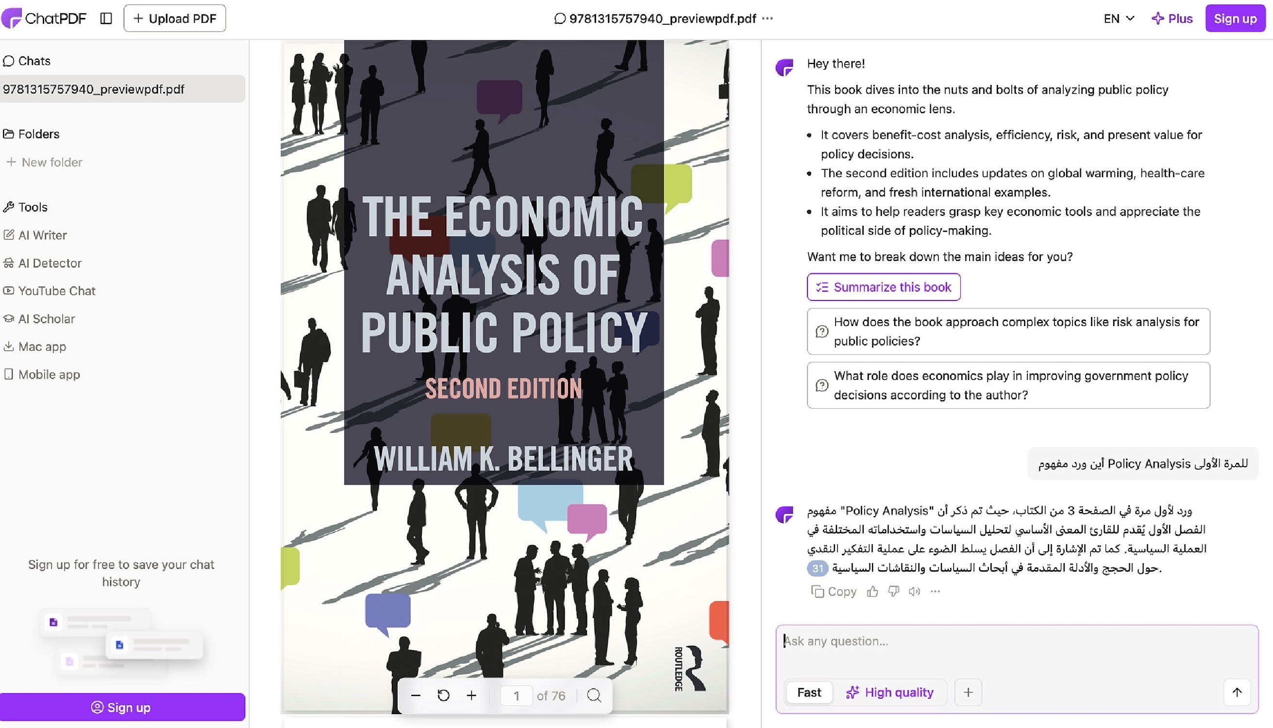 رفعت كتاب (The Economic analysis of Public Policy) على أداة (ChatPDF) وسألته:
