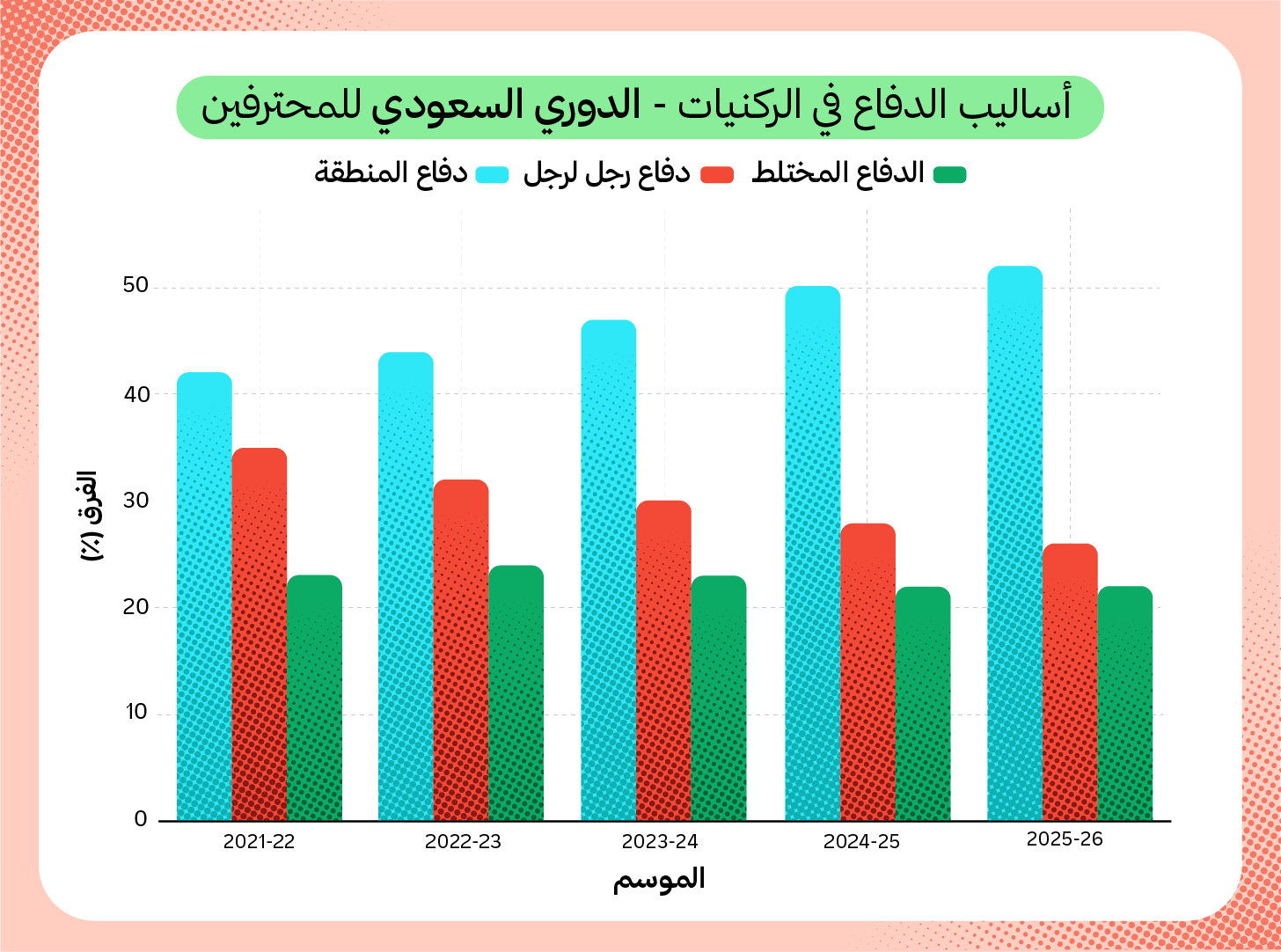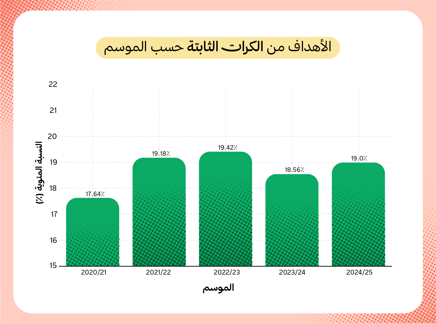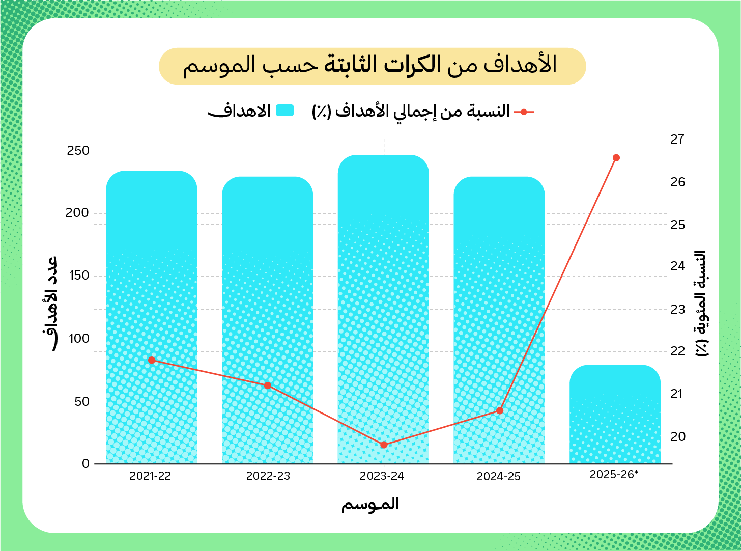 شهدت الكرات الثابتة في الدوري السعودي تطوّرًا ملحوظًَا خلال المواسم الخمسة السابقة، حيث ارتفعت نسبة الأهداف من خلالها إلى أكثر من 31% في الموسمين الماضيين، مع وضوح ارتفاع عدد الأهداف عبرها من 195 إلى 286 وذلك بالتأكيد بالنظر إلى زيادة عدد الفرق من 16 إلى 18.
