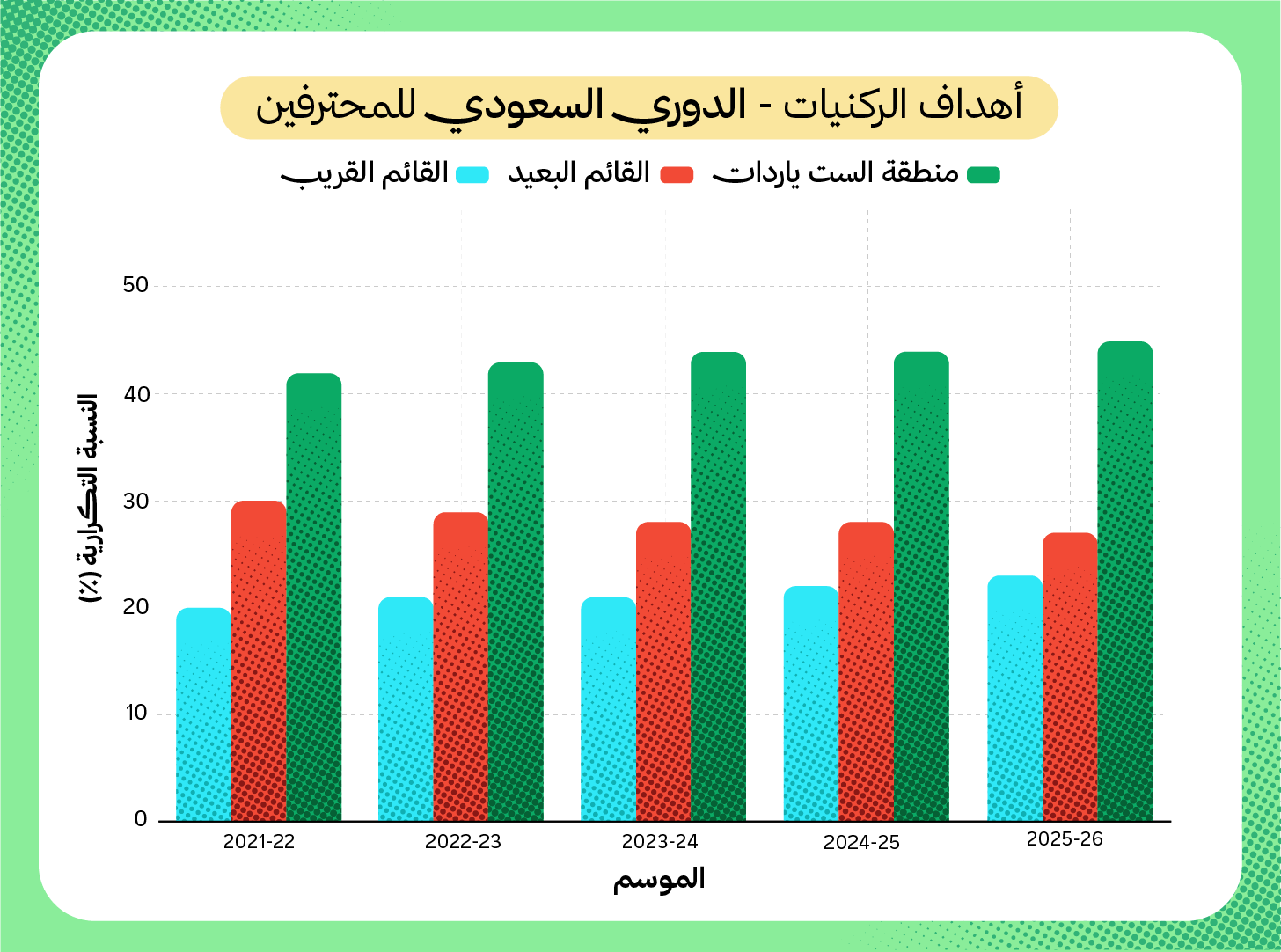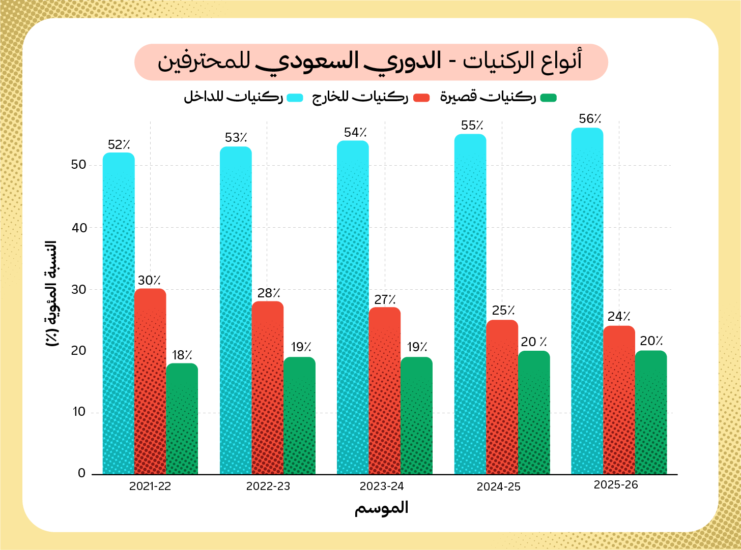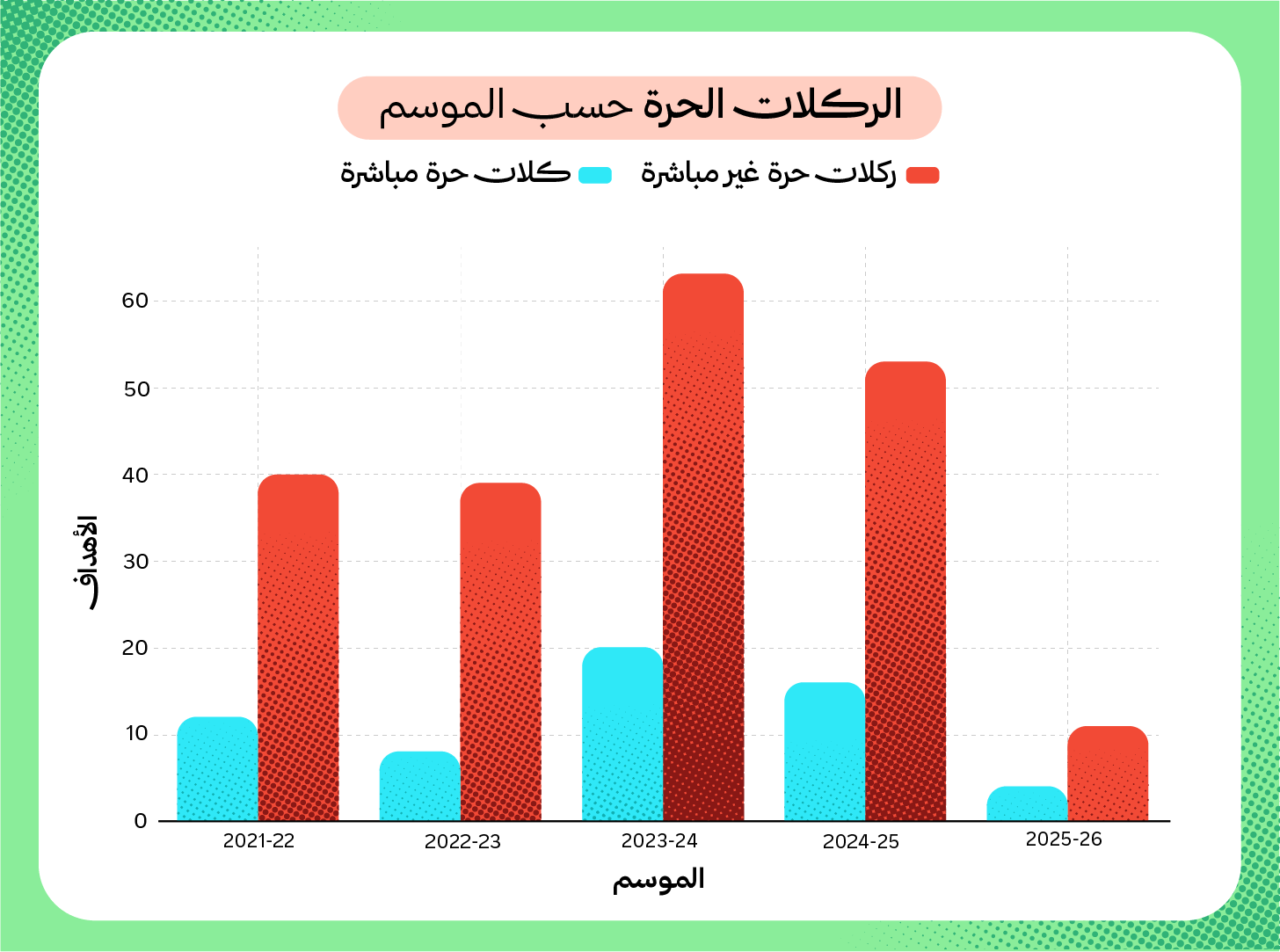 لو تتبعنا مسار تطور الركلات الحرة في الدوري السعودي خلال آخر خمسة مواسم، سنجد ارتفاعًا ملحوظًا للأهداف من الركلات الحرة غير المباشرة والتي تشكّل أكثر من 77% من إجمالي الأهداف المسجلة من الركلات الحرة.