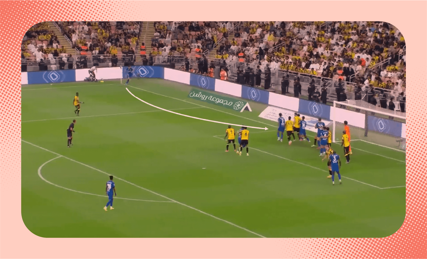 هدف الهلال الأول في مرمى الاتحاد كان نموذجًا لتنفيذ الكرات الركنية للداخل. فقد نفّذ روبن نيفيز الكرة بكل قوة نحو المرمى، وأجبر لاعب الاتحاد على الخطأ وتسجيل الكرة في مرماه؛ مع تركيز الهلال على وضع أكبر عدد ممكن من اللاعبين على القائم القريب «لمشاهدة اللقطة كاملة».