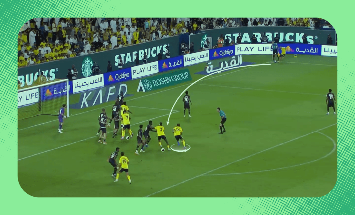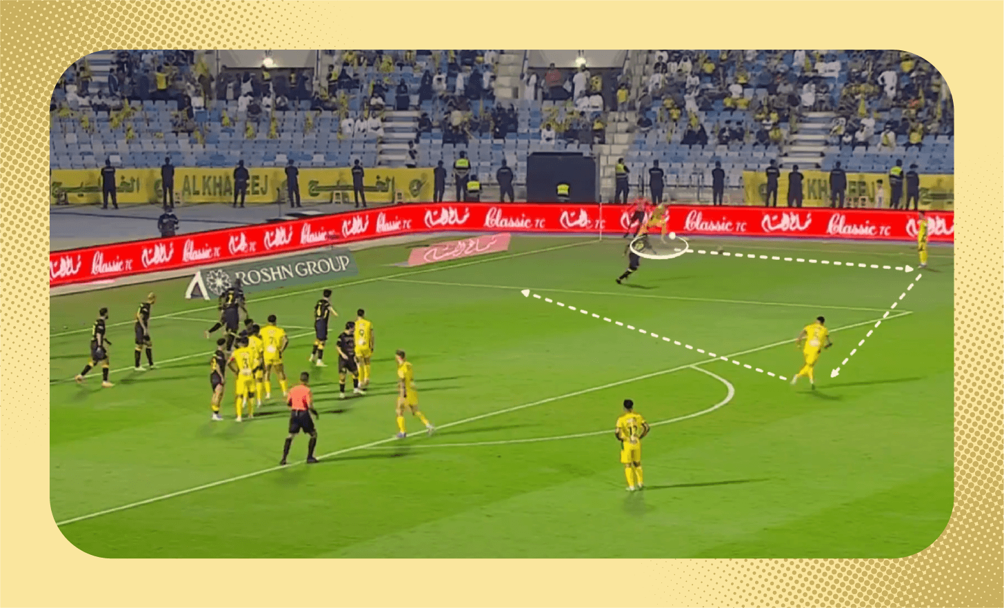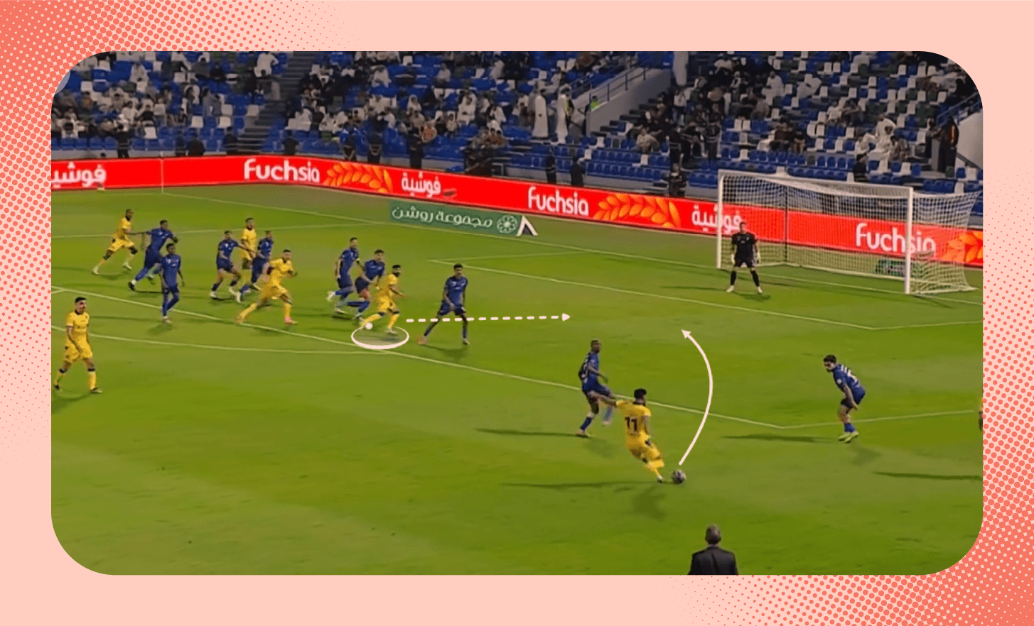 ثم مرّر نونيز الكرة برأسه نحو ليوناردو وسافتش ولاحظ عدم وجود أي ضغط على الثنائي، مع تحرك تمبكتي في الزاوية البعيدة في حال تجاوزت الكرة نونيز أو كوليبالي.
