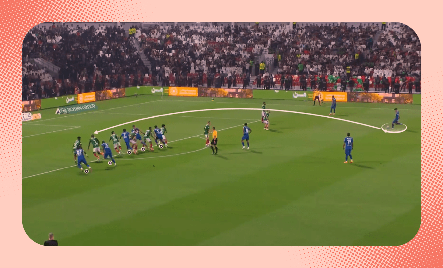 هدف الهلال الرابع في مرمى الاتفاق مثال على أنماط التحرك في الركلات الحرة، حيث أرسل نيفيز كرةً مقوسةً نحو منطقة الجزاء مع تحرك خمسة لاعبين يمتازون في الكرات الرأسية باندفاع نحو المرمى: ليوناردو، سافتش، نونيز، كوليبالي، تمبكتي.