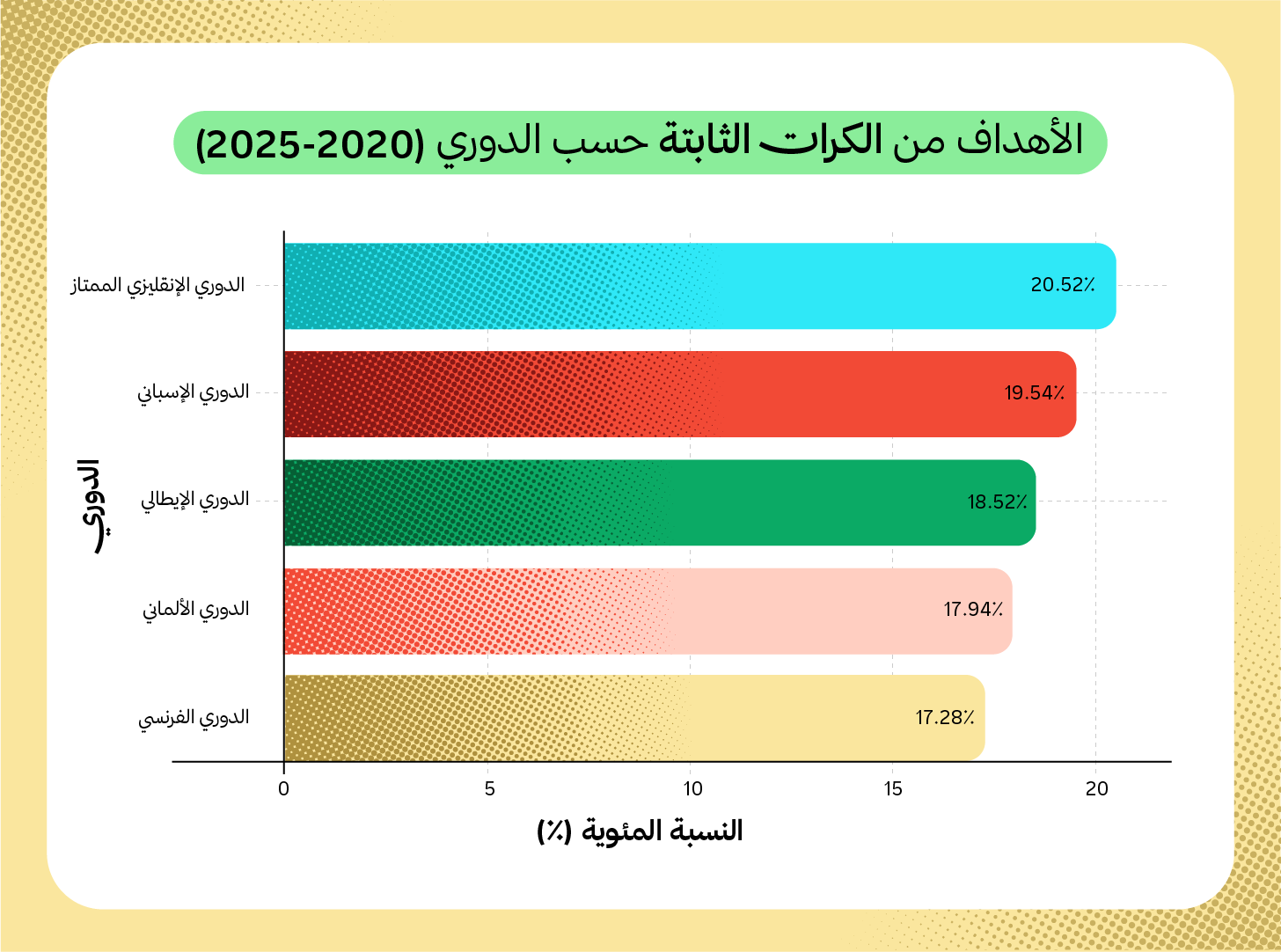وعندما ننظر إلى مقاييس نسبة الأهداف من كرات ثابتة في الدوريات الكبرى خلال المواسم الخمسة السابقة، سنجد اتجاهًا عامًا متصاعدًا بعد أن أدركت الأندية أهمية التطوّر في هذه الكرات وضرورة التعامل معها أيضًا.