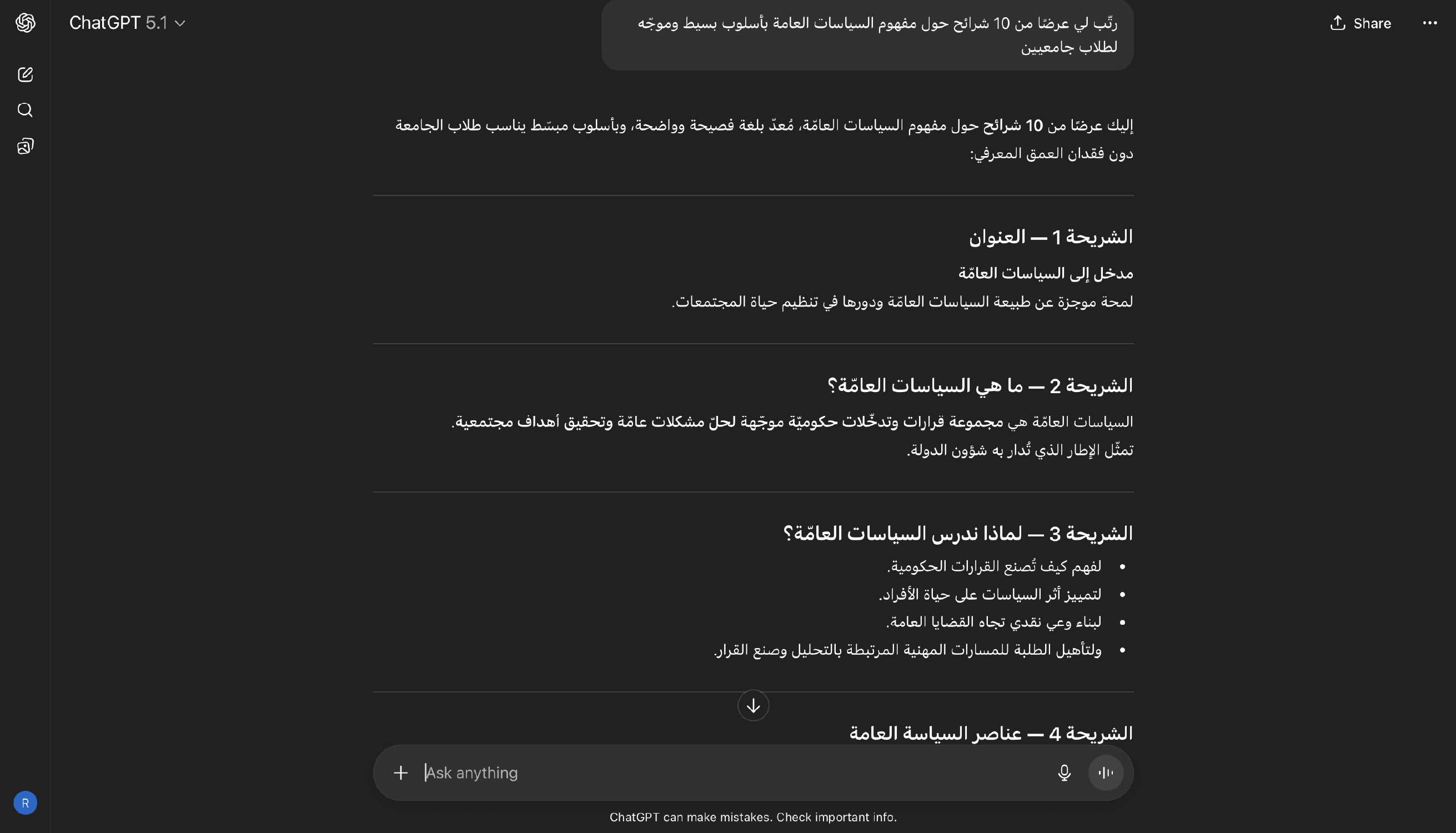 وأدوات مثل «تشات جي بي تي» تساعدك على إعادة صياغة الفكرة الرئيسة، وبناء هيكل العرض المكوَّن من: مقدمة – محاور رئيسة – ملخص تنفيذي.