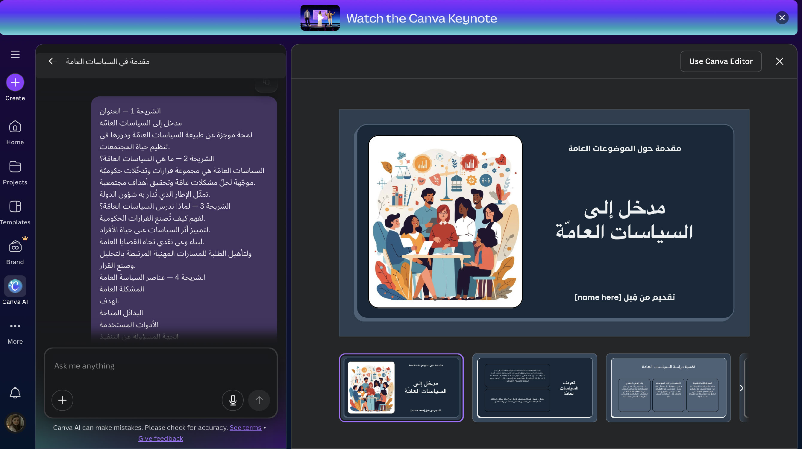 بدل هدر ساعات في تنسيق الألوان والخطوط، استعن بأدوات مثل (Canva Ai Magic) و(Manus Ai) في تصميم العروض.