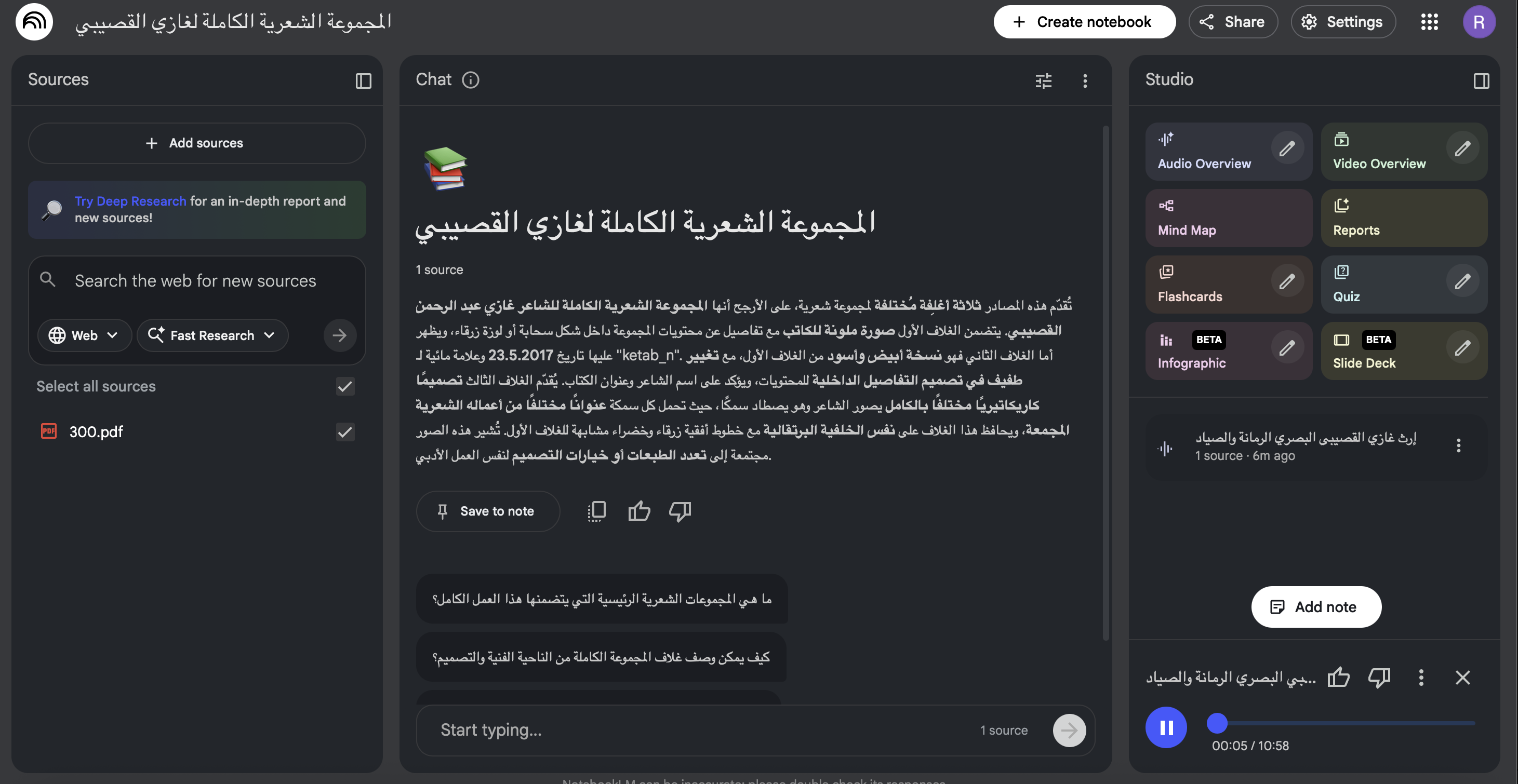 مثلًا، أحد أشهر الأدوات هي (NotebookLM): ترفع كتابك، وما هي إلا مسألة وقت حتى يتحول الى كتاب مسموع يمكنك سماعه وأنت تعمل أو تقود السيارة أو تمارس الرياضة.
