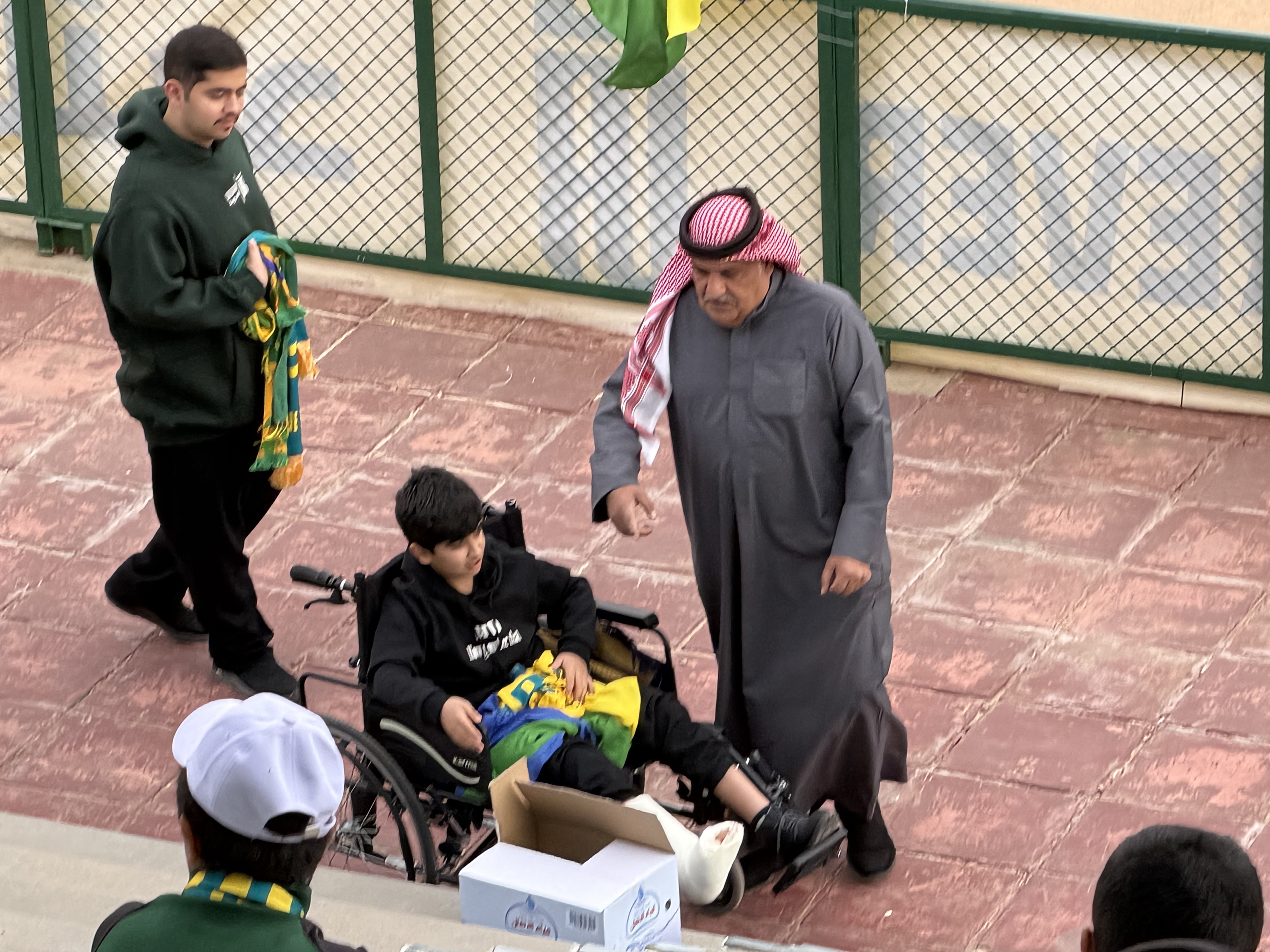 يكمل: «ما أغصبهم والله على تشجيع العروبة، ولو واحد منهم ما يبي هو حر، لكن أهتم كثير بحضورهم هنا. يشوفون الناس وممكن يتعرفون مع الوقت على ناس جدد، أنا كوّنت صداقات كثيرة في حياتي من هالصبّة اللي جالس عليها الحين.»