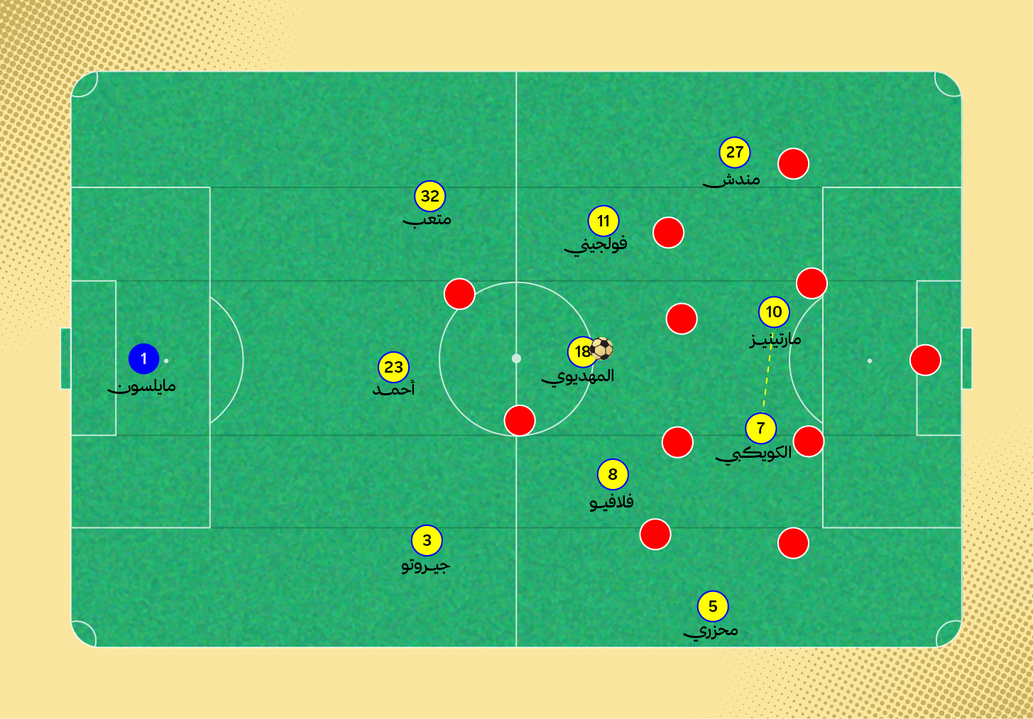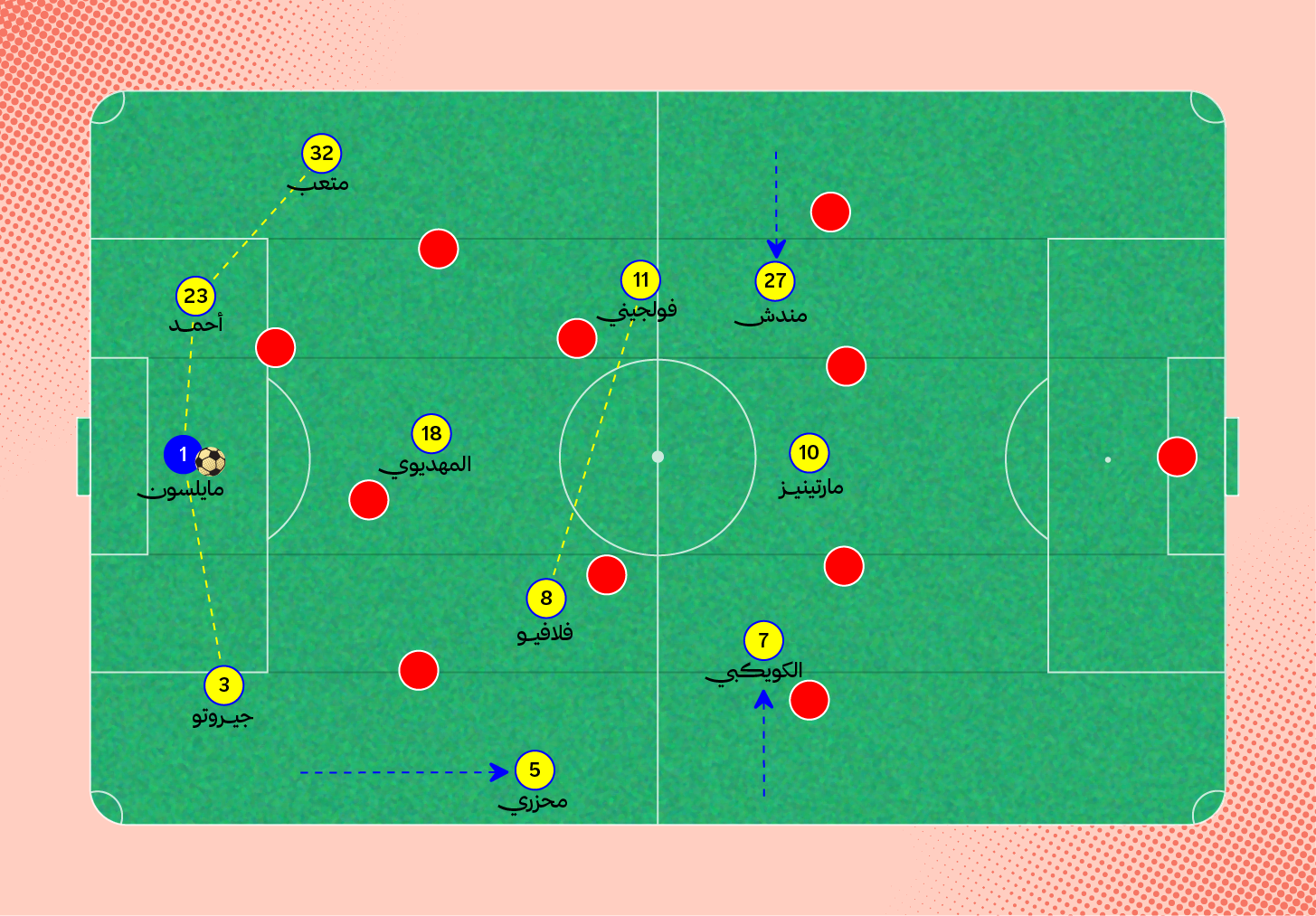 في هذه اللقطة، يُمكنك مشاهدة حضور محور الارتكاز أمام قلبي الدفاع وحارس المرمى، مع ثبات الظهير الأيسر وصعود الظهير الأيمن للأمام.