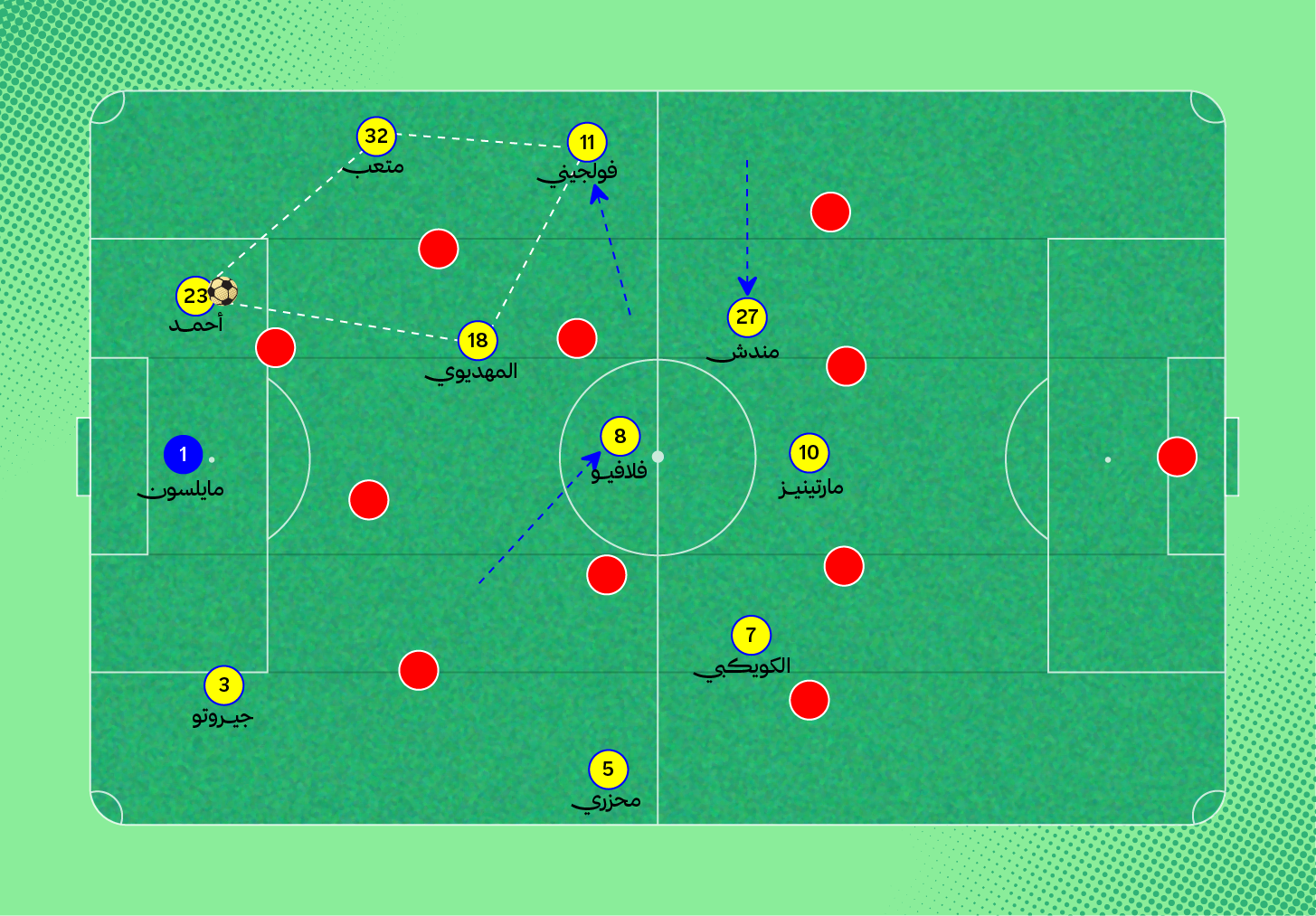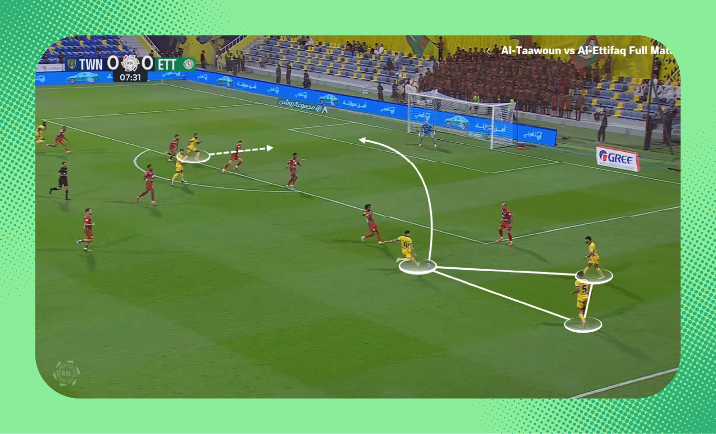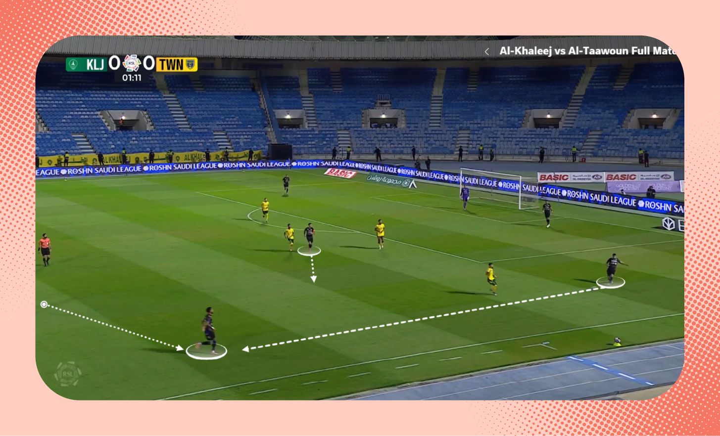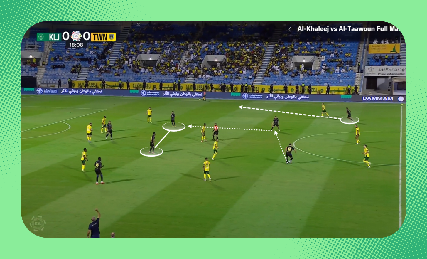 هنا في اللقطة، لم يكن سلطان مندش متاحًا لتمرير الكرة له، لذلك اقترب لاعب الوسط من المدافع لخلق مثلثات تمرير بينهما بجانب مندش والظهير الأيمن، (يمكنك أيضًا مشاهدة تمركز متعب المفرج الظهير الأيسر في أسفل الصورة كمدافع طرف، إضافةً لتحرك فولقيني ليبقى أقرب للمهاجم).
