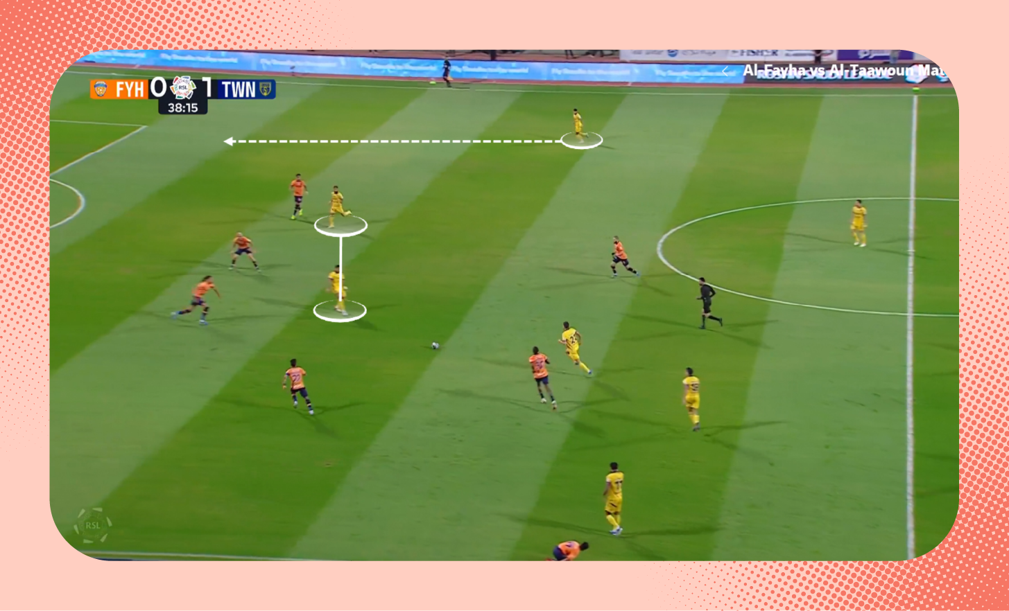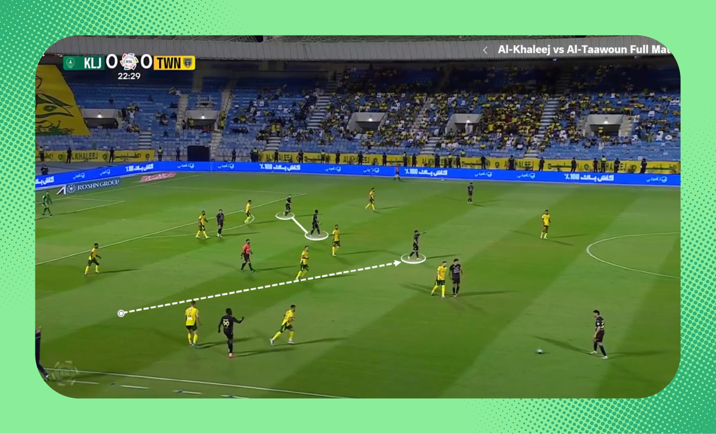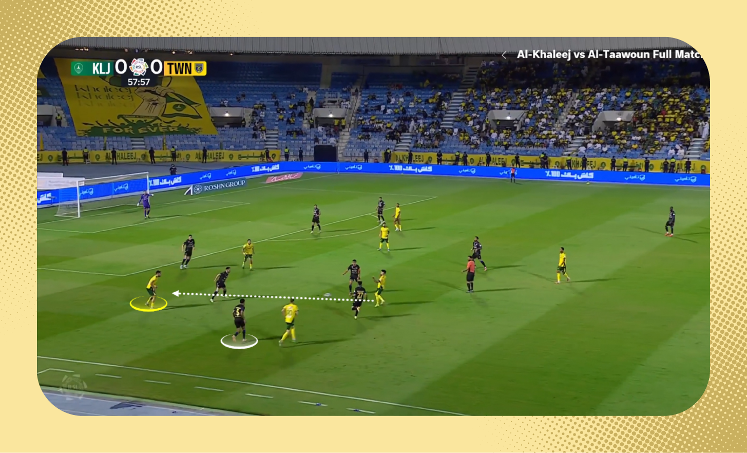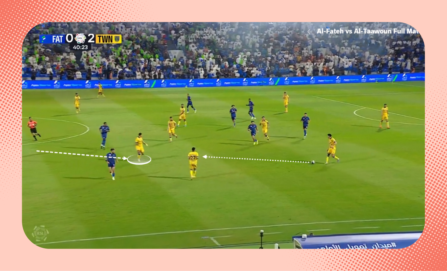 هنا في اللقطة، لم يكن سلطان مندش متاحًا لتمرير الكرة له، لذلك اقترب لاعب الوسط من المدافع لخلق مثلثات تمرير بينهما بجانب مندش والظهير الأيمن، (يمكنك أيضًا مشاهدة تمركز متعب المفرج الظهير الأيسر في أسفل الصورة كمدافع طرف، إضافةً لتحرك فولقيني ليبقى أقرب للمهاجم).