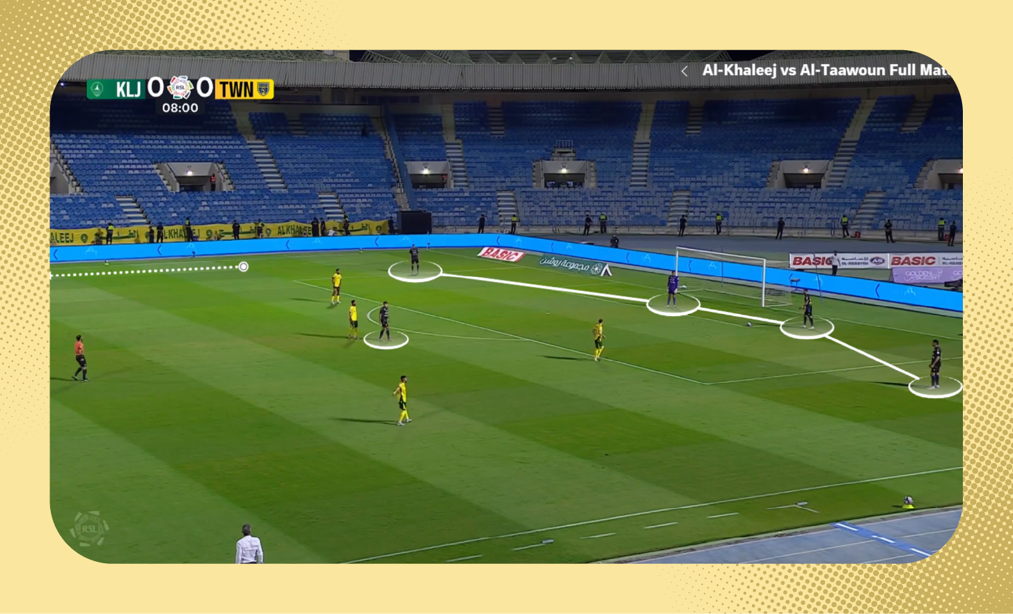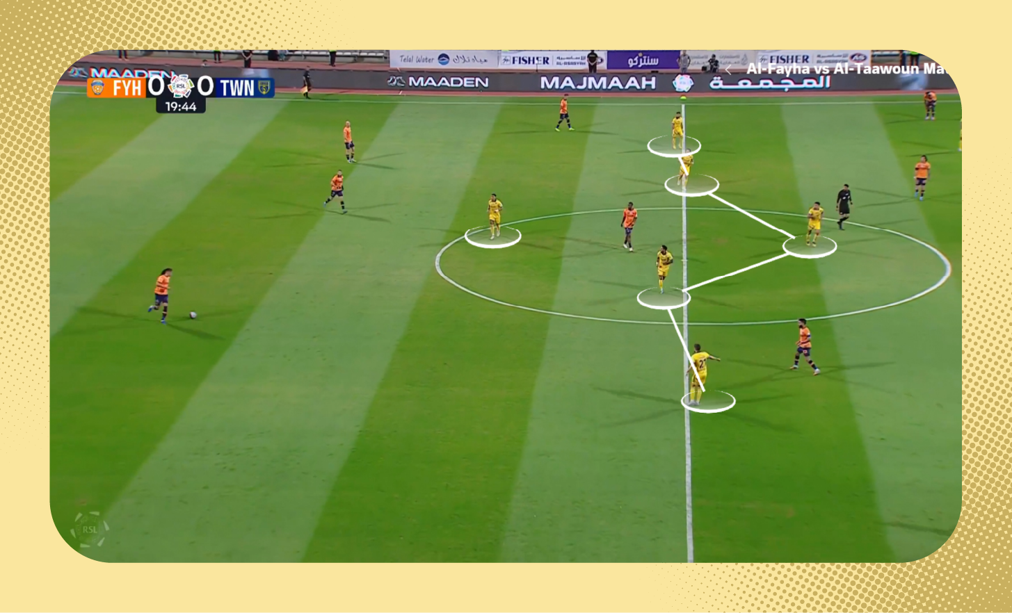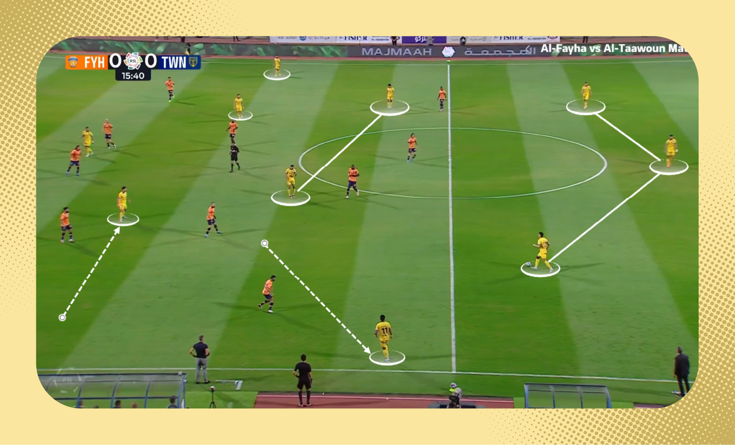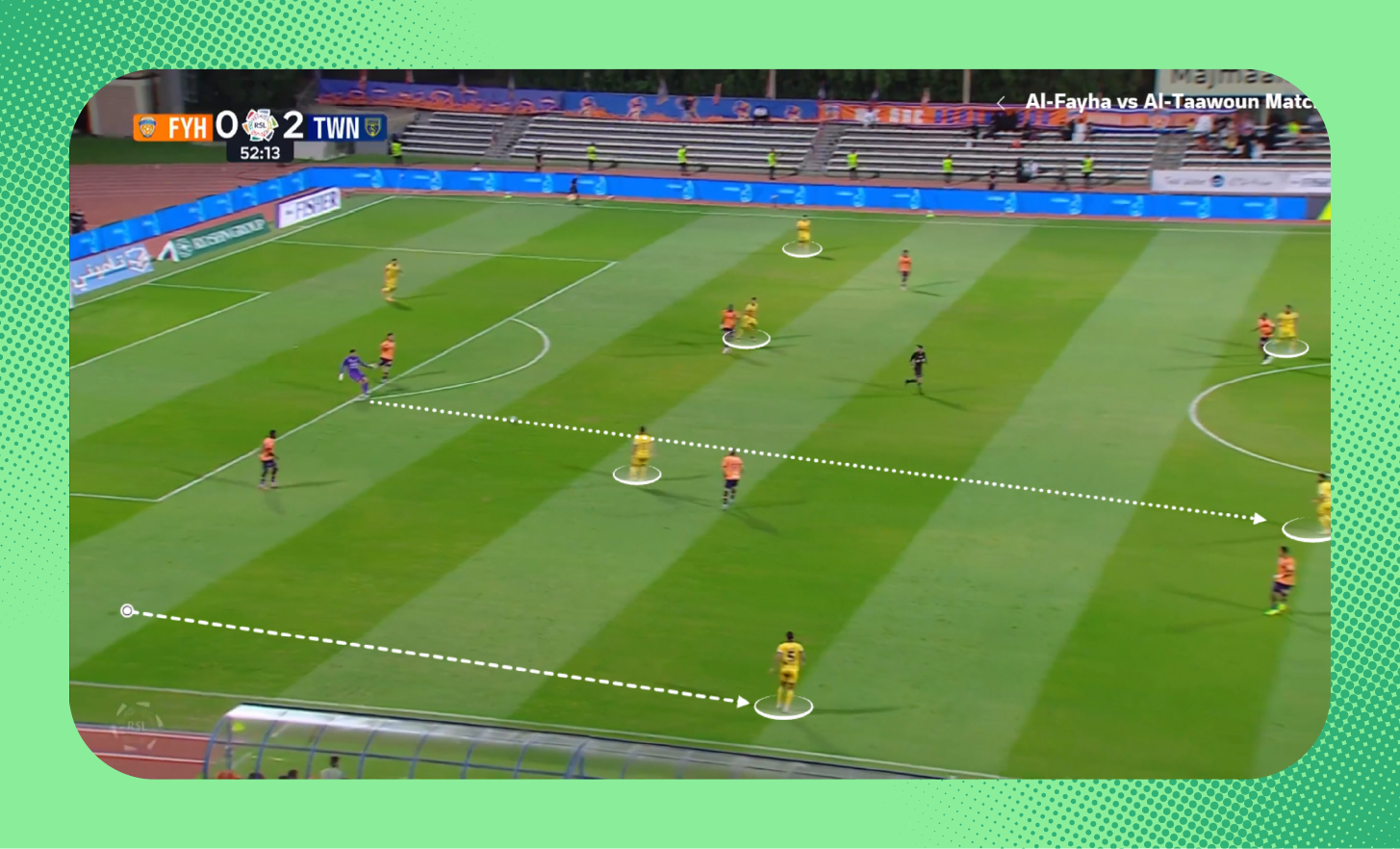 هنا في اللقطة، لم يكن سلطان مندش متاحًا لتمرير الكرة له، لذلك اقترب لاعب الوسط من المدافع لخلق مثلثات تمرير بينهما بجانب مندش والظهير الأيمن، (يمكنك أيضًا مشاهدة تمركز متعب المفرج الظهير الأيسر في أسفل الصورة كمدافع طرف، إضافةً لتحرك فولقيني ليبقى أقرب للمهاجم).
