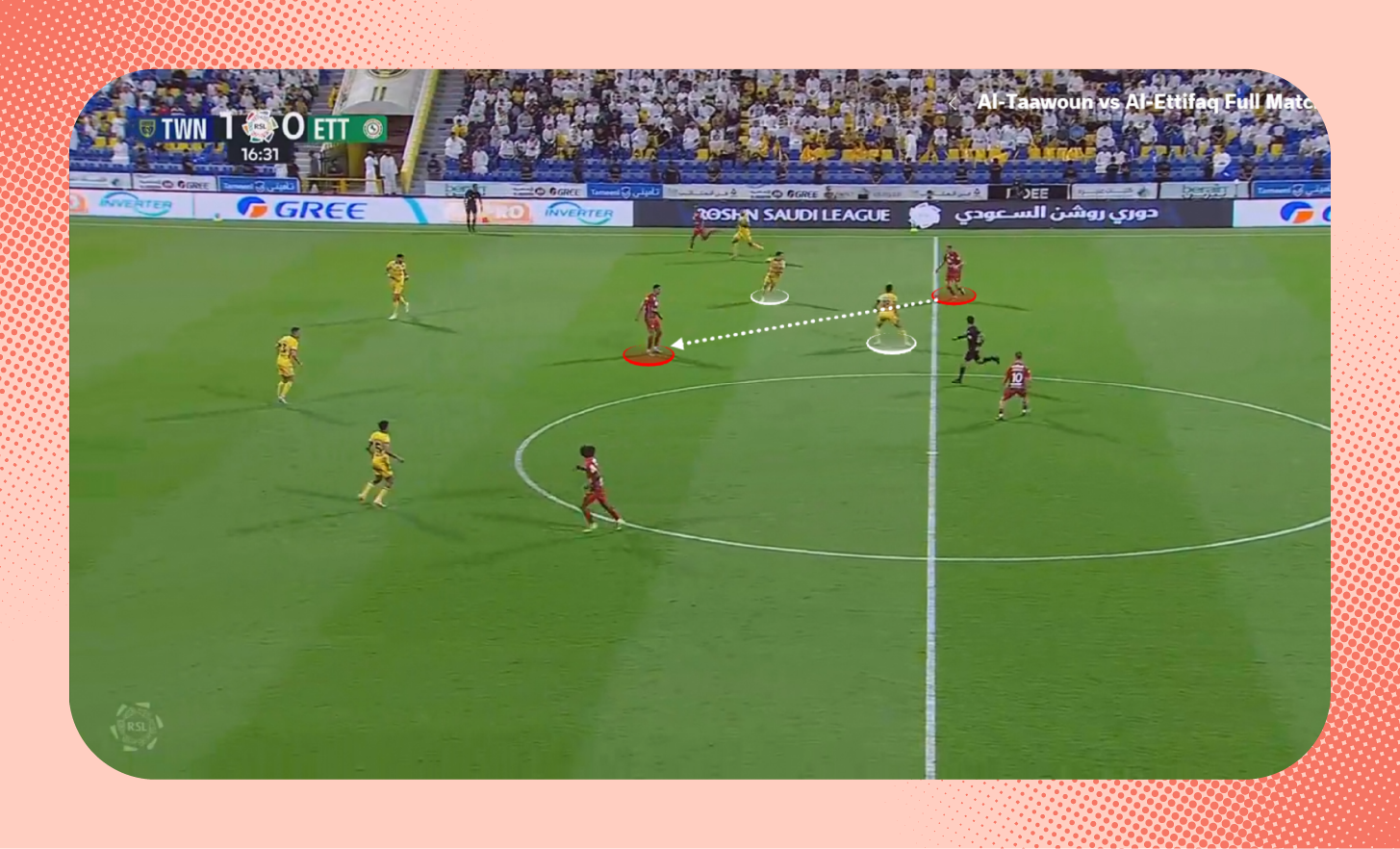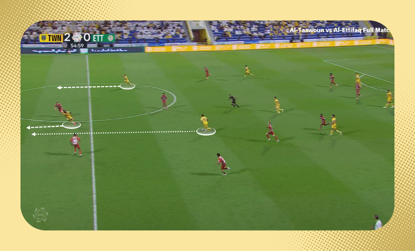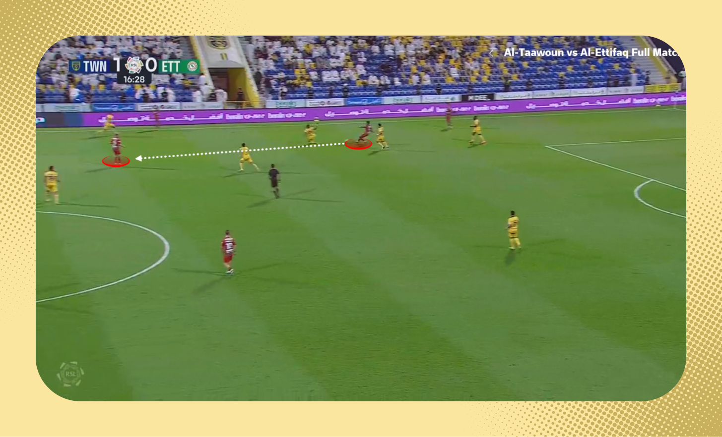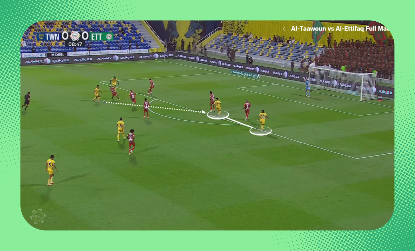 ومع استلامه الكرة، لعب لاعب وسط الاتفاق الكرة سريعًا بين الخطوط نحو زميله، الذي وجد نفسه بدون أي ضغط.
