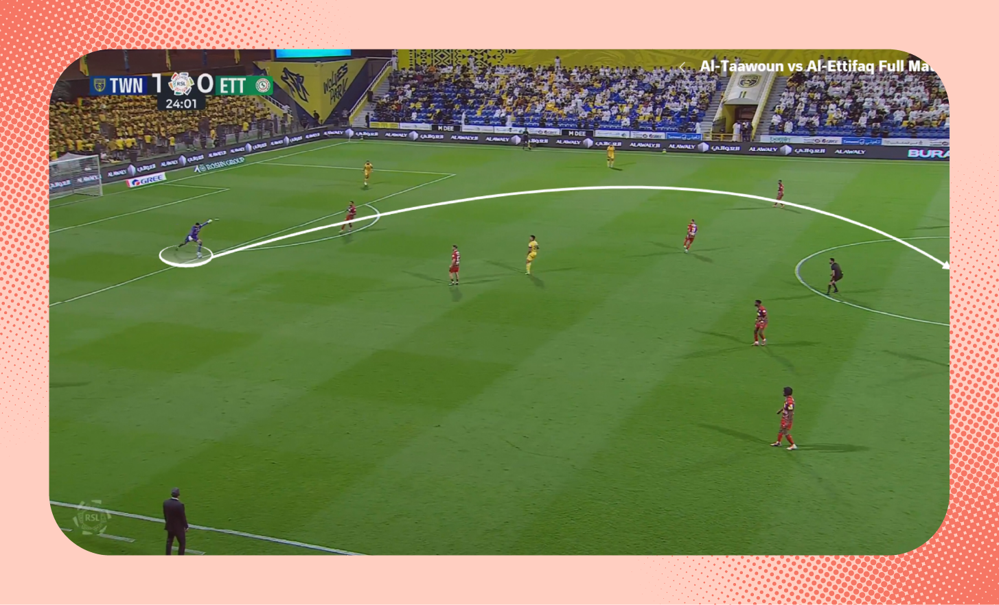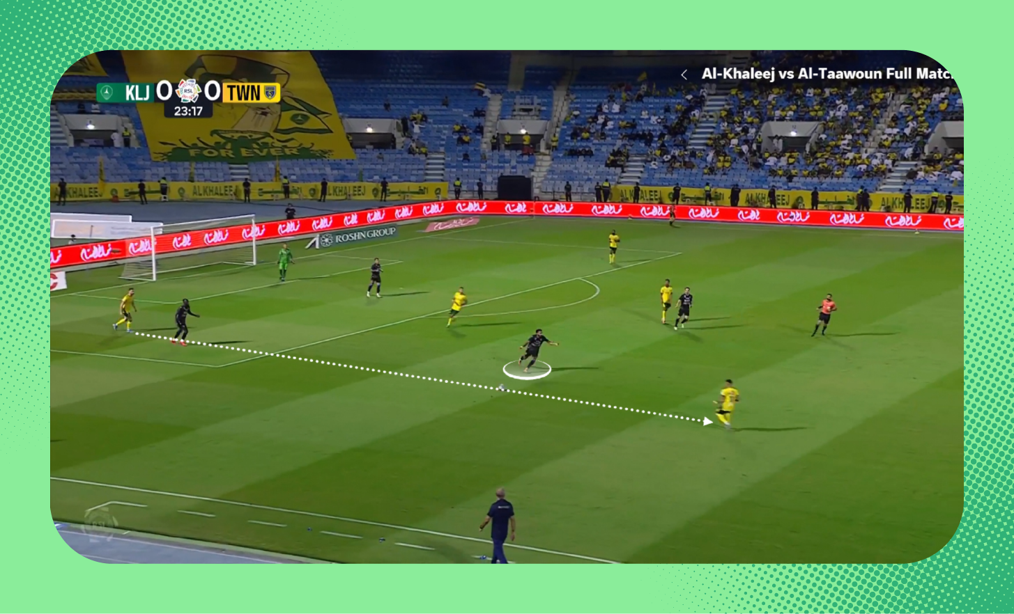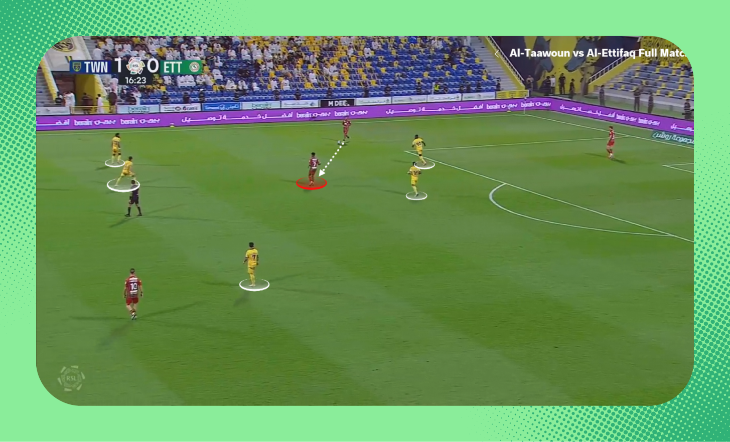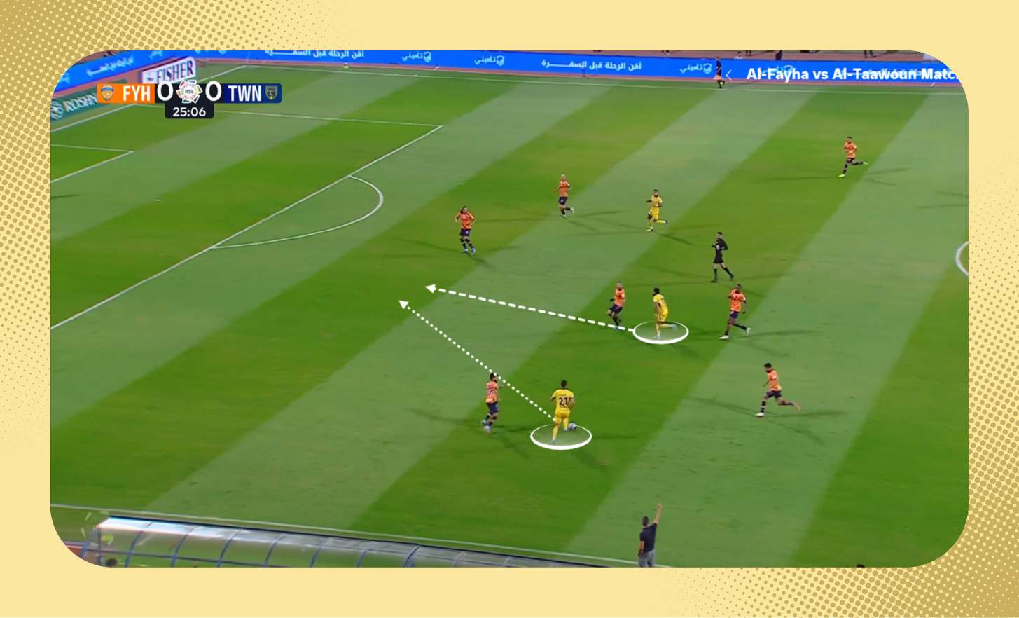 ومع استلامه الكرة، لعب لاعب وسط الاتفاق الكرة سريعًا بين الخطوط نحو زميله، الذي وجد نفسه بدون أي ضغط.