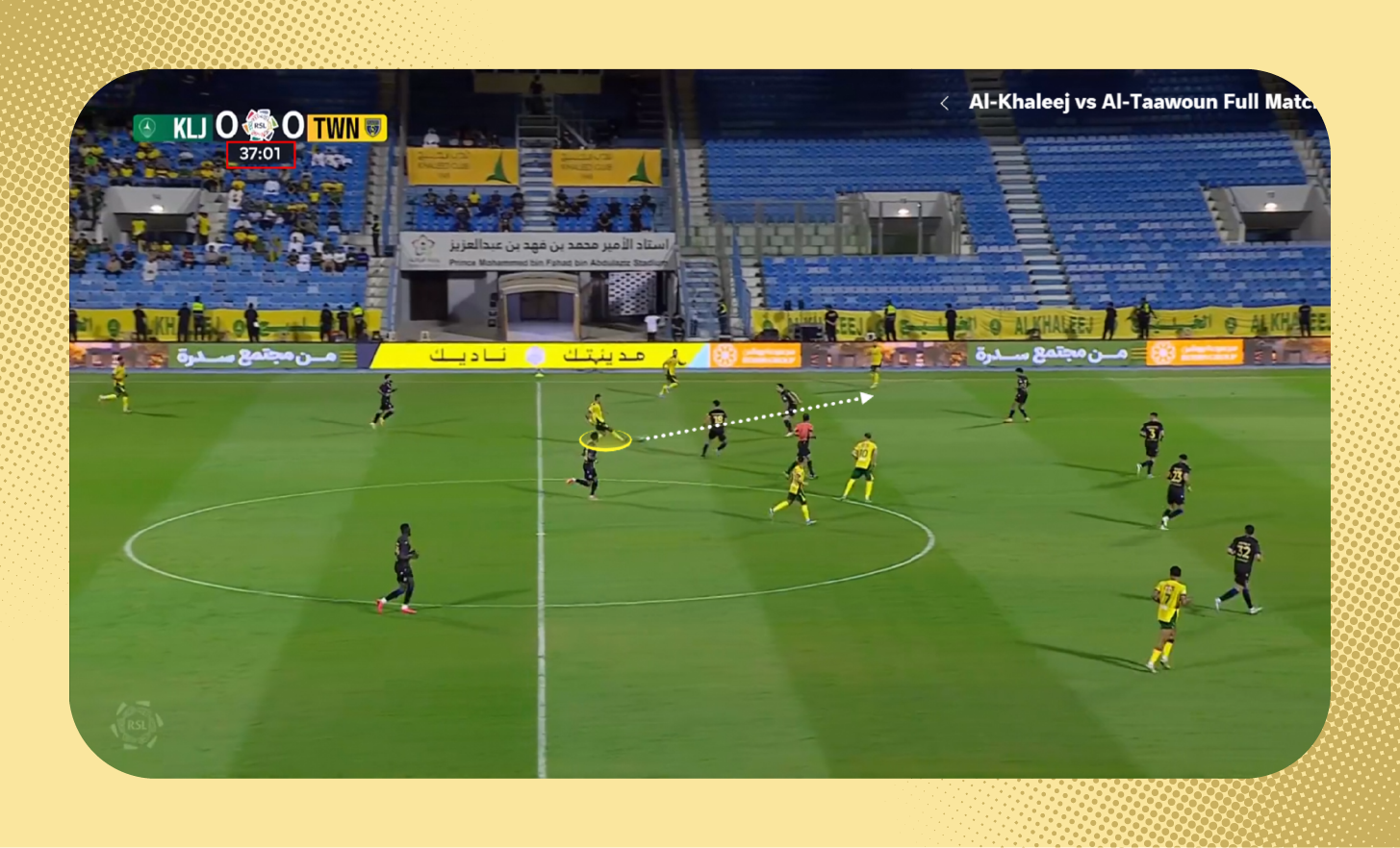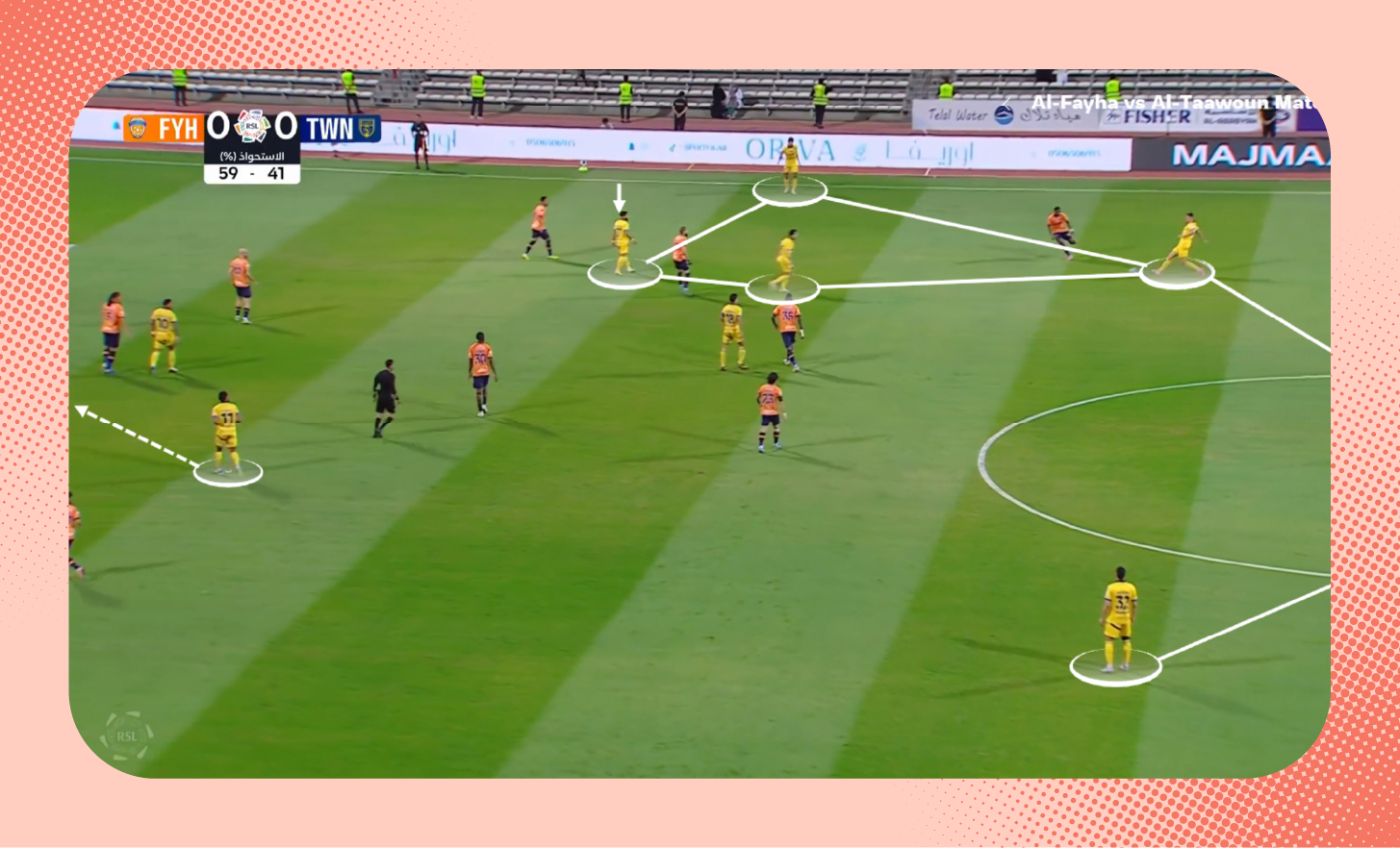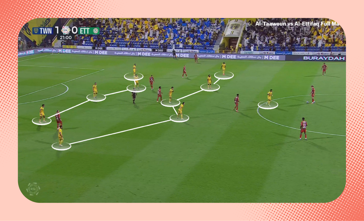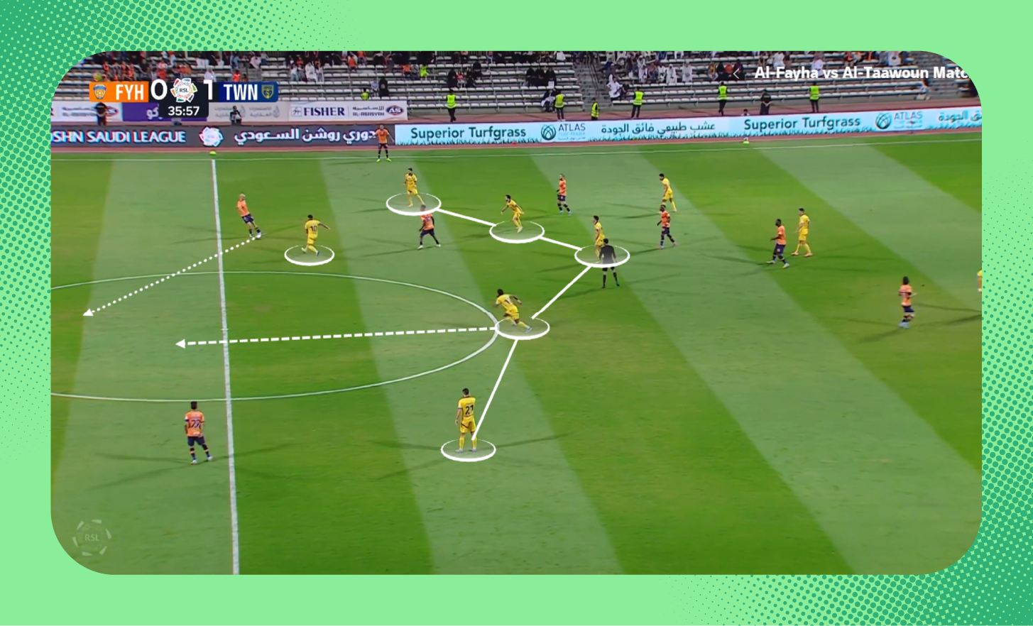 ومع استلامه الكرة، لعب لاعب وسط الاتفاق الكرة سريعًا بين الخطوط نحو زميله، الذي وجد نفسه بدون أي ضغط.