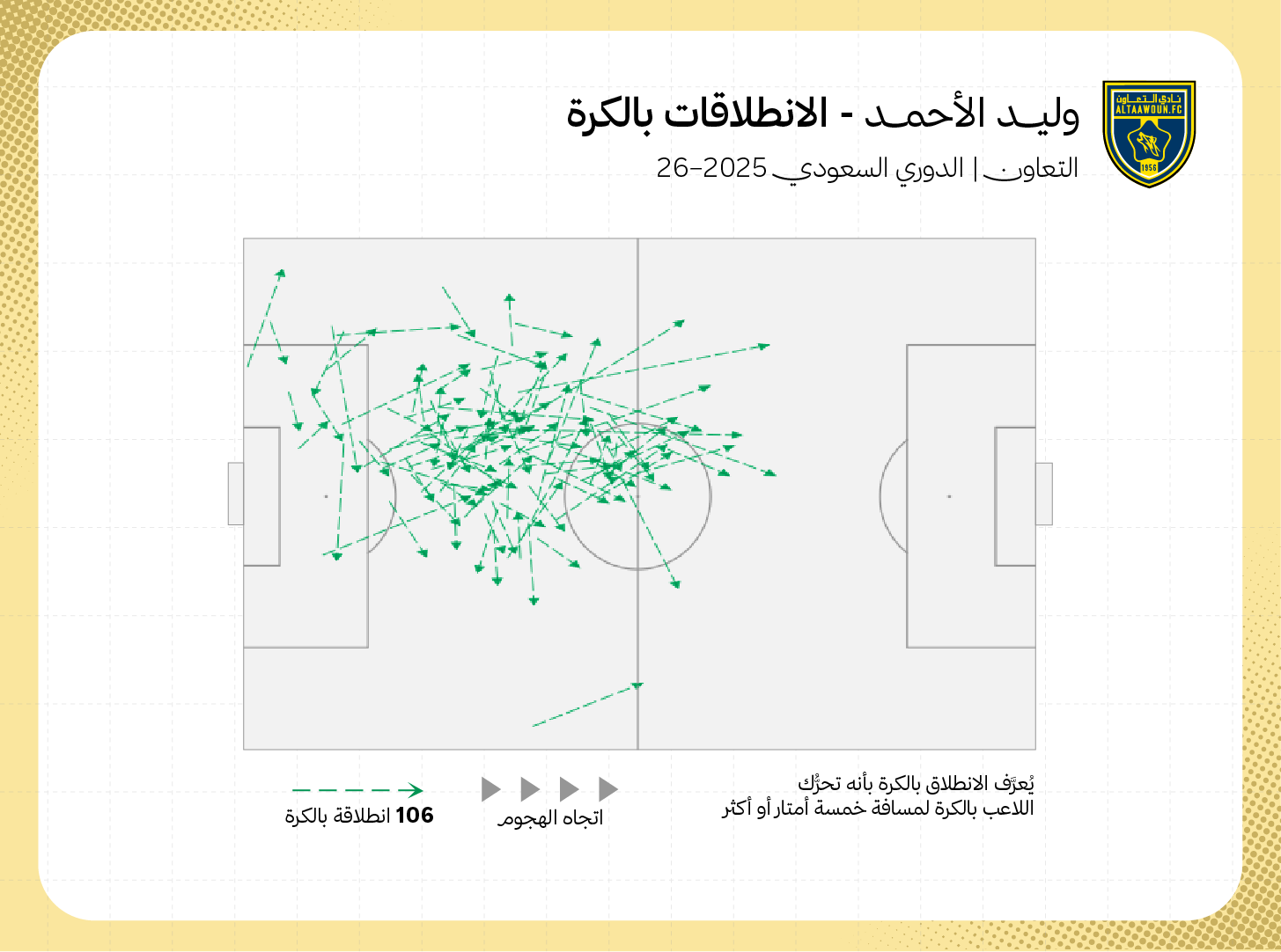 وبالحديث عن وليد الأحمد، فإن المدافع صاحب الـ 26 عامًا يظهر أيضًا كأحد العناصر المساندة في تقدم التعاون بالكرة، من خلال قدرته على حملها والتقدم بها وكسب المزيد من المساحات.