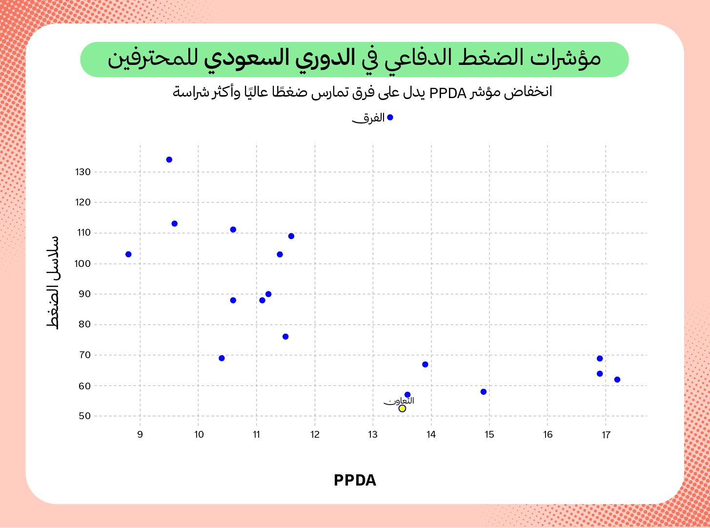 كما يظهر تقاعس التعاون عن تصعيد خطوطه في الضغط من إحصائيات التمريرات المسموح بها لكل إجراء دفاعي (PPDA)، وكذلك إحصائيات تسلسلات الضغط (Pressed Sequences)، حيث يحضر فيها الفريق في مراكز متأخرة بـ 14.1 تمريرة يسمح بها للخصم، قبل أن يبدأ أي إجراء دفاعي، كما أنه في المرتبة الأخيرة في تسلسلات الضغط بـ 63 سلسلة ضغط.