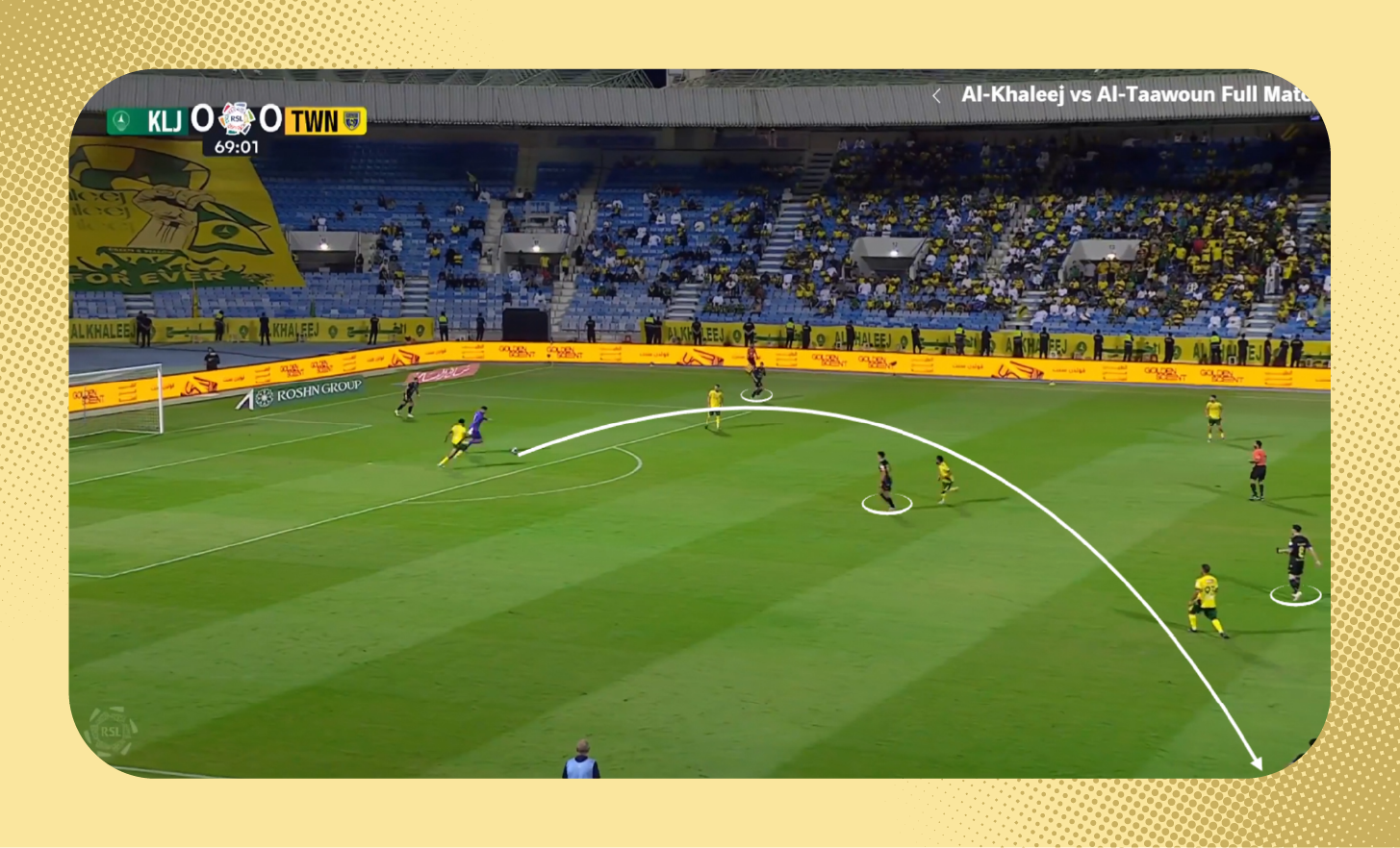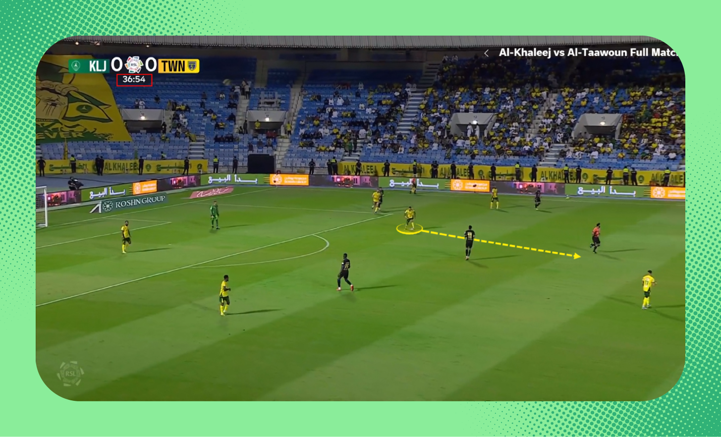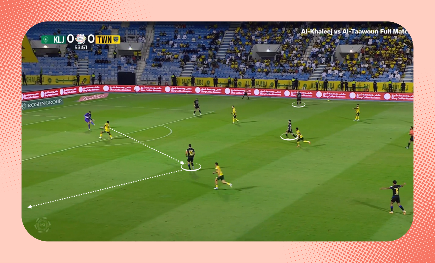 وفي هذه اللقطة، استلم لاعب الخليج الكرة من حدود منطقة جزاء فريقه، وانطلق بها بدون أي ضغط من أي لاعب من التعاون (انظر لمؤشر الدقائق في الأعلى).