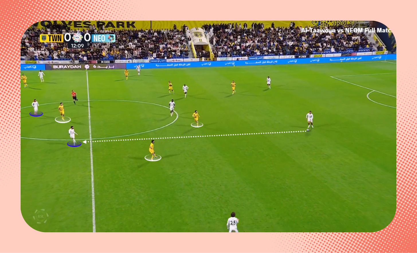 وفي هذه اللقطة من مباراة نيوم، يُمكنك مشاهدة انخفاض حدّة ضغط التعاون وعدم إغلاق مسارات التمرير بشكل جيد، الأمر الذي مكّن نيوم من خلق أفضلية عددية (2 ضد 1) أمام محور الارتكاز؛ ليمرر المدافع الكرة بكل سهولة بين الخطوط.