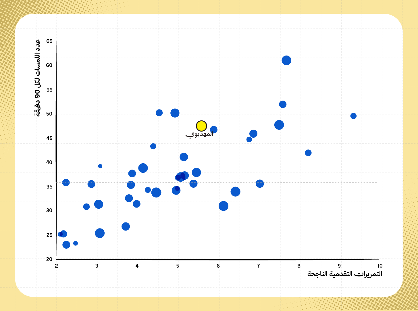 يظهر ذلك عندما ننظر لمعدلات التمريرات التقدمية ولمس الكرة، إذ يحظى المهديوي بمعدل (5.6 تمريرة تقدمية/90 دقيقة) ومعدل (47.5 لمسة/90 دقيقة)، تضعه ضمن أفضل لاعبي الوسط في الدوري.