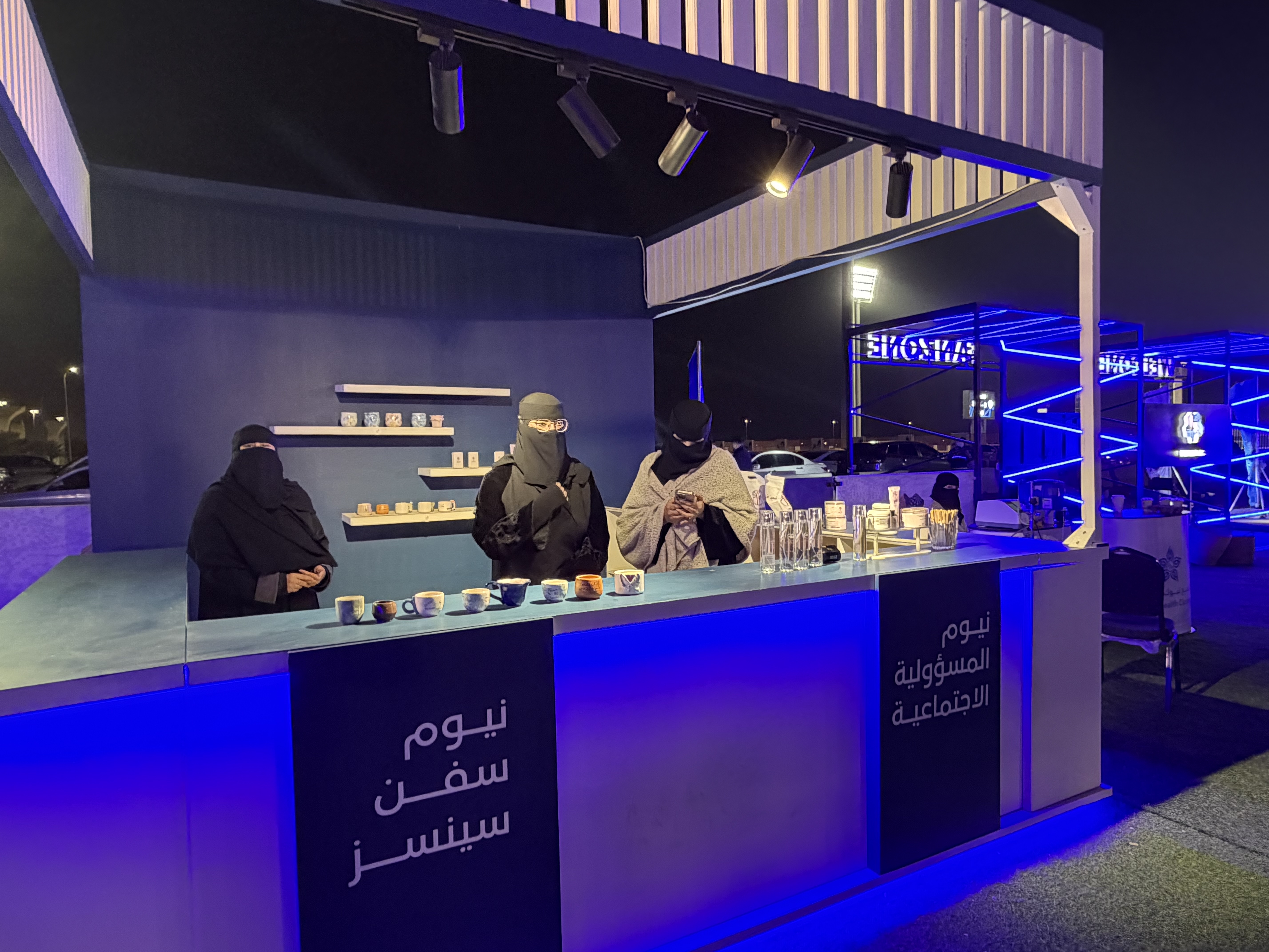 في ركن من أركان منطقة المشجعين، تظهر مشاريع صغيرة من مجتمع مدينة تبوك كما هو موضح بالصورة أعلاه، بدعم من مسرَّعة «نيوم سفن سينسز» ضمن مبادرات المسؤولية الاجتماعية لشركة نيوم.