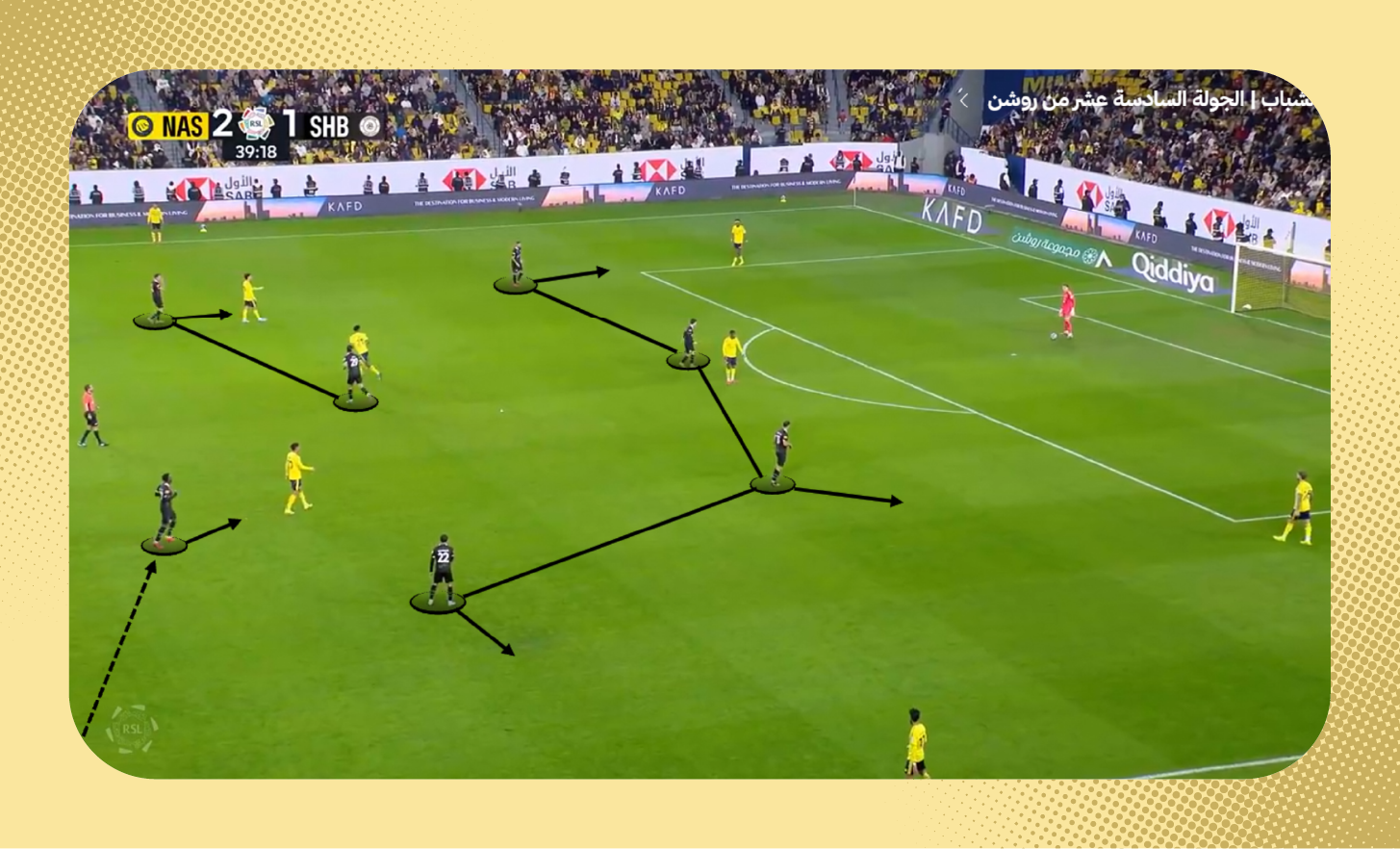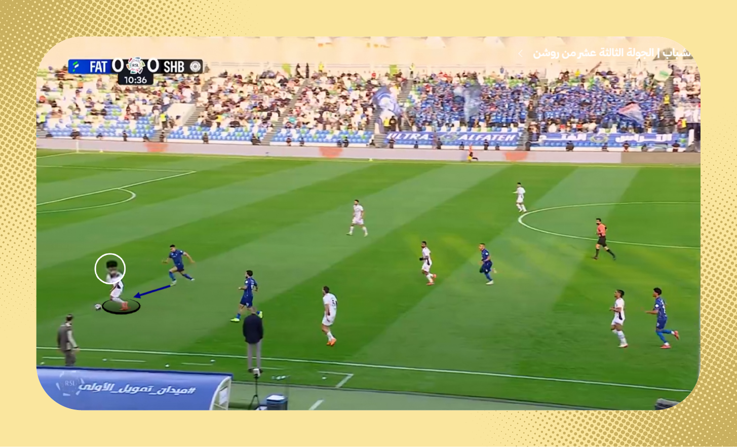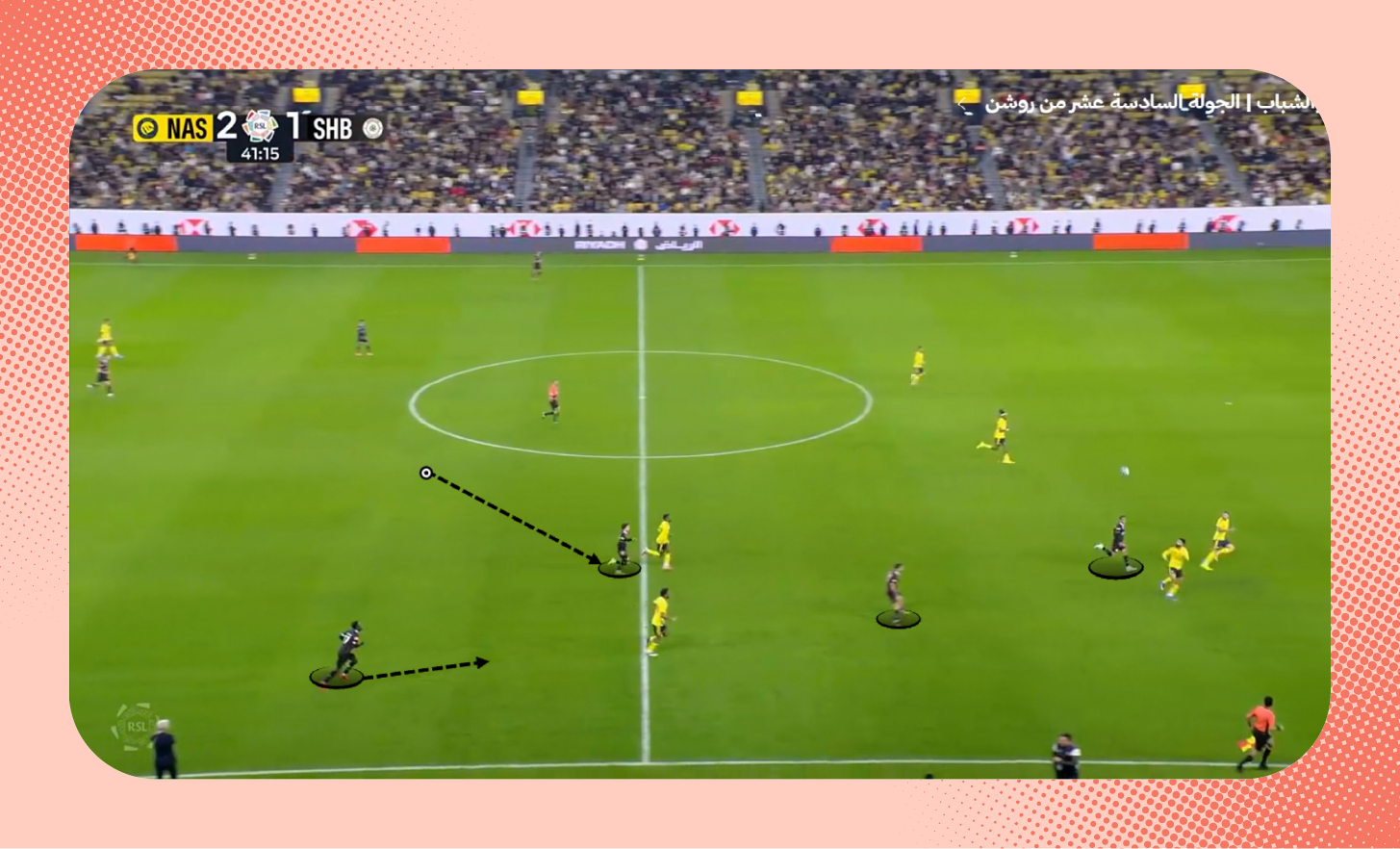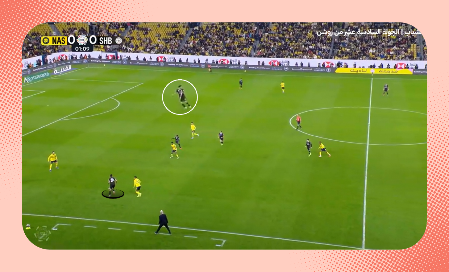 في هذه اللقطة، خلق لاعبو الشباب مثلثات تمرير بين بعضهم البعض، ثم انطلق أحدهم في أنصاف المساحات؛ لتلقي تمريرة كاراسكو داخل المنطقة.