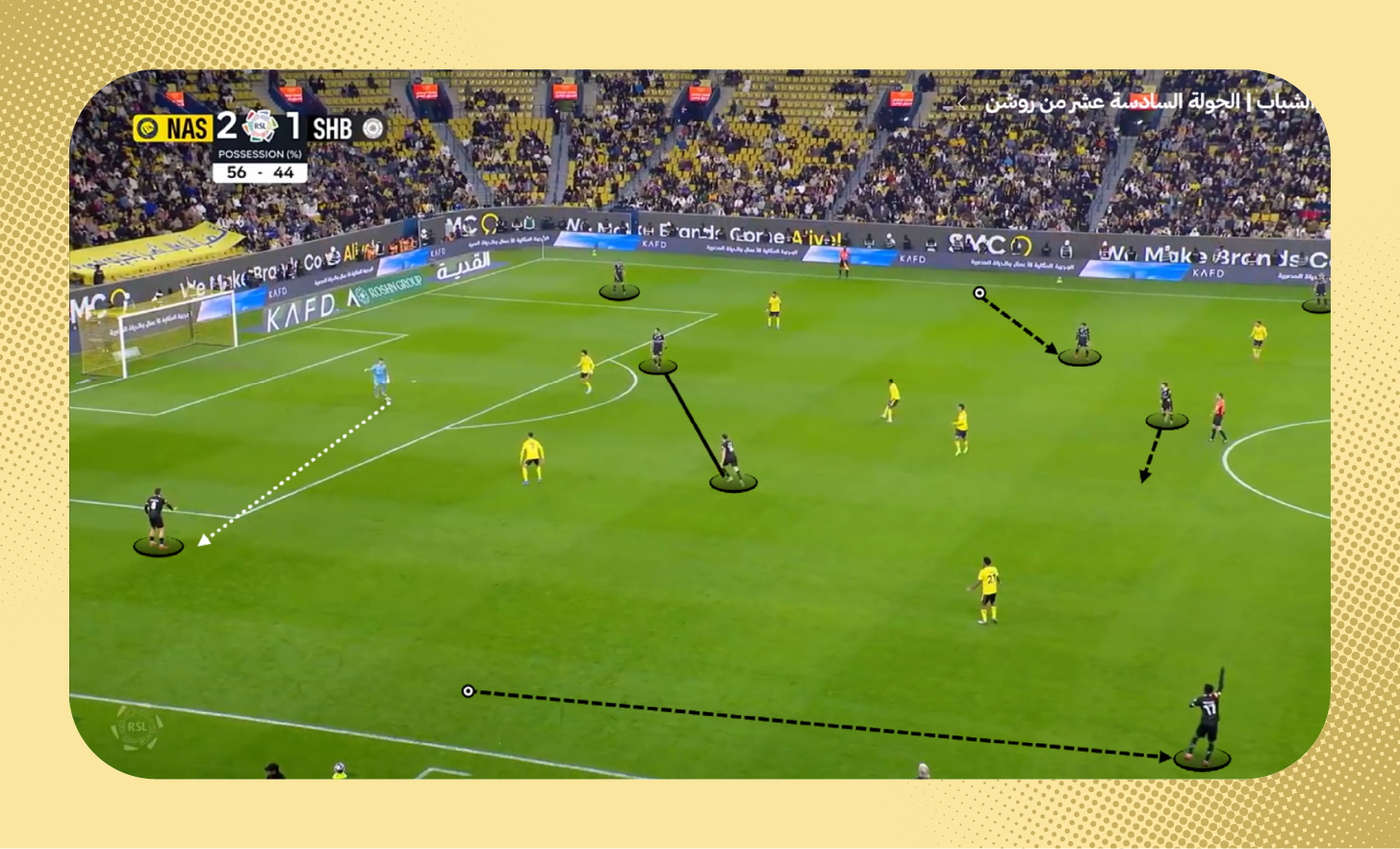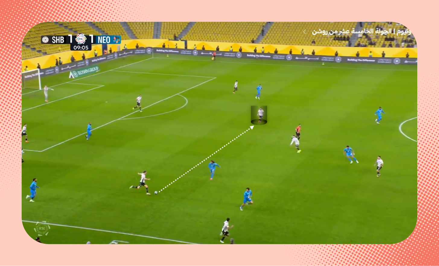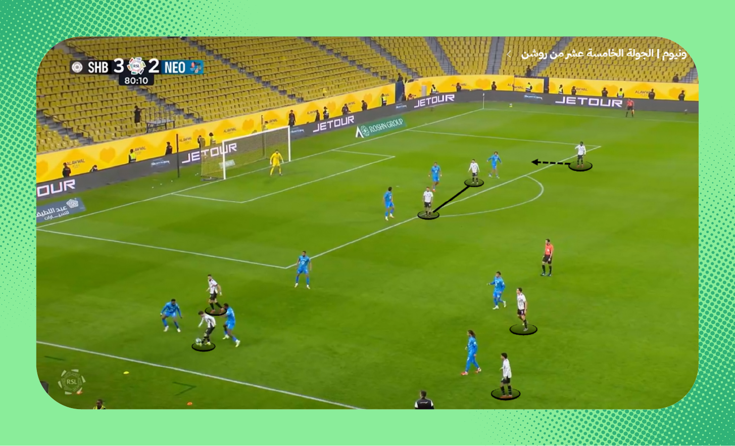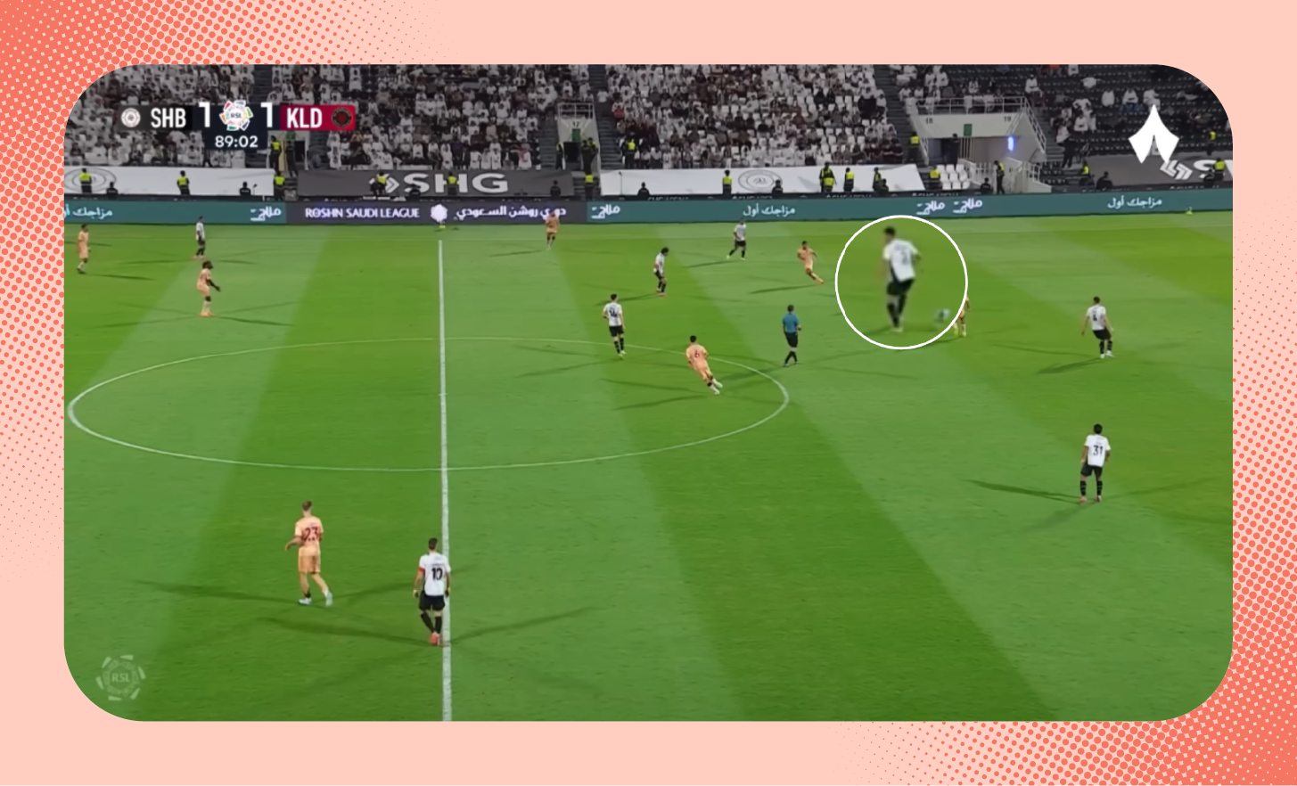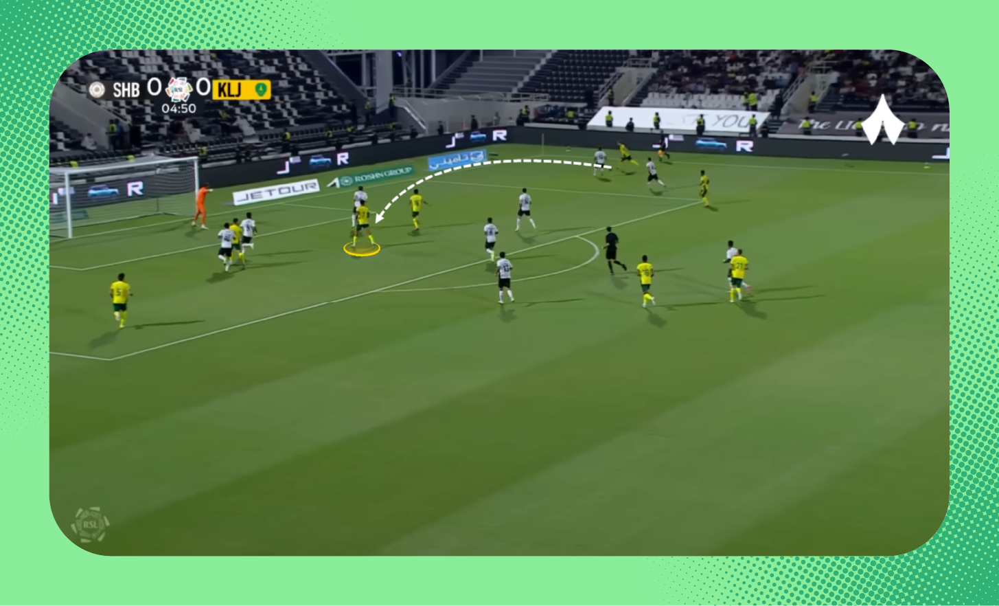 في هذه اللقطة، خلق لاعبو الشباب مثلثات تمرير بين بعضهم البعض، ثم انطلق أحدهم في أنصاف المساحات؛ لتلقي تمريرة كاراسكو داخل المنطقة.