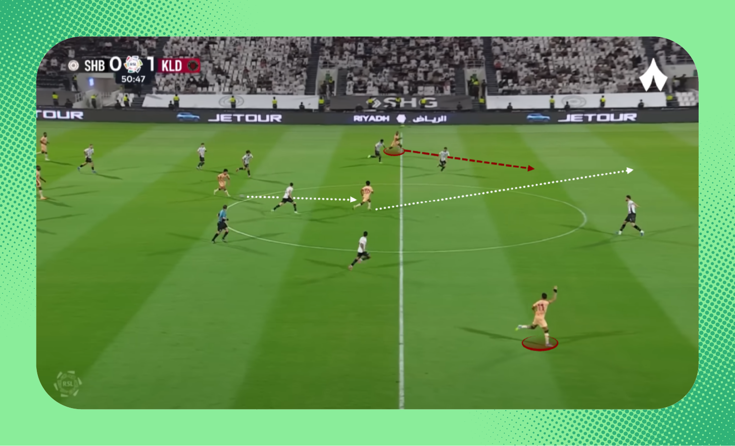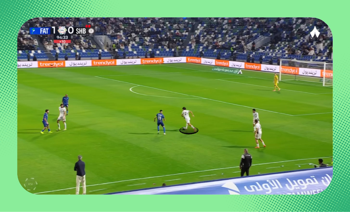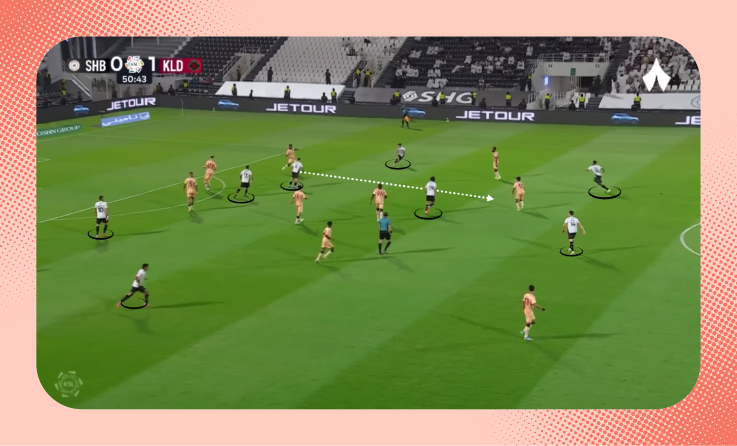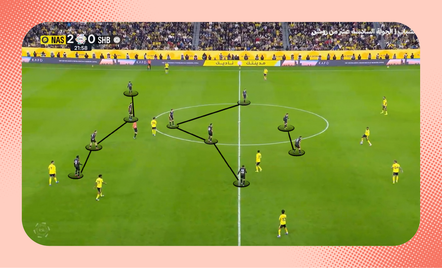 في هذه اللقطة، خلق لاعبو الشباب مثلثات تمرير بين بعضهم البعض، ثم انطلق أحدهم في أنصاف المساحات؛ لتلقي تمريرة كاراسكو داخل المنطقة.