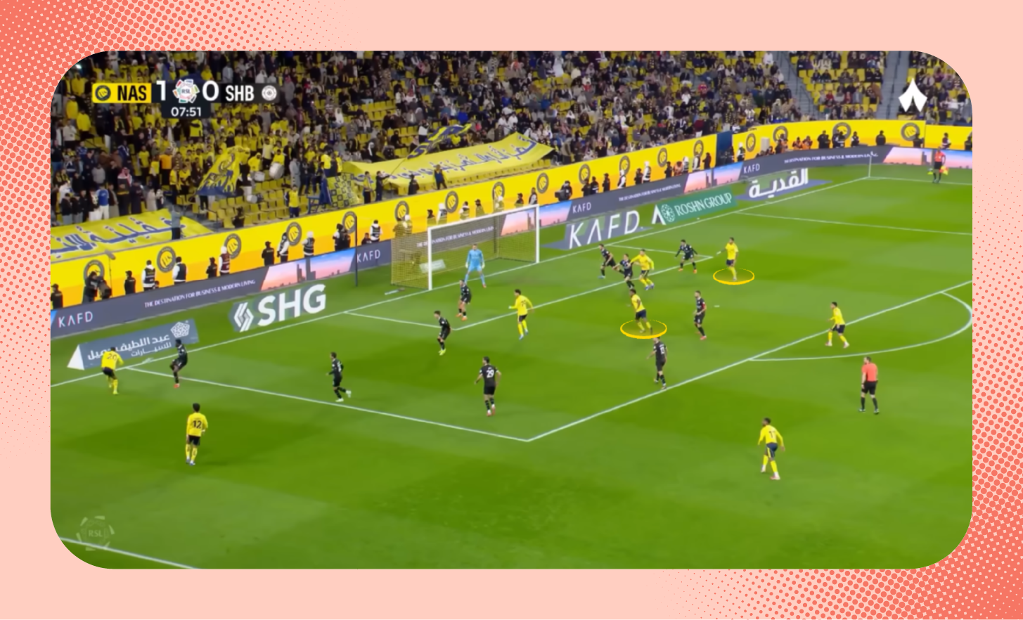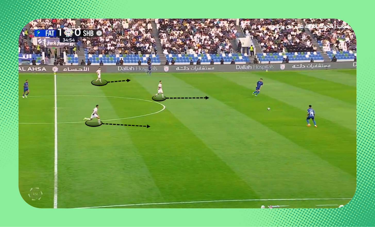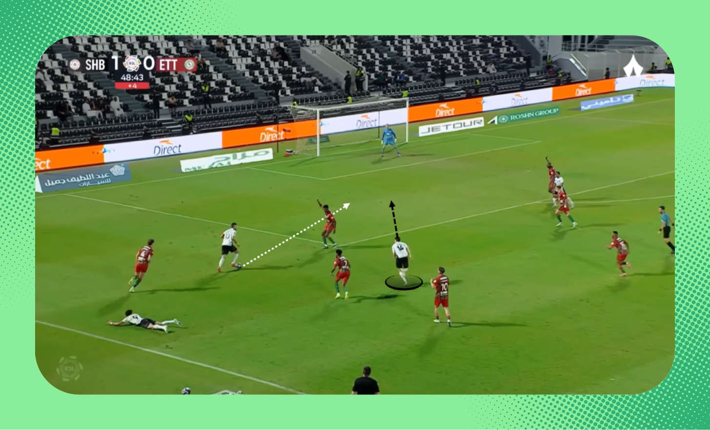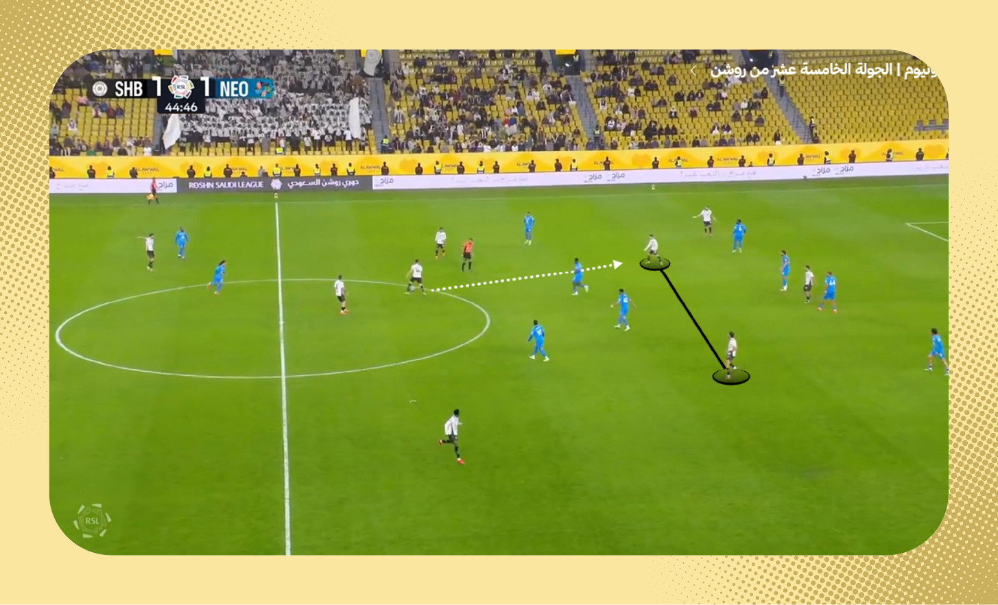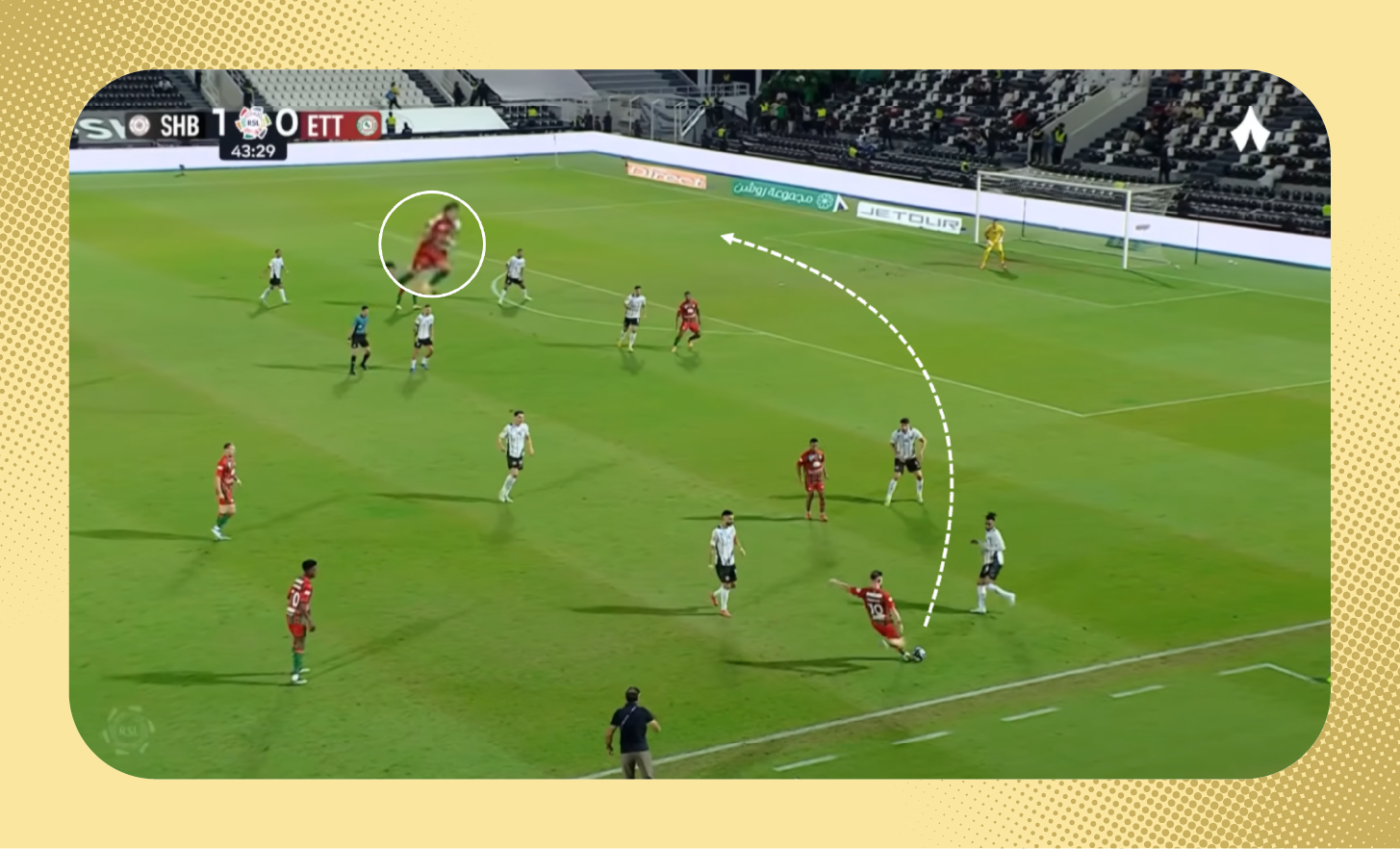 في هذه اللقطة، خلق لاعبو الشباب مثلثات تمرير بين بعضهم البعض، ثم انطلق أحدهم في أنصاف المساحات؛ لتلقي تمريرة كاراسكو داخل المنطقة.