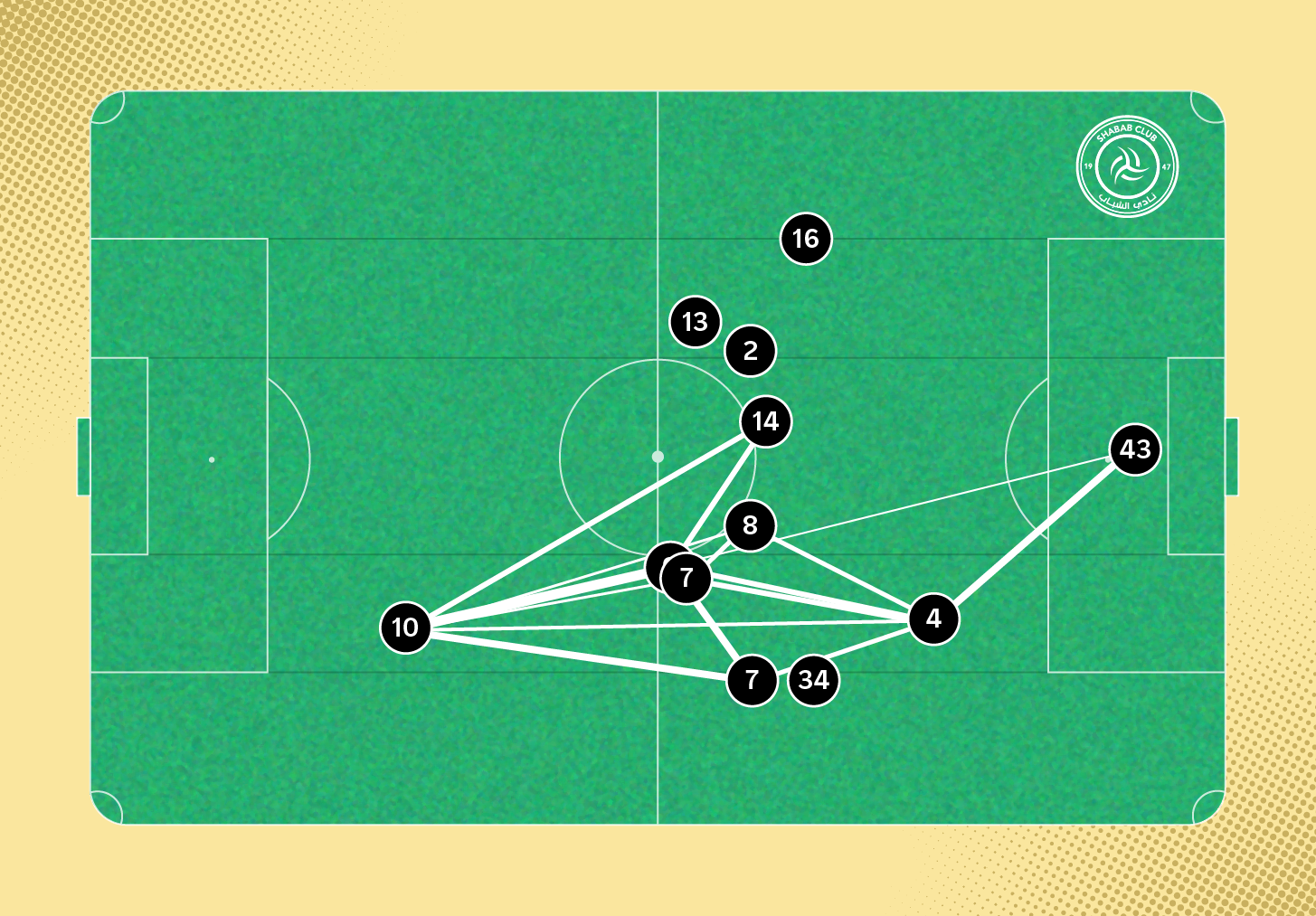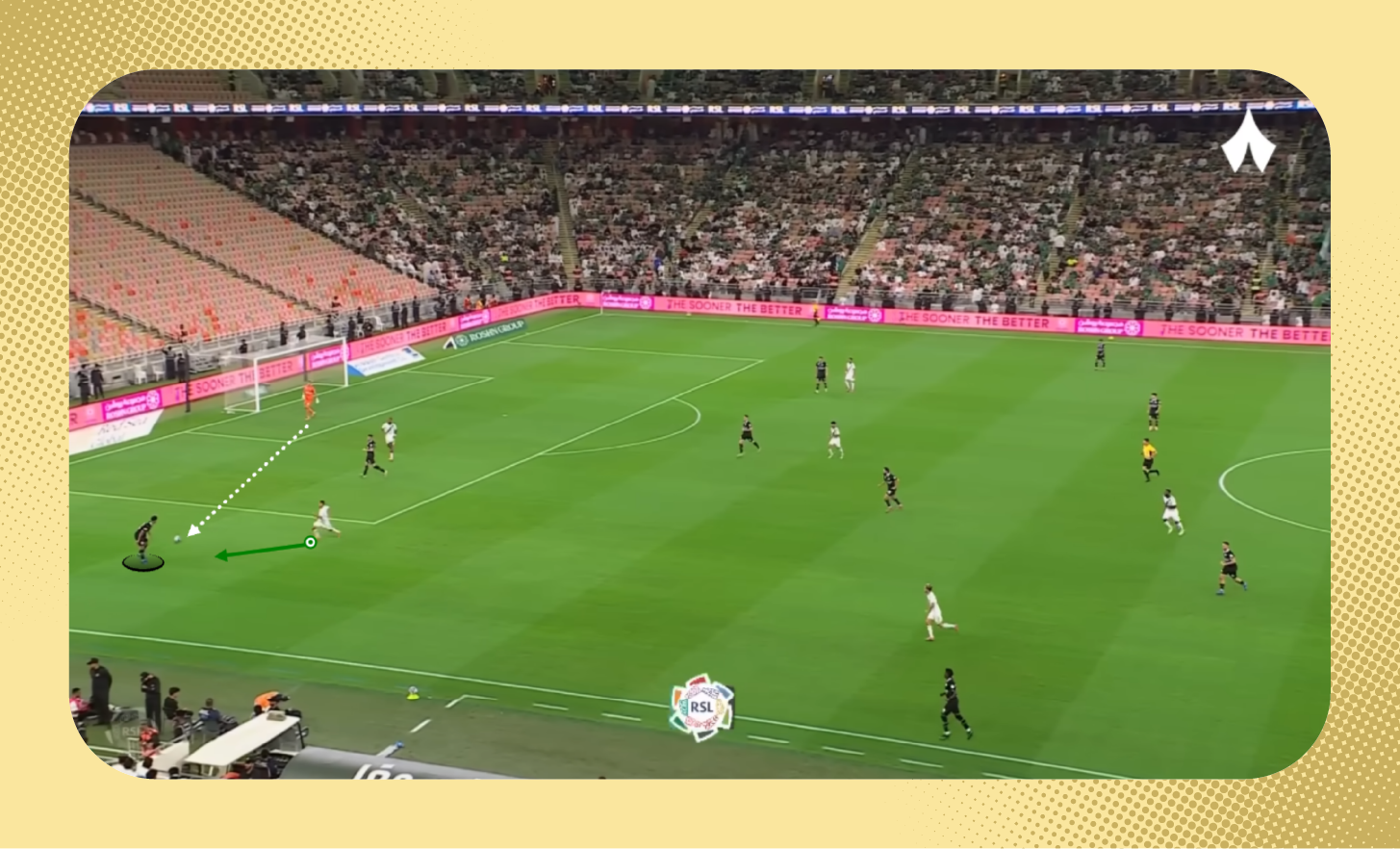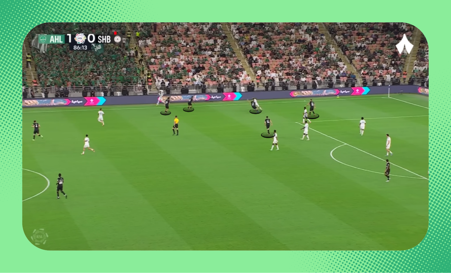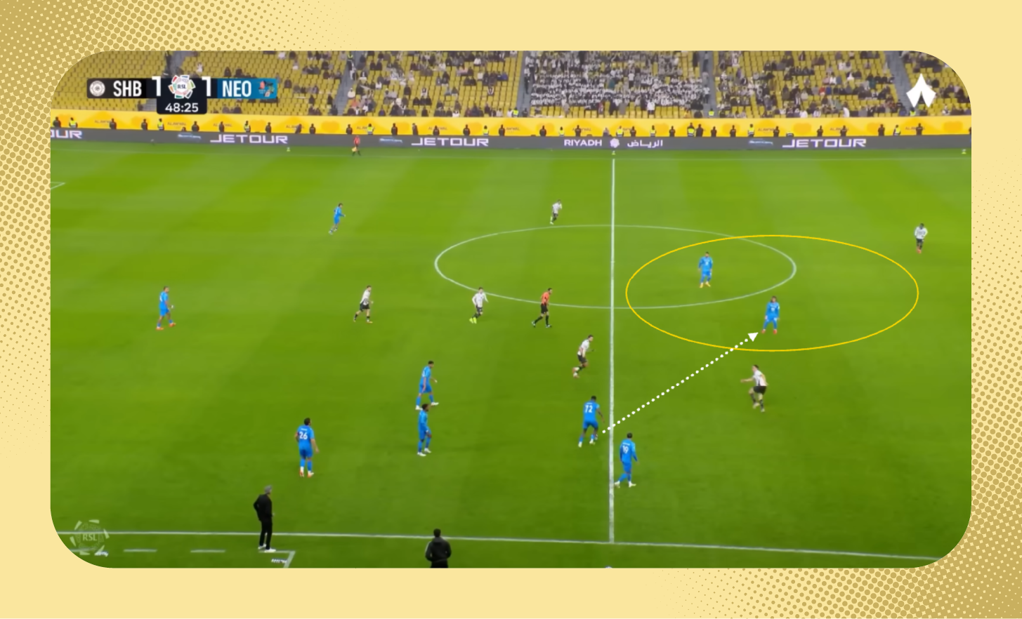 في هذه اللقطة، خلق لاعبو الشباب مثلثات تمرير بين بعضهم البعض، ثم انطلق أحدهم في أنصاف المساحات؛ لتلقي تمريرة كاراسكو داخل المنطقة.
