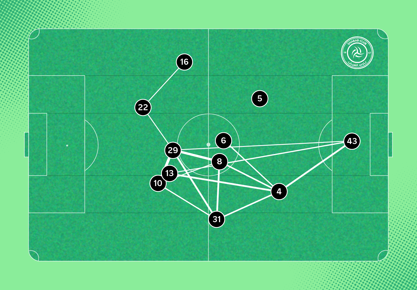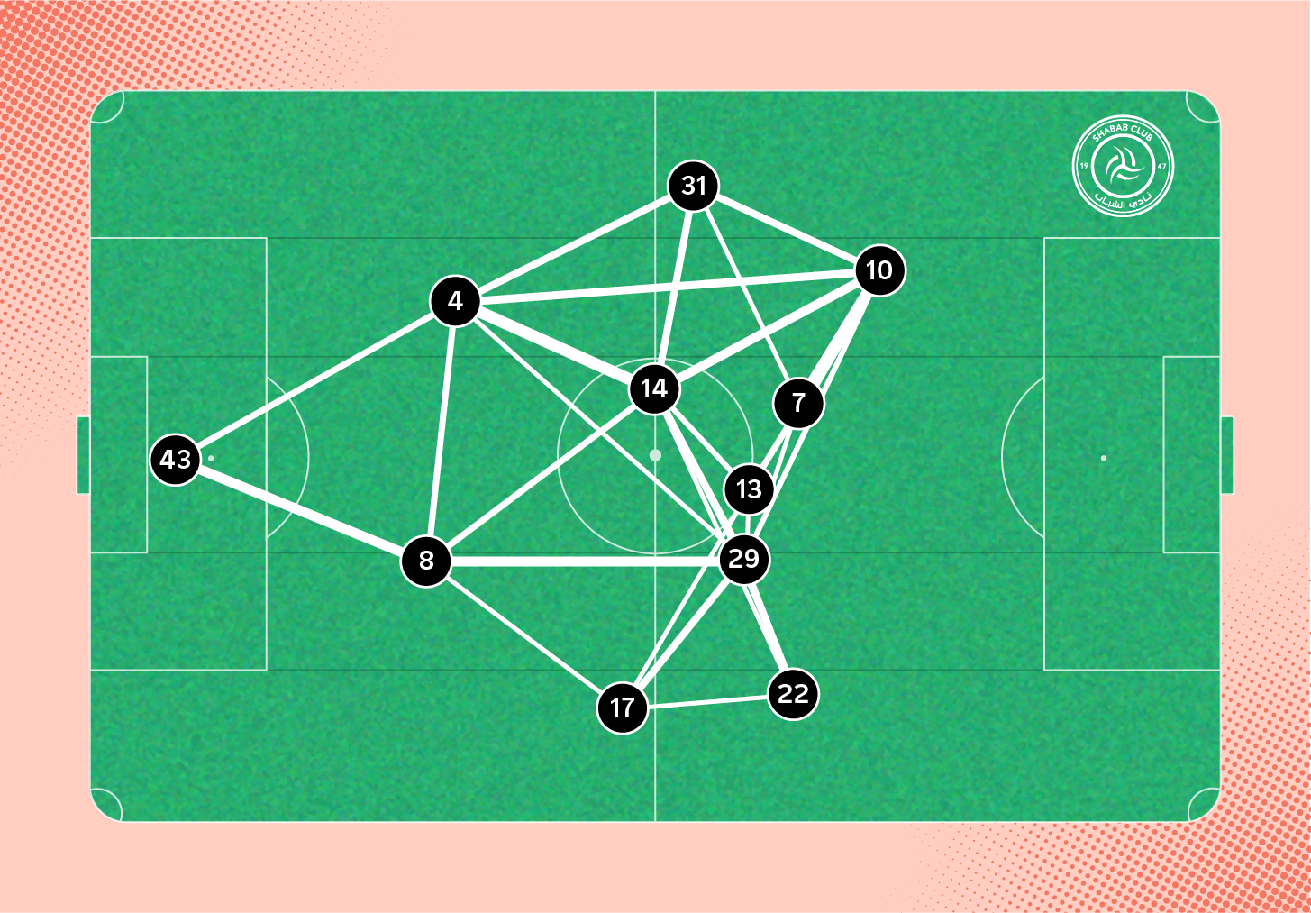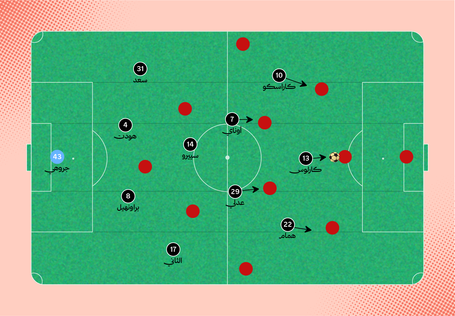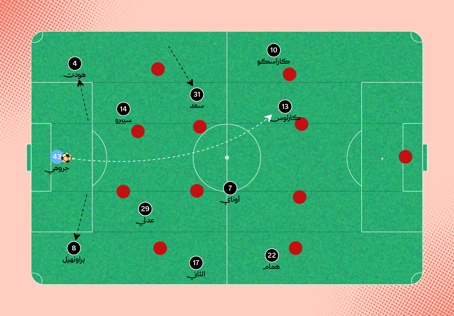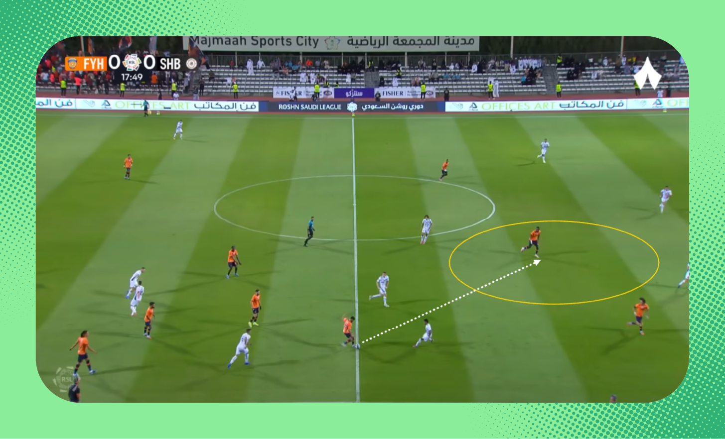 في هذه اللقطة، خلق لاعبو الشباب مثلثات تمرير بين بعضهم البعض، ثم انطلق أحدهم في أنصاف المساحات؛ لتلقي تمريرة كاراسكو داخل المنطقة.