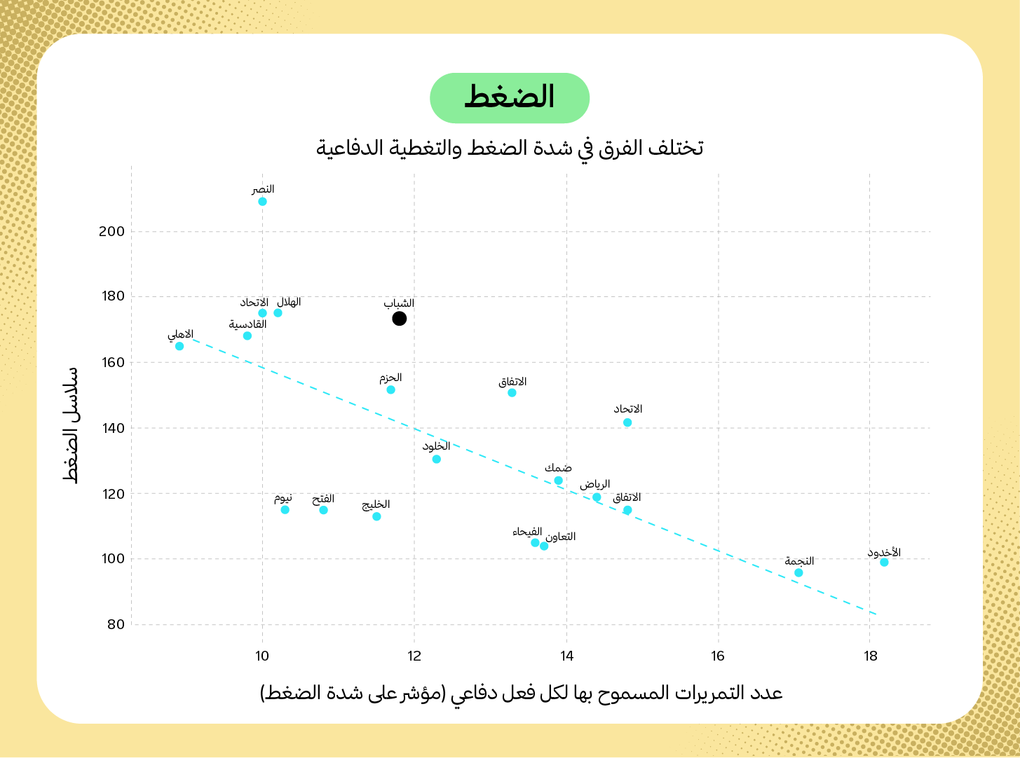 يُظهر الرسم البياني تميّز الشباب من هذا الجانب، إذ يتمتّع الفريق بأحد أعلى أرقام تسلسلات الضغط بعد فرق المقدمة: النصر، والهلال، والاتحاد. في حين يسمح للخصوم بمعدل (11.8 تمريرة) قبل البدء بالضغط.