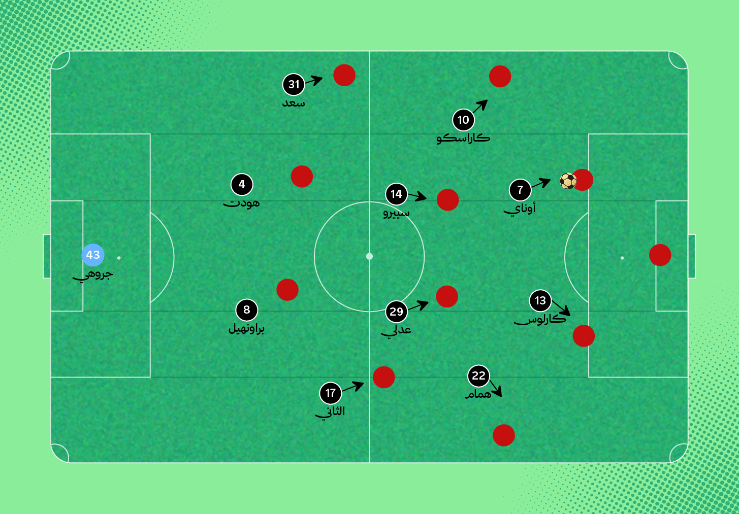 ومع لعب المدافع للكرة الطويلة، تحرك لاعب الوسط أوناي مع الظهير الأيمن مباشرةً لدعم المهاجم والجناح الأيمن؛ لكسب الكرة الثانية وتمكنوا من الحصول عليها ومهاجمة مرمى النصر.