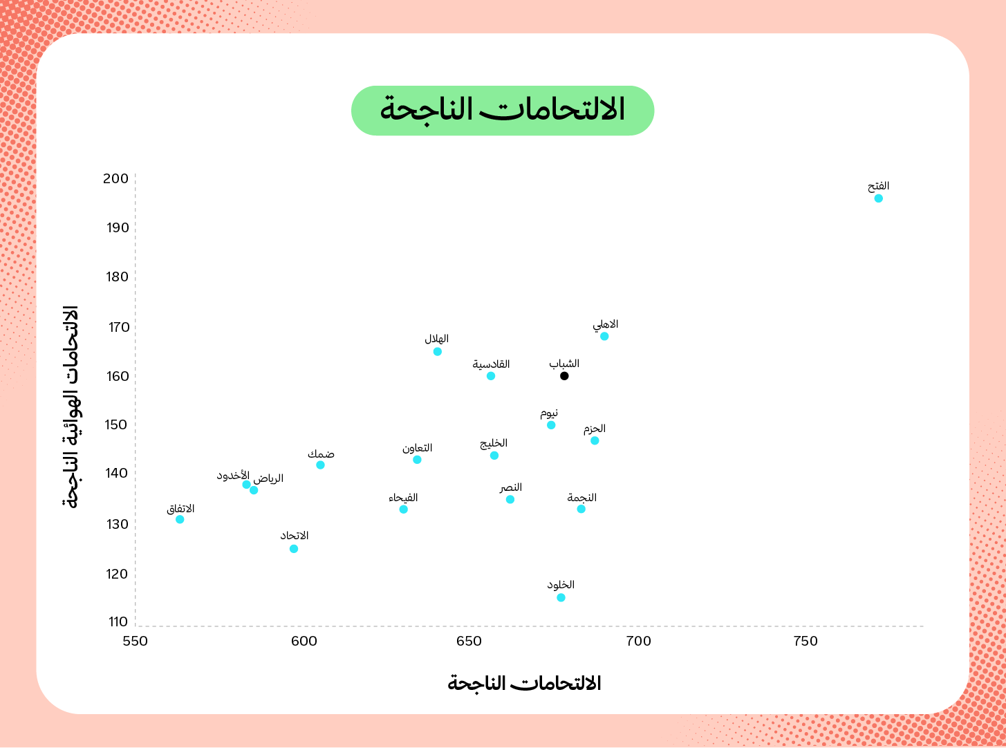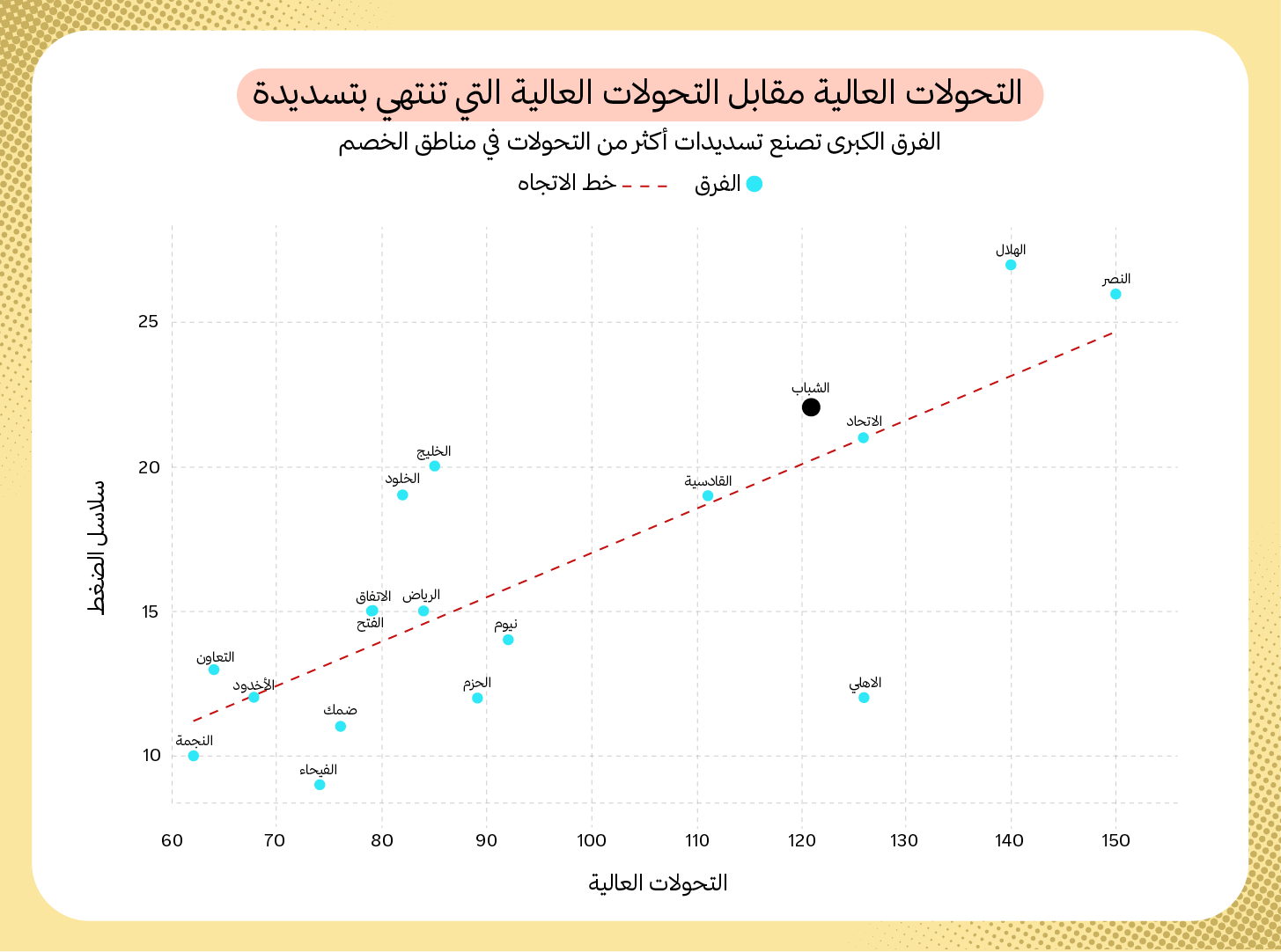 يُظهر الرسم البياني وجود الشباب كأحد أفضل الفرق في معدلات التحولات العالية والتسديدات من تلك التحولات. الأمر الذي يُوضّح جودة الضغط وقدرة الفريق على خلق فرص جيدة منها.