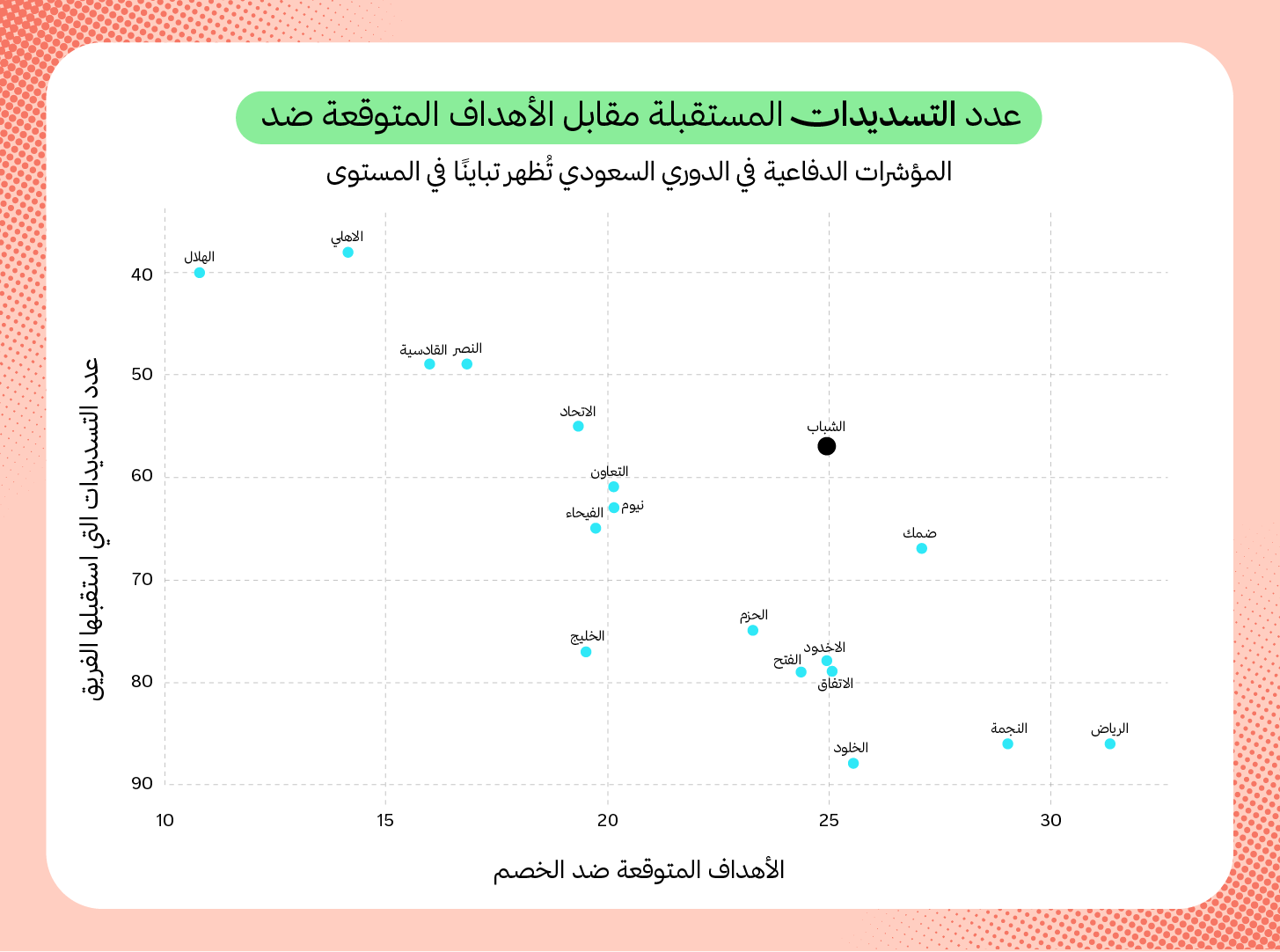 واحدة من التناقضات التي تظهر في الشباب، أنه سادس أقل الفرق تعرّضًا للتسديدات بعد فرق المقدمة: النصر، والأهلي، والهلال، والاتحاد، والقادسية وفي الوقت ذاته، هو سابع أعلى الفرق في الأهداف المتوقعة ضده. بمعنى أنّه رغم قدرة الفريق على تفادي الكثير من فرص التسديد، فإنه في الوقت نفسه يسمح بأن تكون تلك الفرص ذات جودة عالية للخصوم. الأمر الذي يُمكن تفسيره بسوء التمركز الدفاعي وافتقاد الفريق للجودة سواءً في خط الدفاع، أو في خط الوسط الدفاعي.