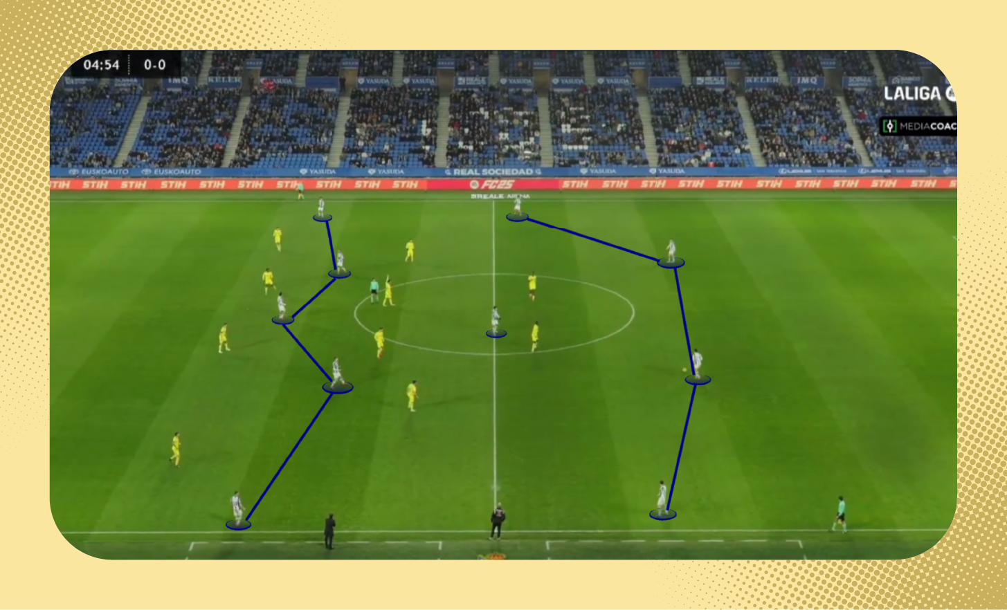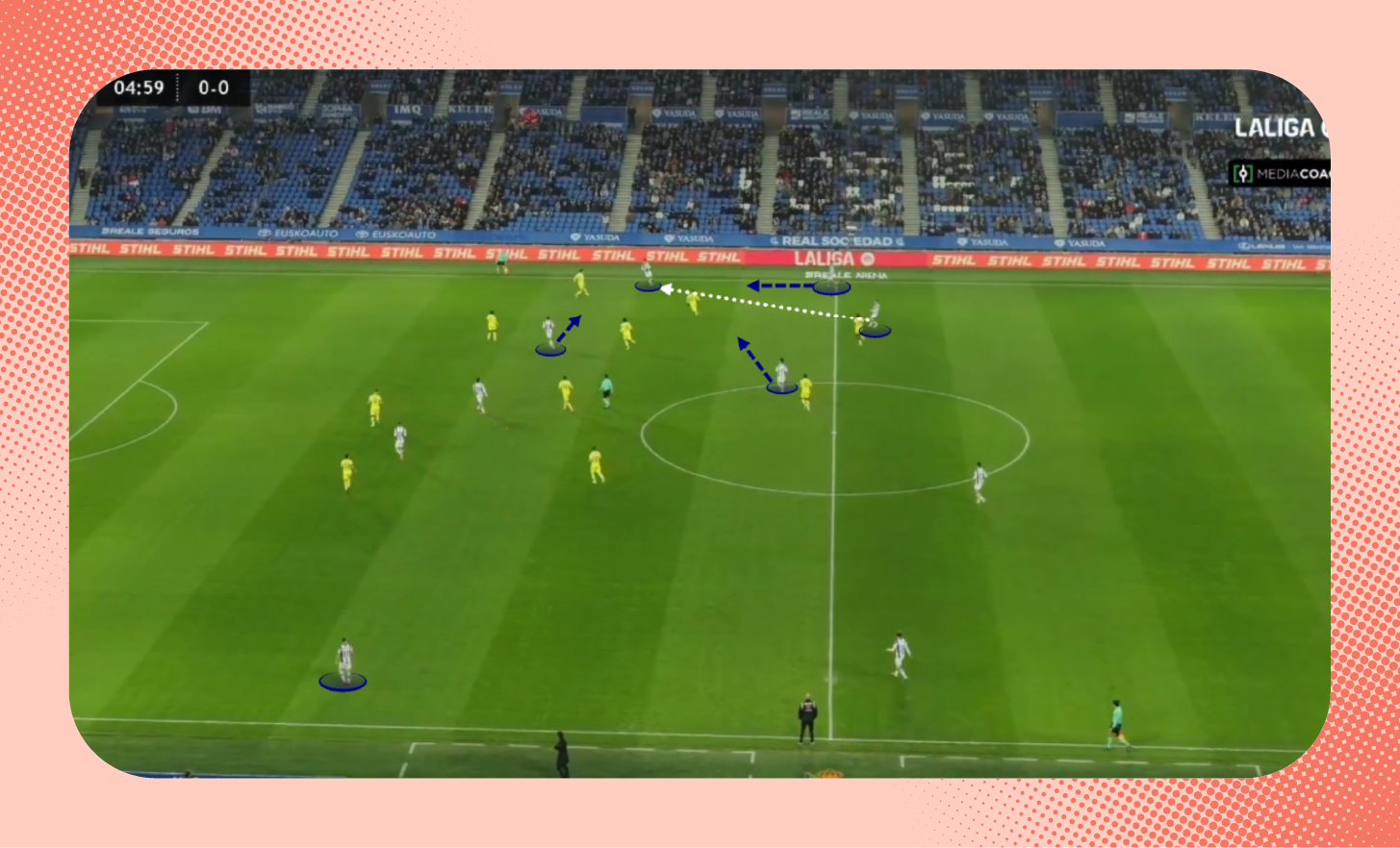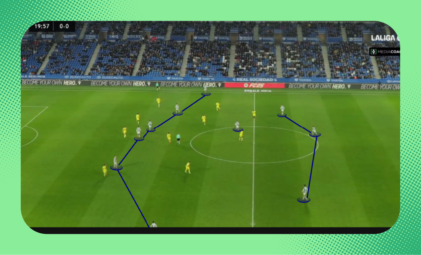 ومع تحرك الكرة للأطراف من خلال التمريرات القصيرة، يُمكنك مشاهدة بحث لاعبي سوسيداد عن الاقتراب من حامل الكرة؛ لخلق أفضلية عددية تُمكّنهم من التقدم أو استغلال تفريغ الجناح على الجهة المقابلة لتغيير اتجاه اللعب.