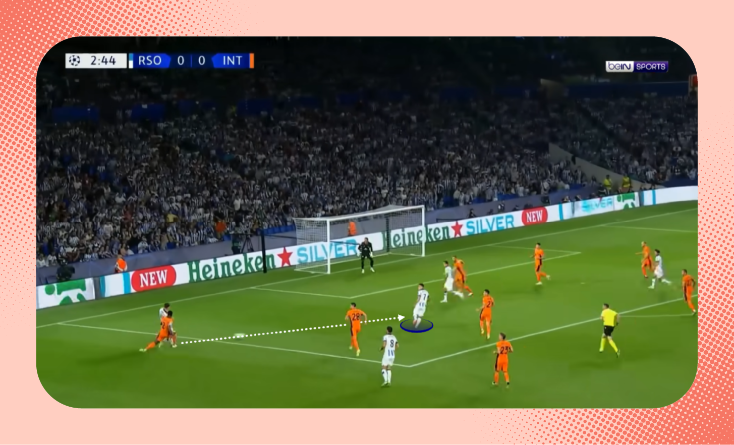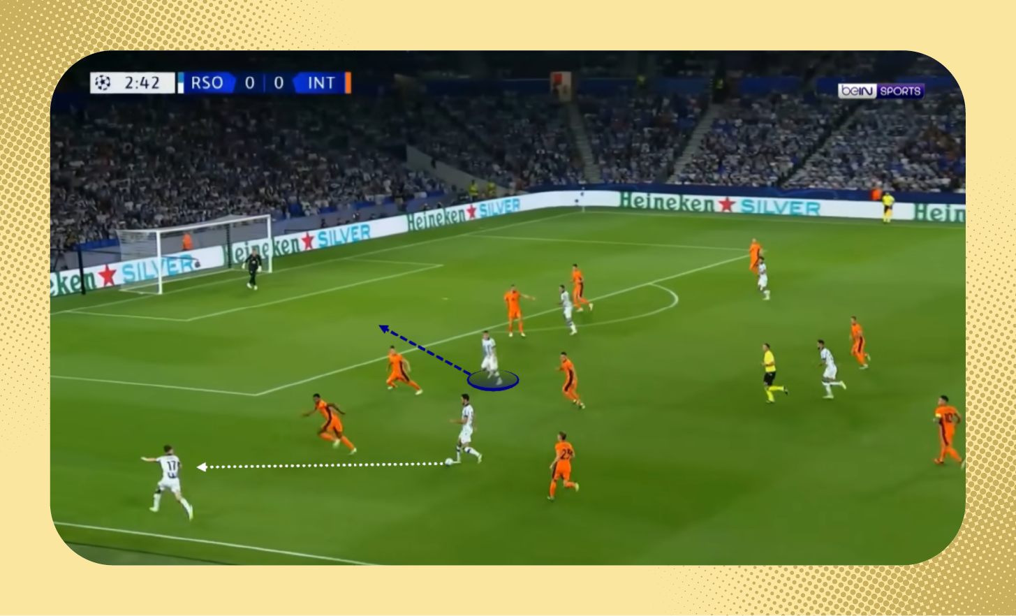 في هذه اللقطة، نشاهد تحرك الظهير على الأطراف مع تحرك لاعب وسط سوسيداد في أنصاف المساحات.