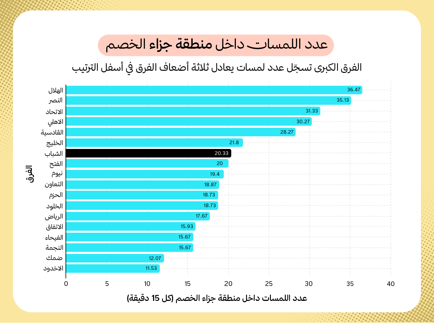 وما يوضّح بحث ألقواسيل عن خلق حضور جيّد داخل منطقة الجزاء، هو كون الشباب أحد أعلى فرق الدوري بمعدل اللمسات داخل منطقة جزاء الخصم (20.3 لمسة/90 دقيقة).