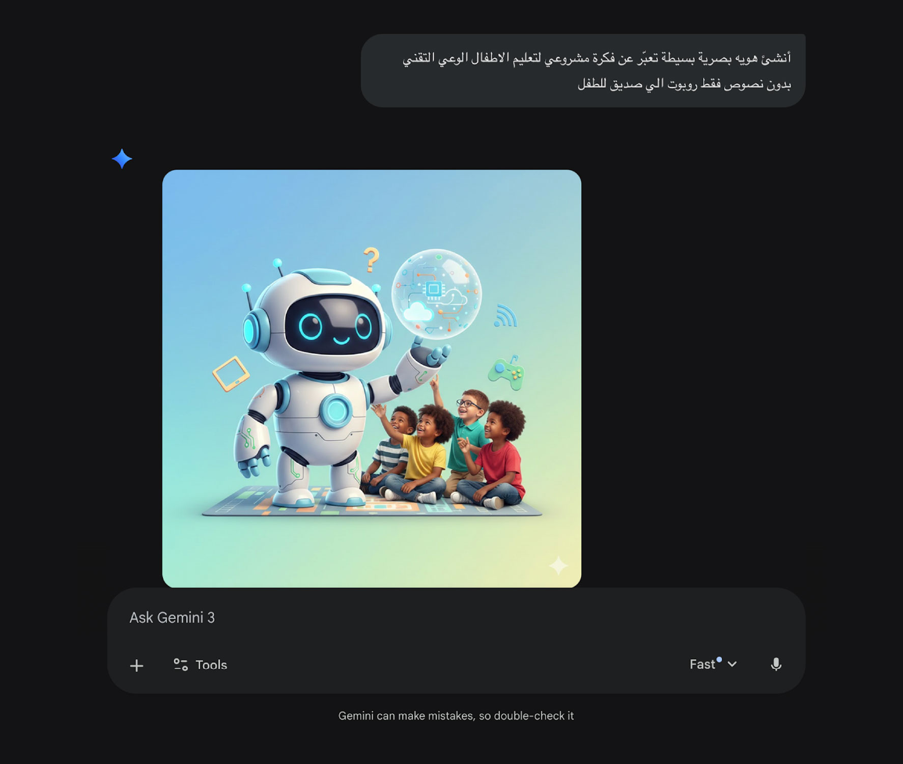 اكتب الأمر التالي: أنشئ هوية بصرية بسيطة تعبِّر عن فكرة مشروعي لتعليم الأطفال الوعي التقني دون نصوص، فقط روبوت آلي صديق للطفل.
