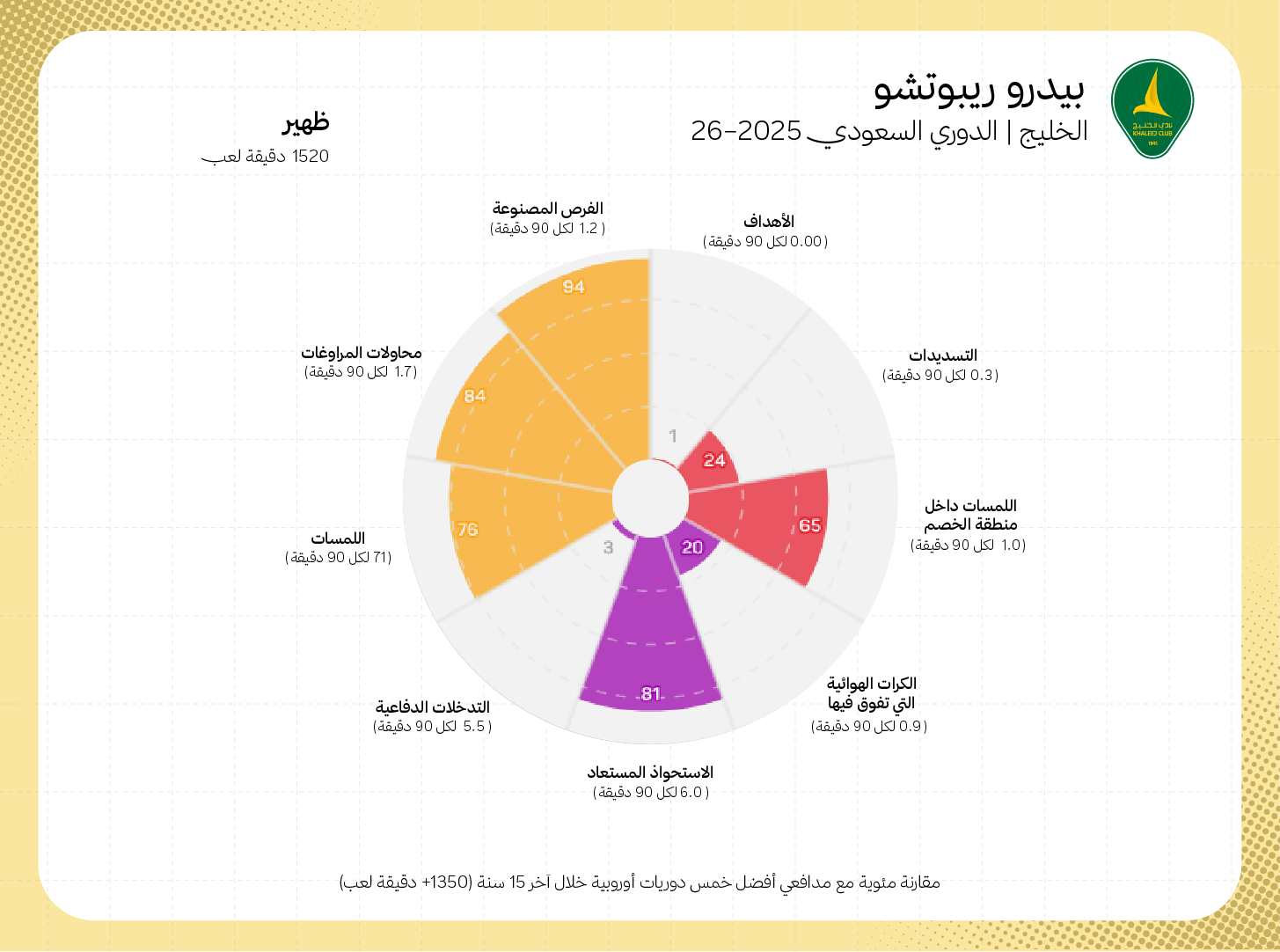 يظهر اسم بيدرو ريبوتشو ظهير الخليج بوصفه أحد أفضل اللاعبين في مركزه خلقًا للفرص بـ 21 فرصةً، صنع من خلالها (5 أهداف). كما أنه ثاني أعلى اللاعبين حملًا للكرة (بمعدل 6.87)، وثالث أعلى اللاعبين في التمريرات المتوقعة من اللعب المفتوح (1.9 تمريرة)، وخامس أعلى اللاعبين في الكرات العرضية الصحيحة من اللعب المفتوح بـ 8 كرات عرضية صحيحة. إضافةً إلى أنه ضمن أعلى المدافعين بصفةٍ عامة في معدلات استعادة الكرة (6.0).