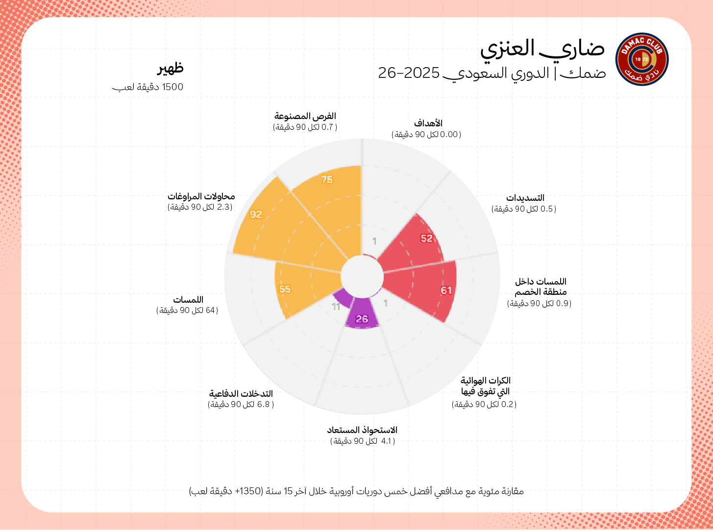 وفي الظهير الأيسر، يبرز اسم ضاري العنزي ظهير ضمك الأيسر كونه أحد أفضل الأسماء السعودية في هذا المركز على الإطلاق، فبالرغم من أداء فريقه السيئ في المجمل، فإن ضاري برز كثيرًا وبصورةٍ ملفتة. حيث جاء أعلى اللاعبين في مركزه في المراوغات الناجحة (بمعدل 1.2)، وثاني أعلى اللاعبين في حمل الكرة والتقدم بها (بمعدل 6.78)، وأحد أعلى اللاعبين خلقًا للفرص بـ 12 فرصةً.