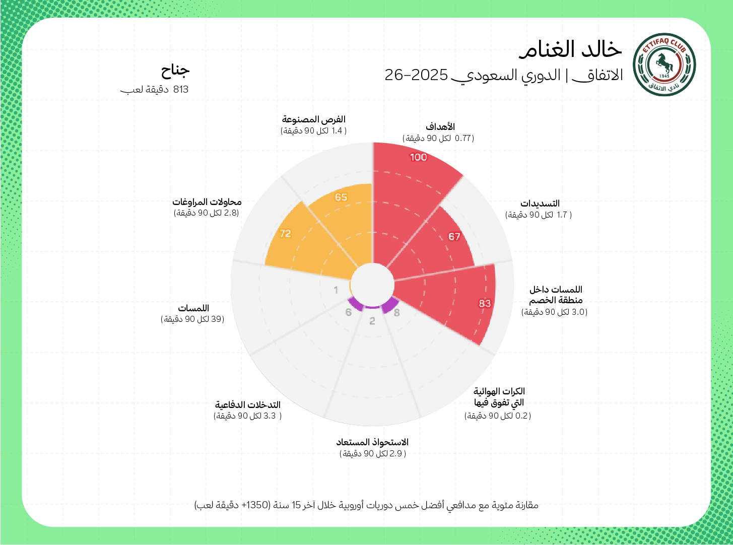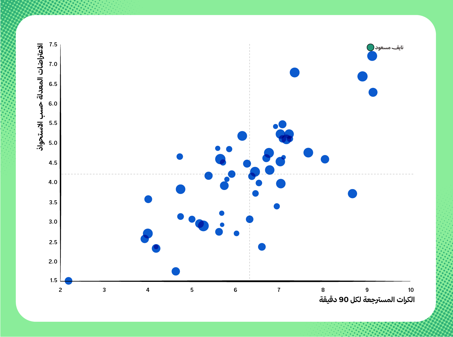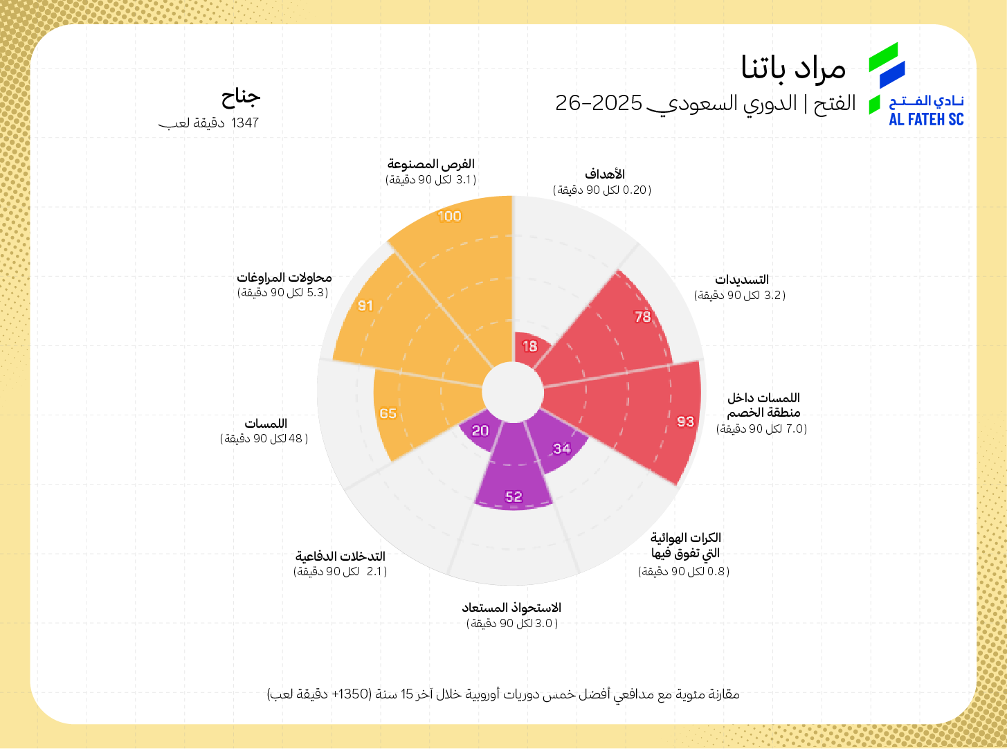 يبرز اسم نايف مسعود لاعب وسط نادي الفتح، إذ أنه أحد أفضل اللاعبين السعوديين في مركزه في معدلات العمل الدفاعي (9.8).